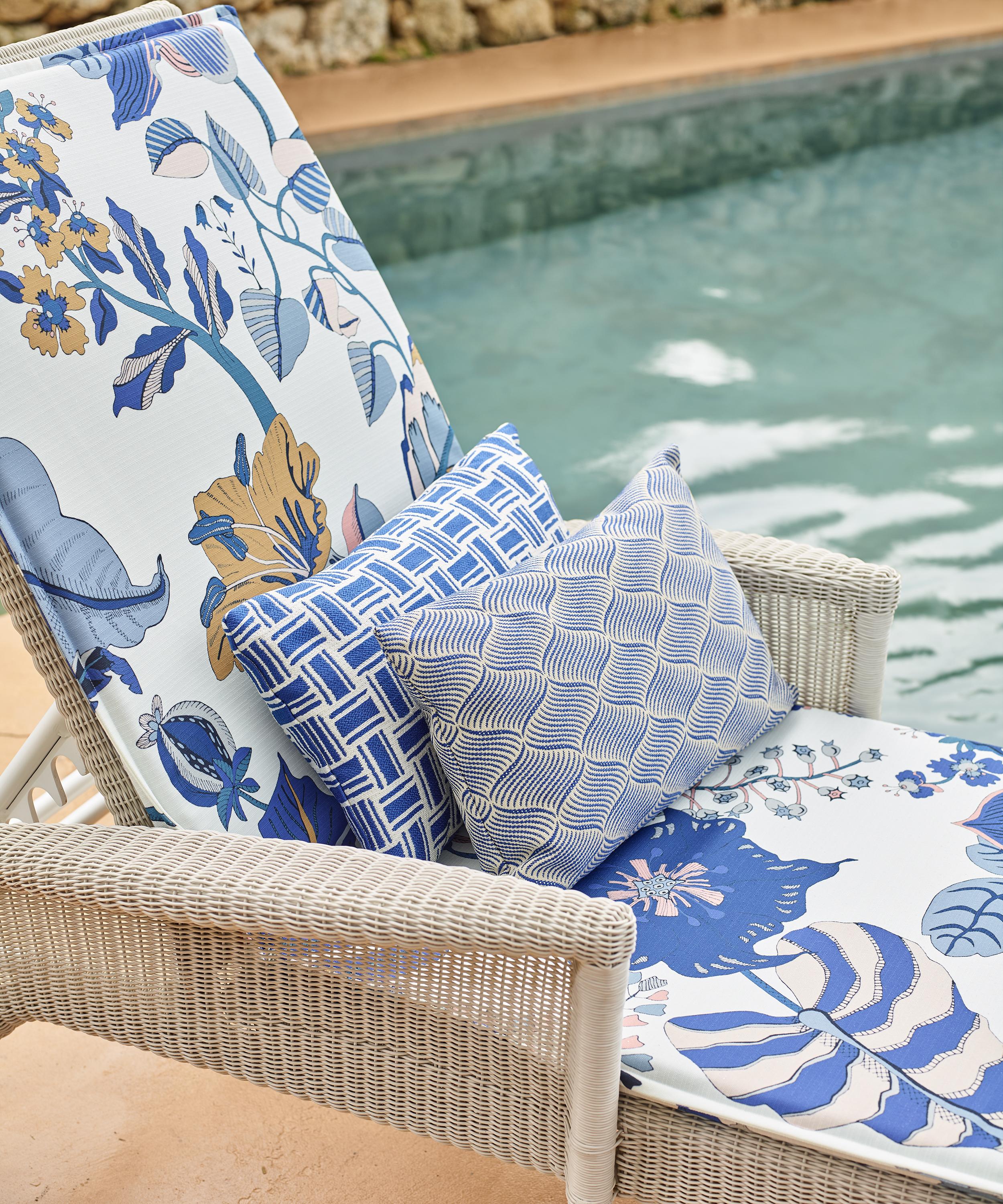 Developed from a silk jacquard in archive, the design is translated into a tone-on-tone, yarn-dyed mid-scale geometric that’s expertly woven onto Westbrook – a beautiful textural fabric, made in Italy using leading performance fibres for outdoor use. The furnishing fabric has superior abrasion, light fastness and water resistance alongside a rich textural effect with excellent depth of colour.