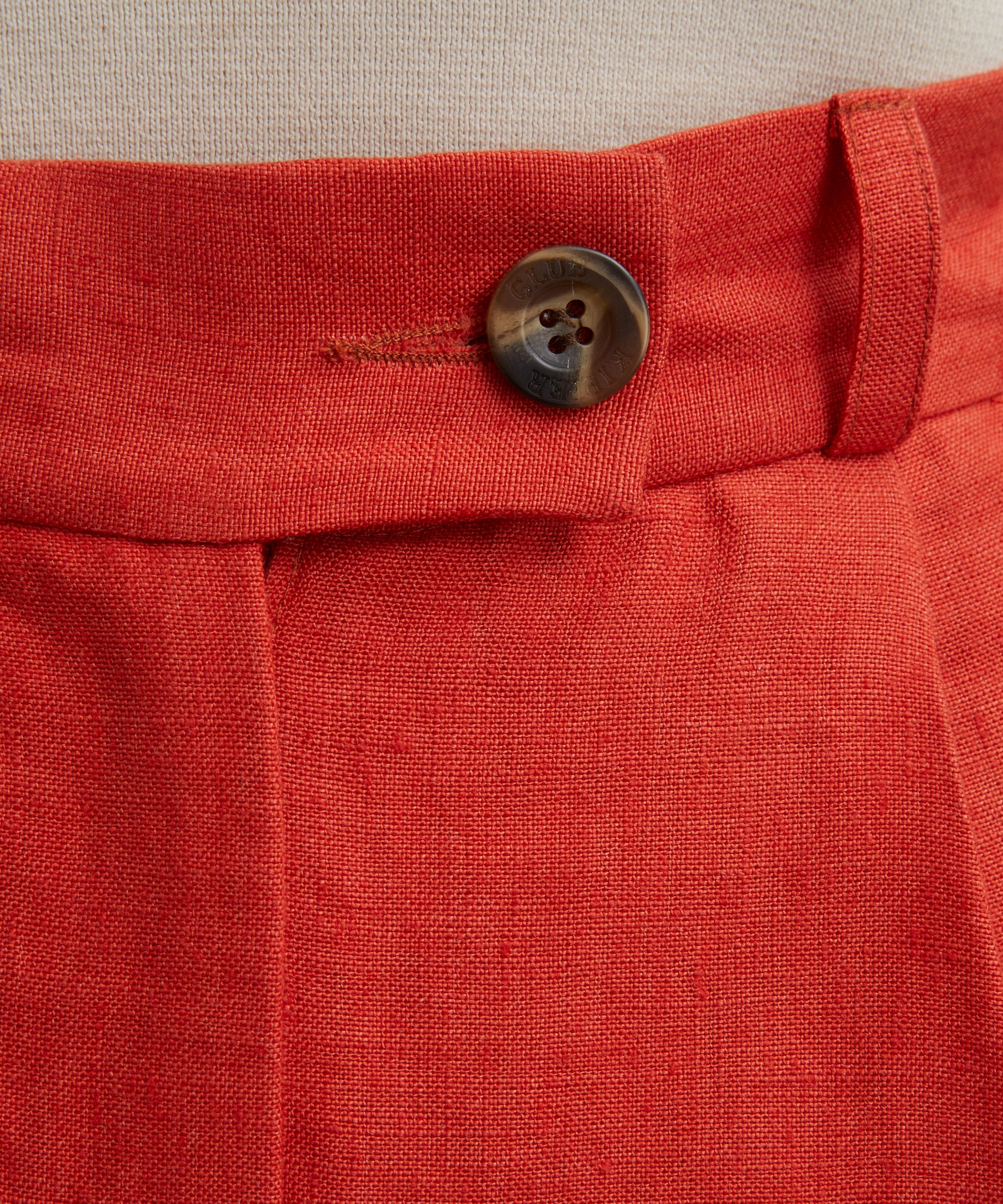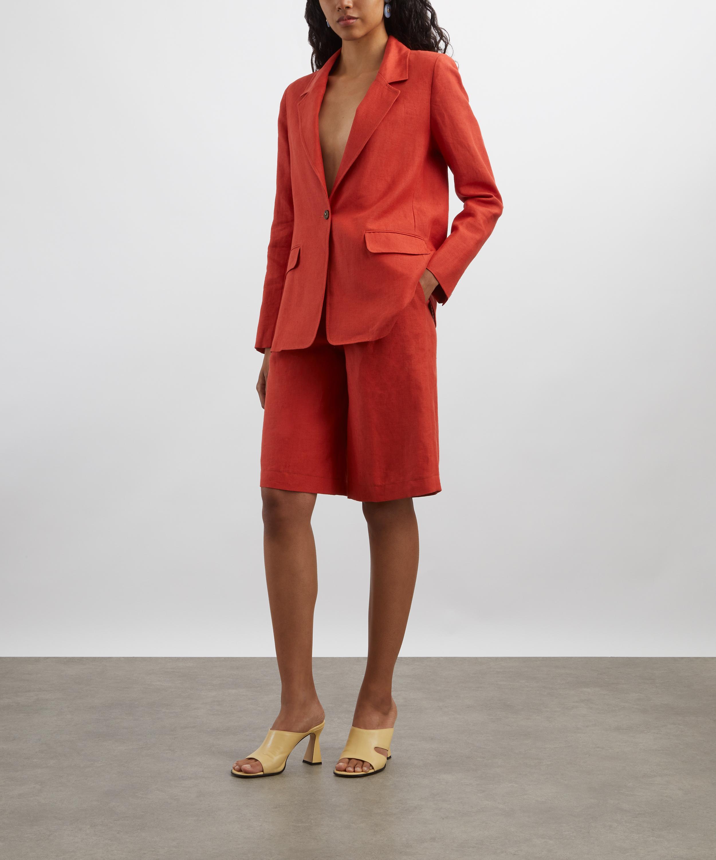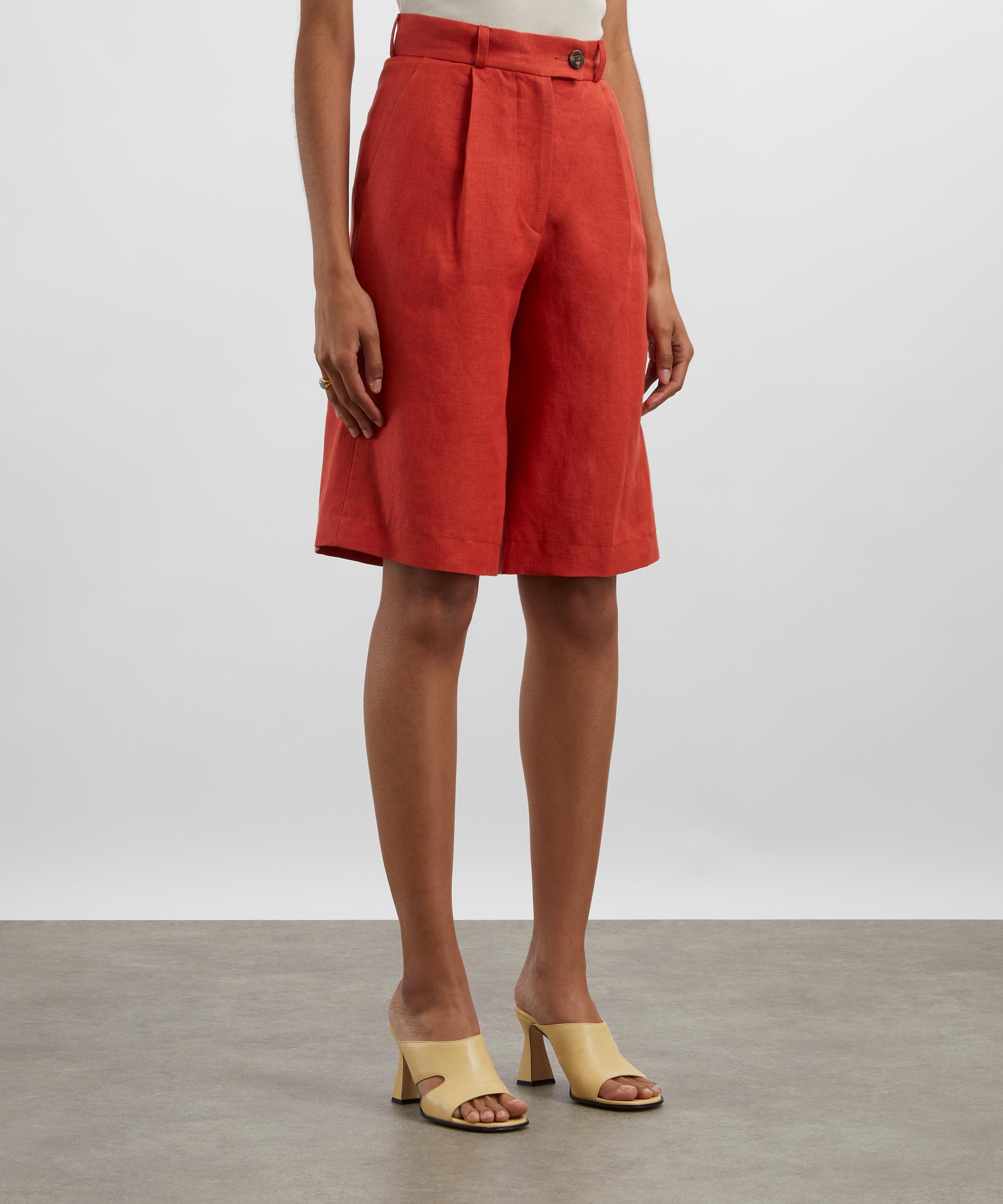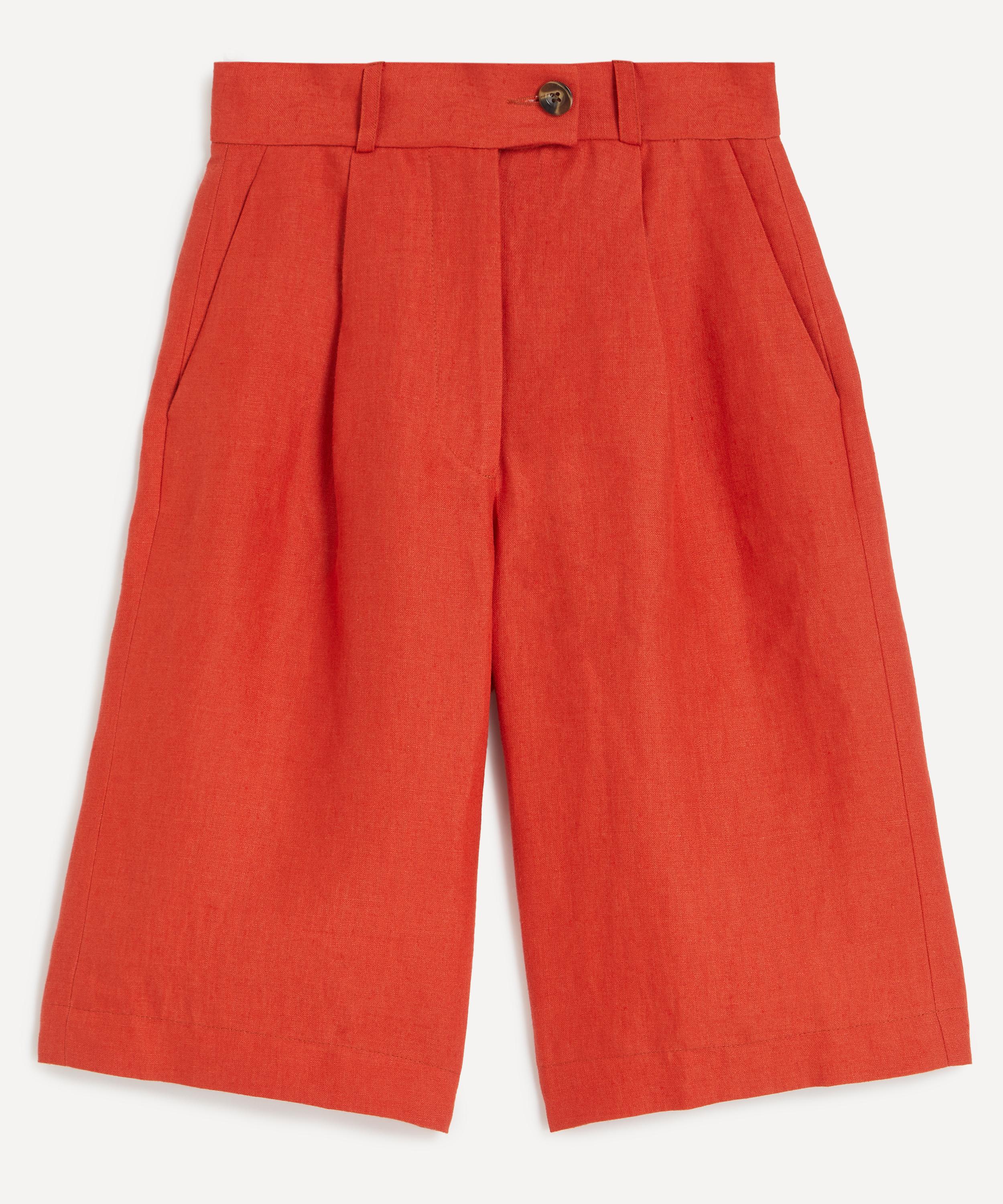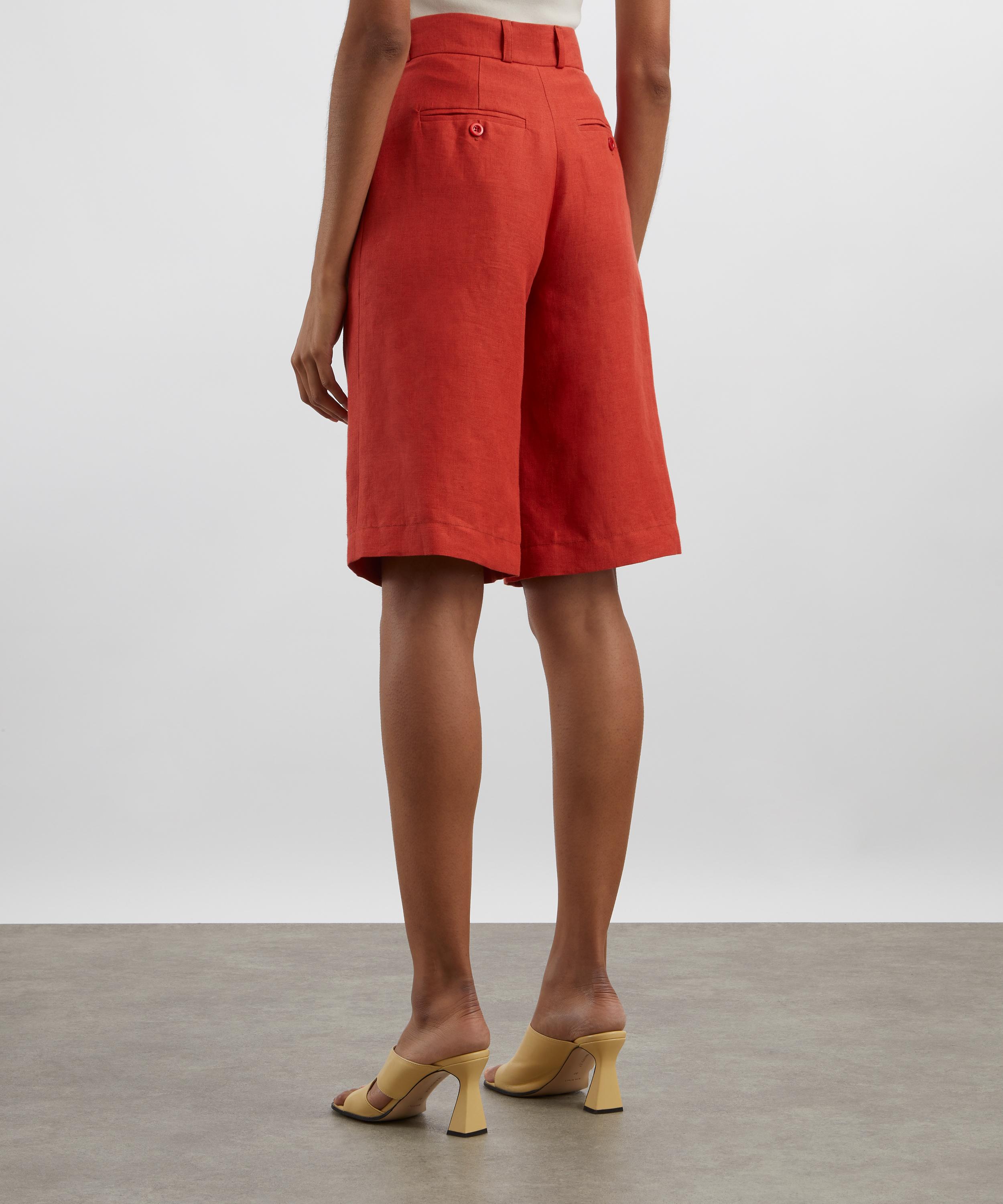 Made in London, these longline shorts are crafted from textured soft linen in a deep orange hue. Designed as a fresh staple for both workwear and holiday wardrobes, they feature an extended waistband, tailored front pleats, and multiple side and back pockets. Style them with the matching Paloma Blazer for a perfectly coordinated look.