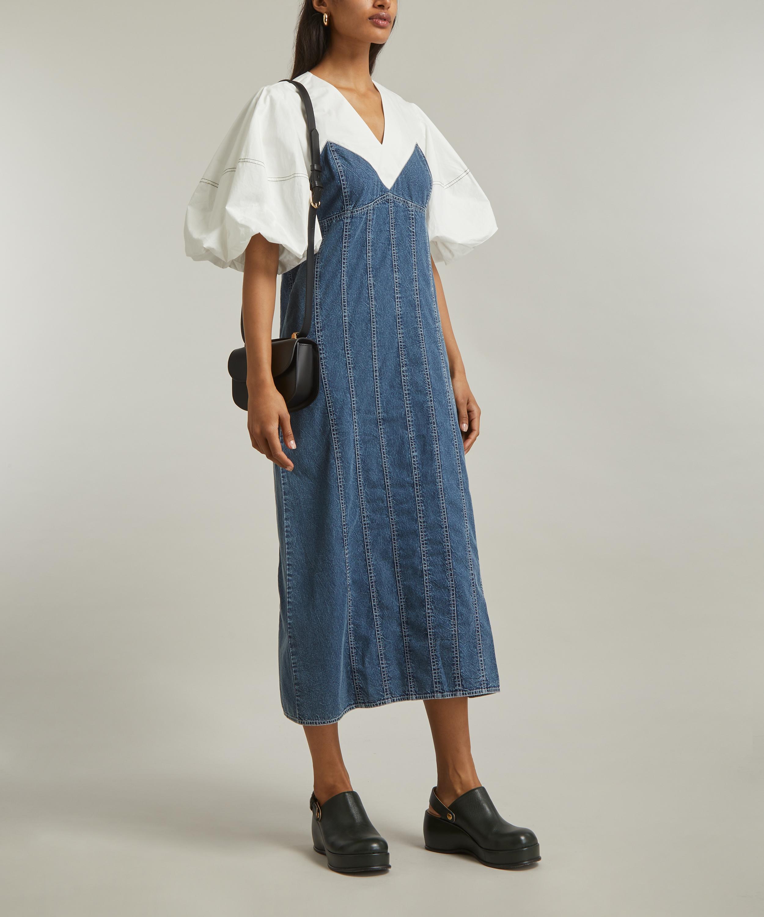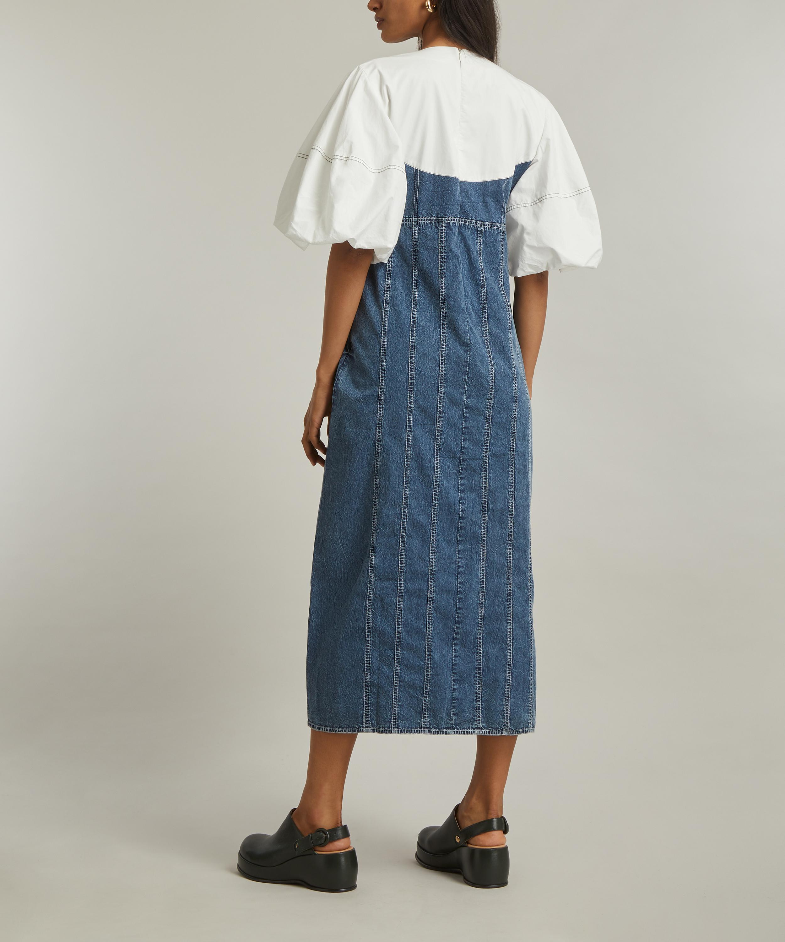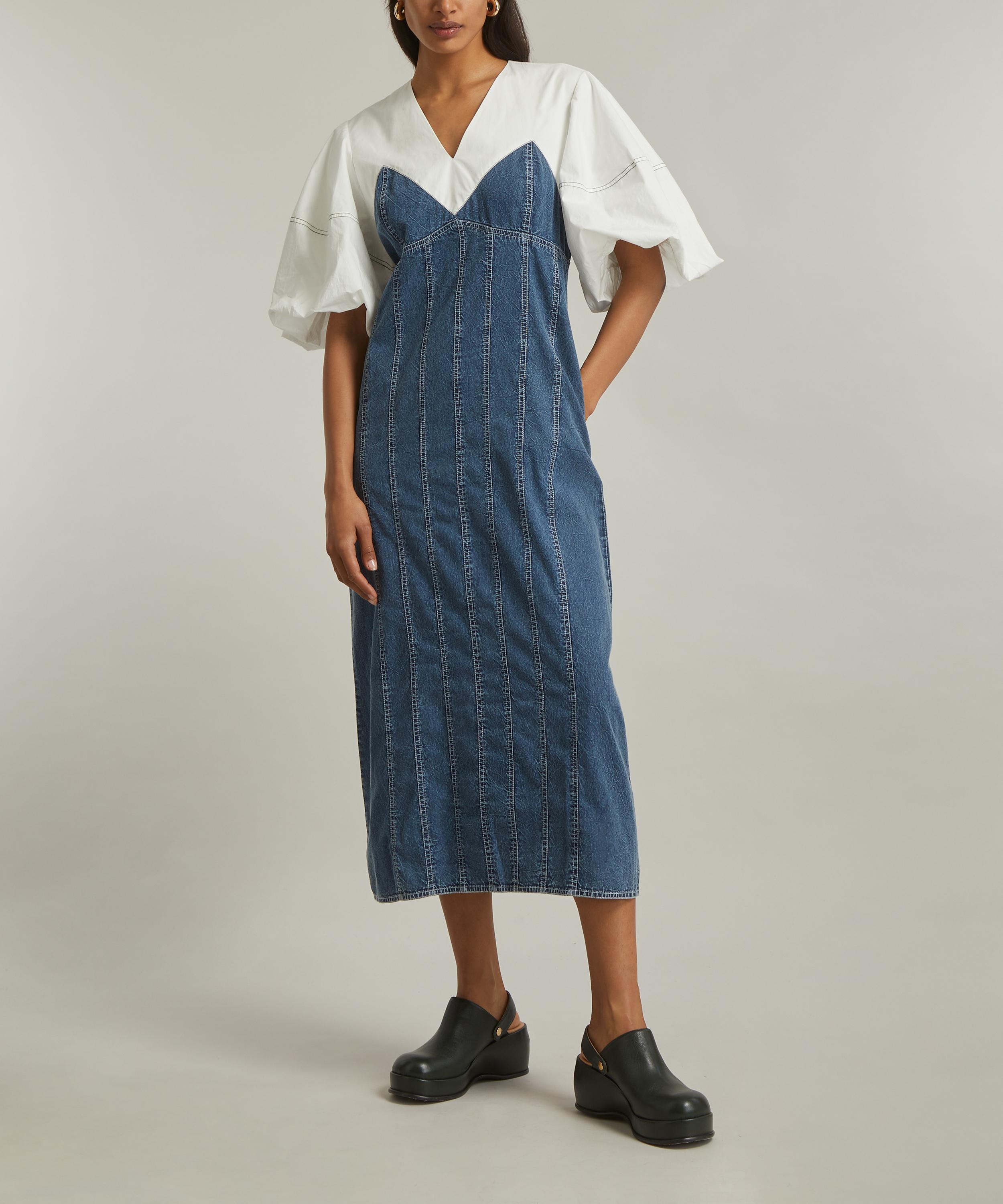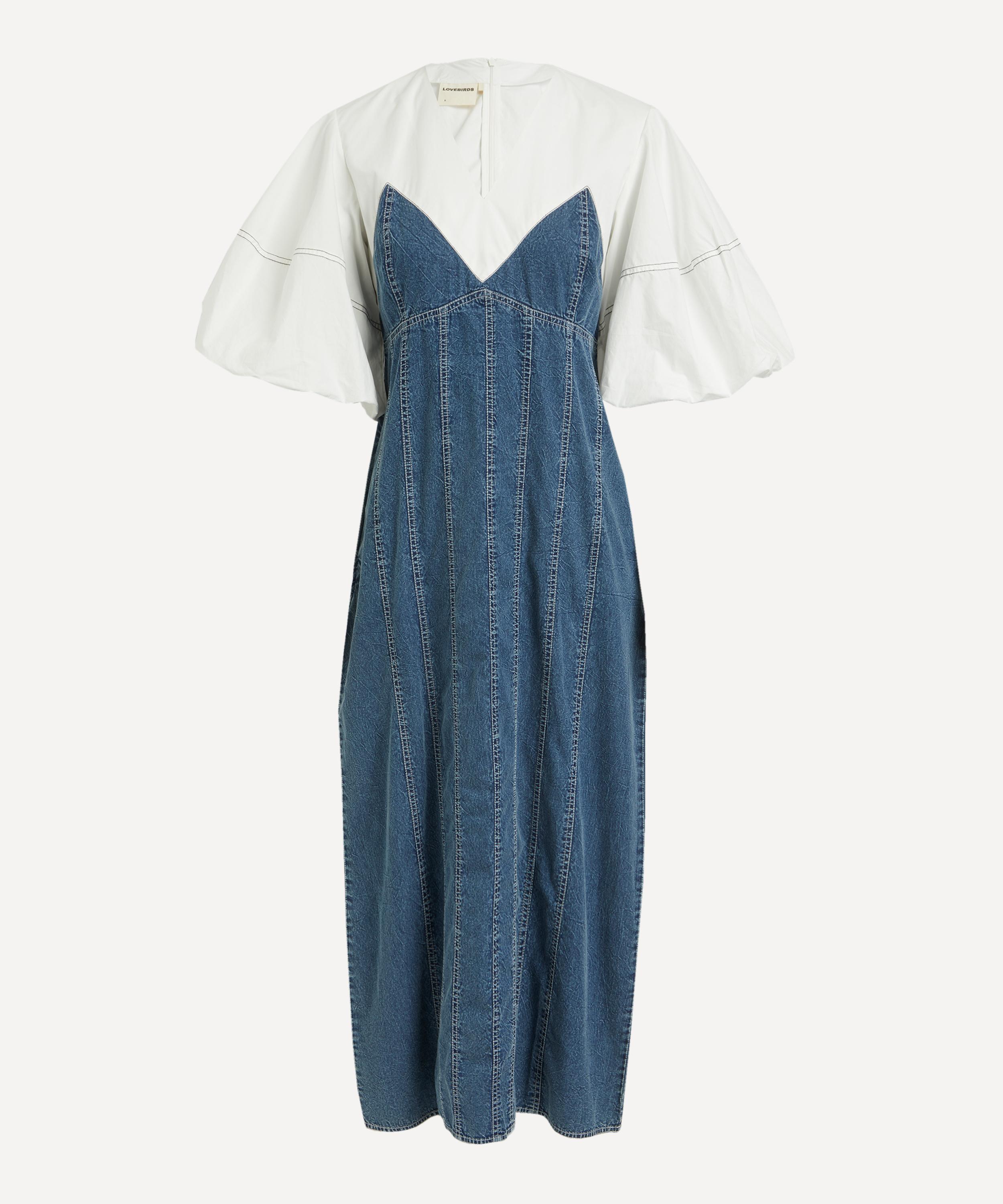 Update your eclectic wardrobe collection with Lovebirds’s playful Panelled Denim Midi Dress. Echoing a subtle vintage aesthetic, this dress is crafted from cotton denim, cut to a straight mid-length, featuring a panelled skirt and puff sleeves with cotton poplin panelling. Complete with two side slip pockets and a concealed zip fastening at the back, this dress is wearable for work, or weekends.
