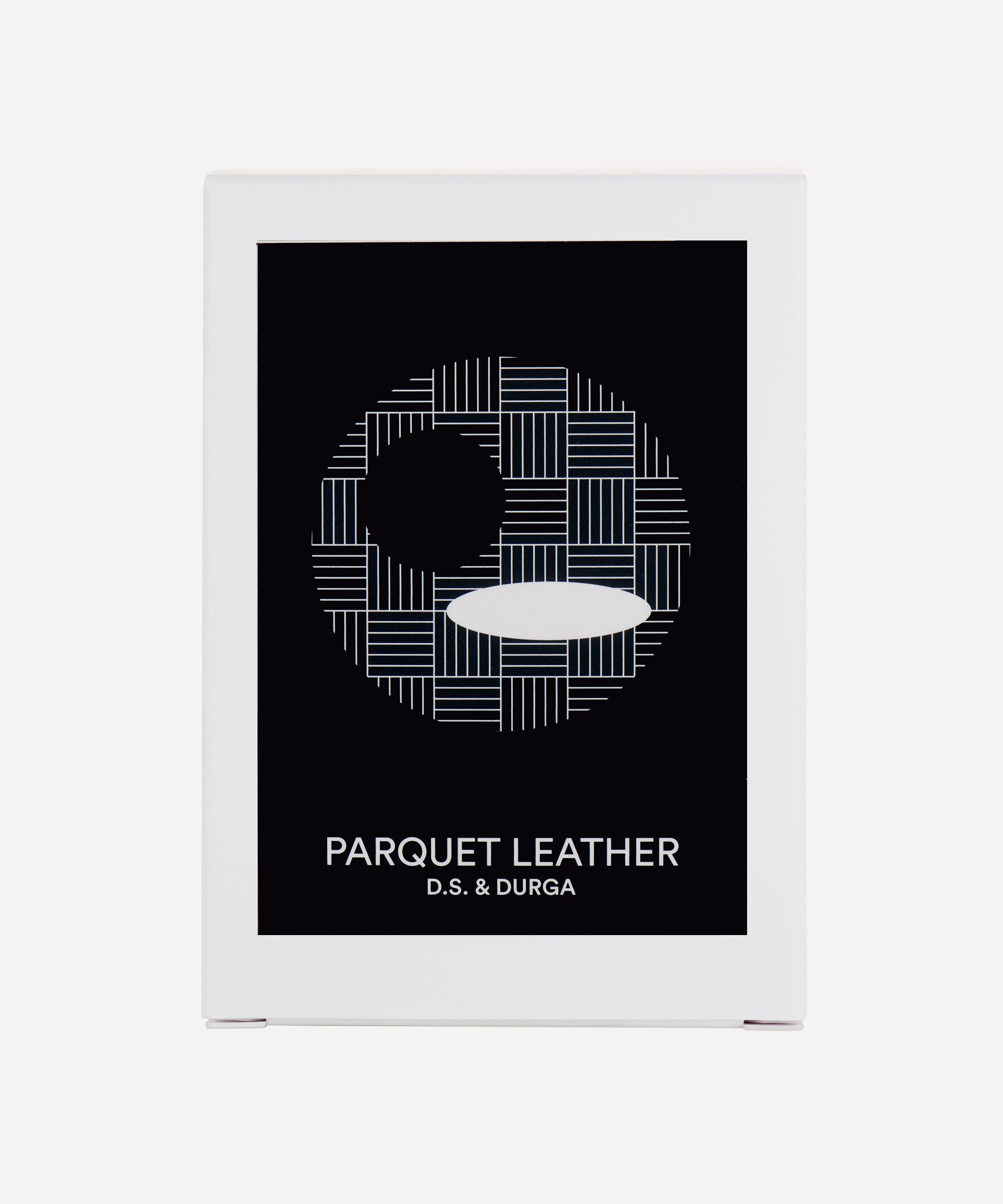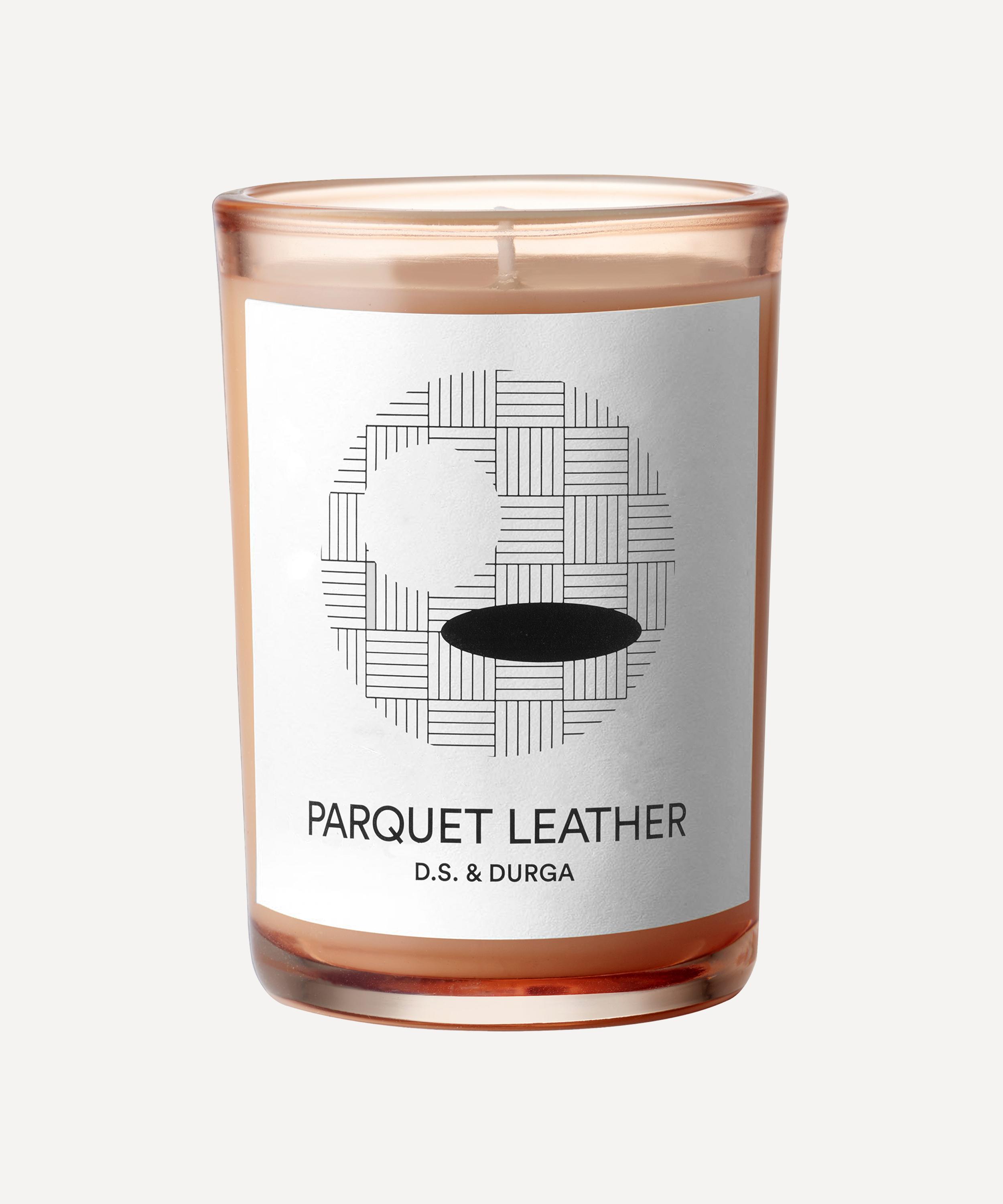 D.S. & Durga's Parquet Leather scented candle emits a nostalgic fragrance, reminiscent of basketball courts in old gymnasiums with red oak flooring and hanging peach baskets.