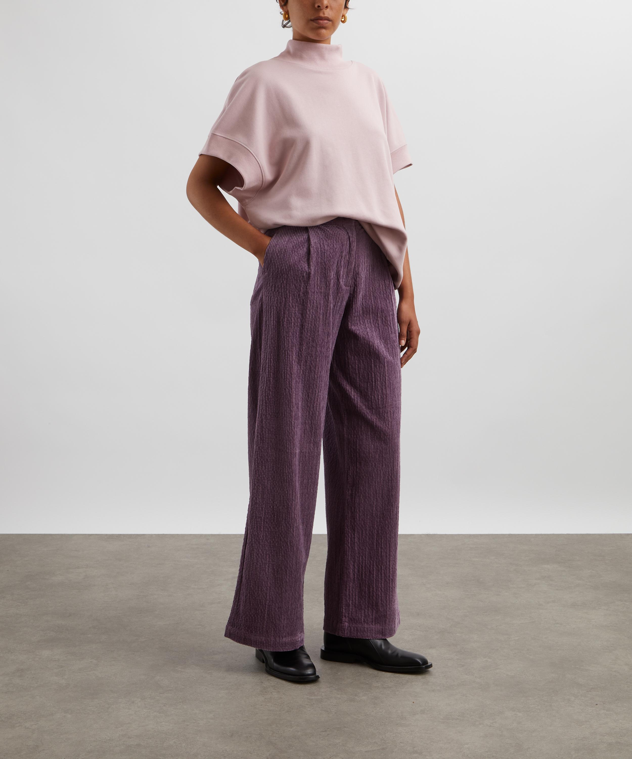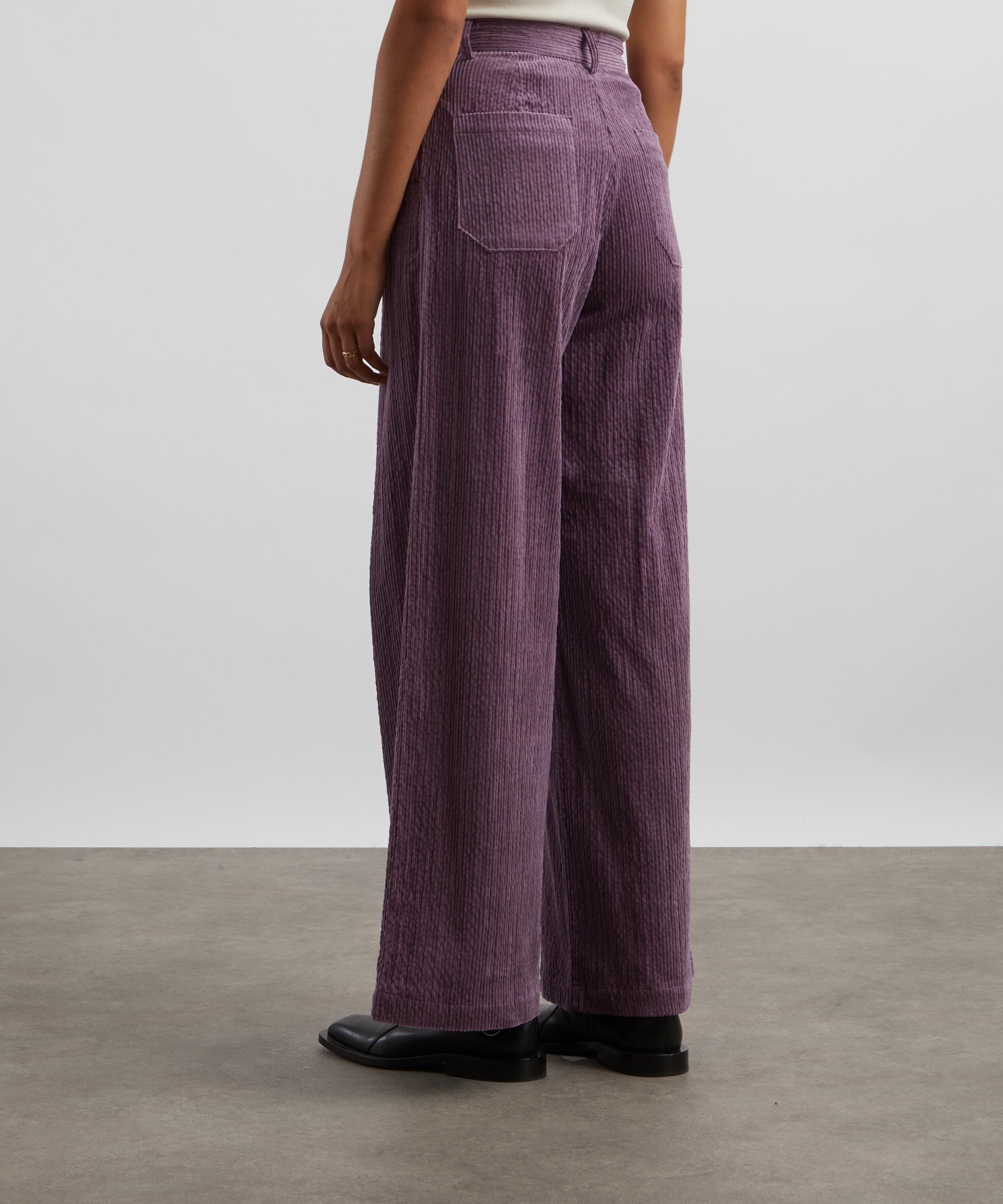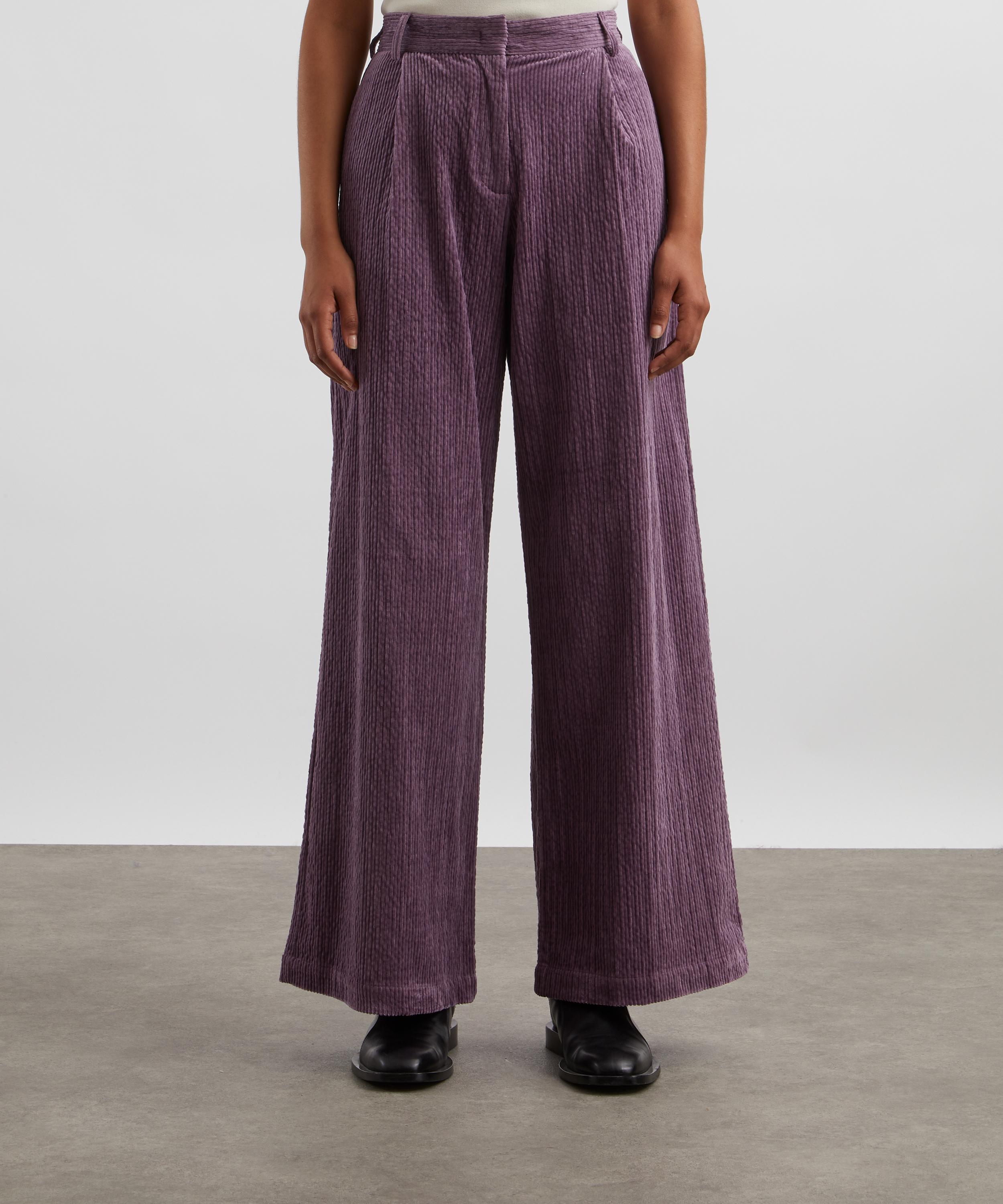 Crafted from velvety smooth corduroy fabric, these high-waisted trousers have a flared, loose-fitting leg. Inspired by masculine tailoring, this purple pair is complete with knife pleats at the front.