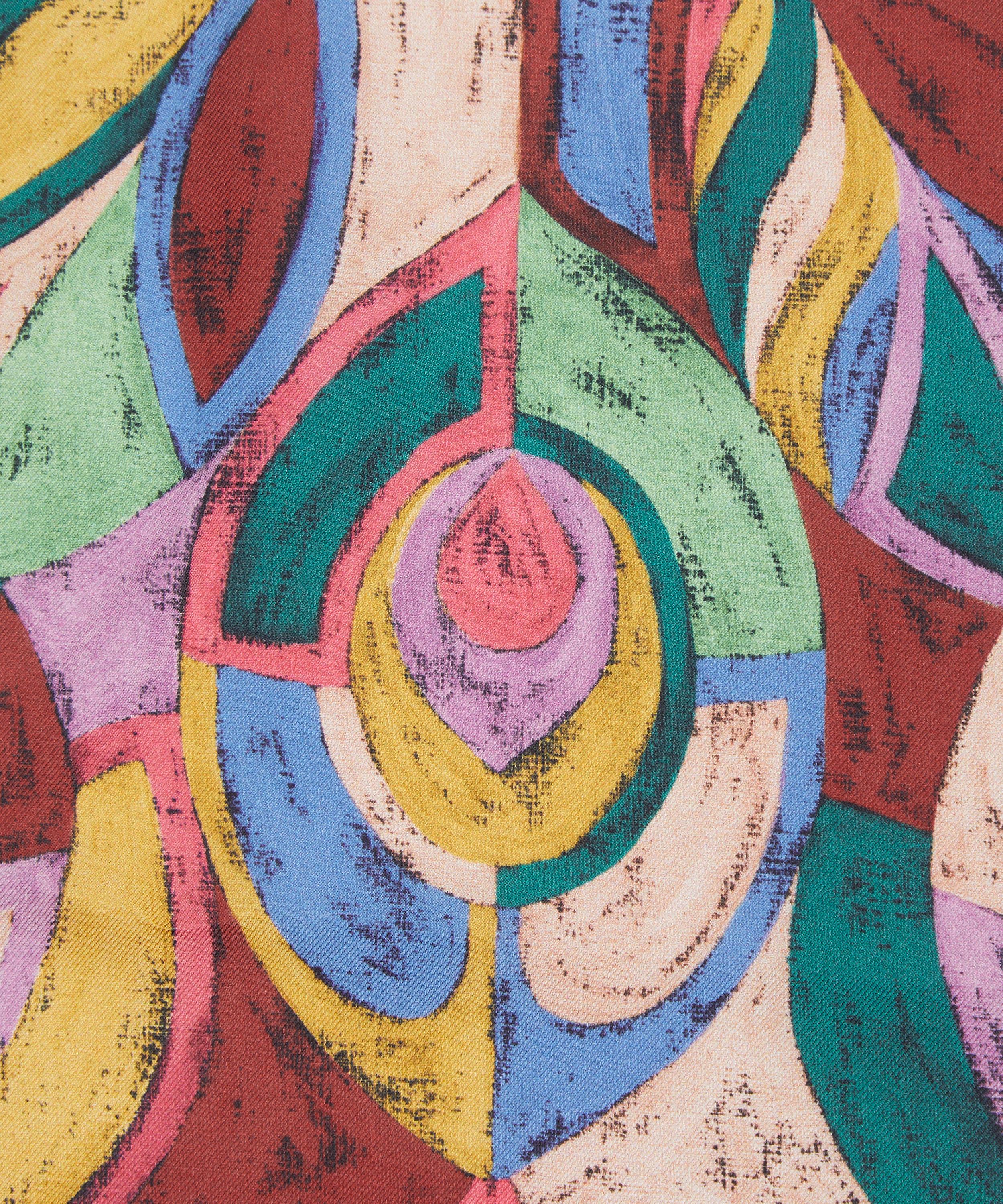 Pastel Peacock was inspired by a pendant design discovered in a book of Liberty jewellery illustrations originating from the turn of the 20th century. Featuring a simplified rendition of a peacock feather motif, the pencil-drawn sketch was reimagined with richly textured, acrylic paint. Flowing both vertically and horizontally across the fabric, this graphic pattern is imbued with a sense of alternating movement. This print is part of the Craftsmanship narrative of this collection, exploring the creative process from within the Liberty archive, from print impressions and embroidered studies, to ceramics, jewellery, and furniture. Uncover the origins of the designers’ musings through artworks inspired by their sketchbooks and prototypes.