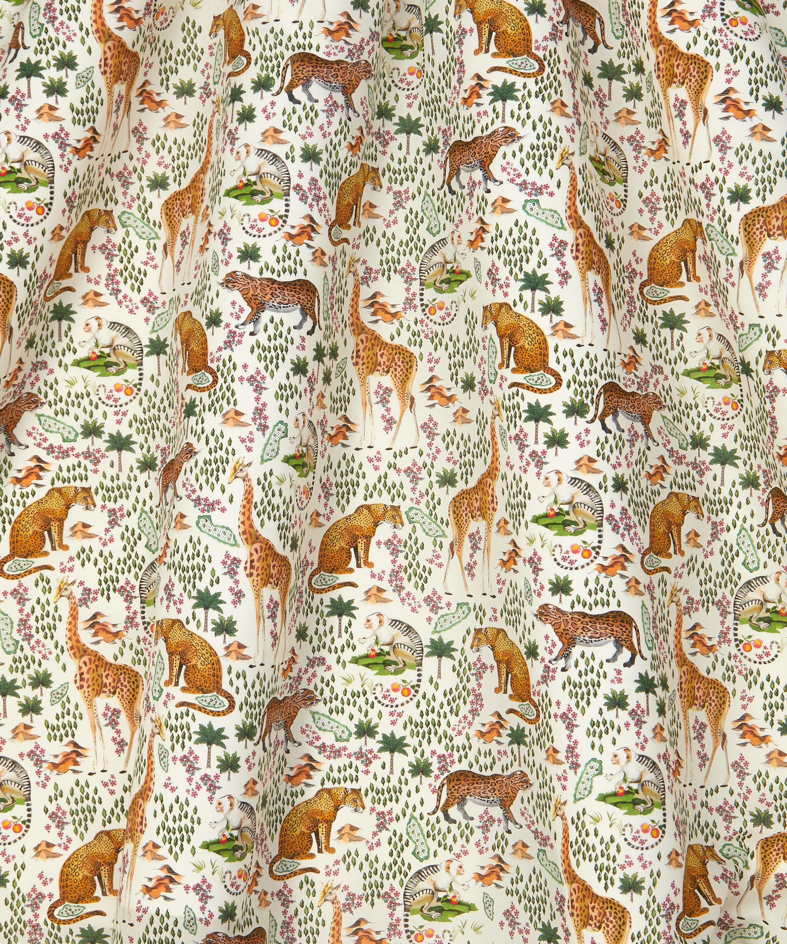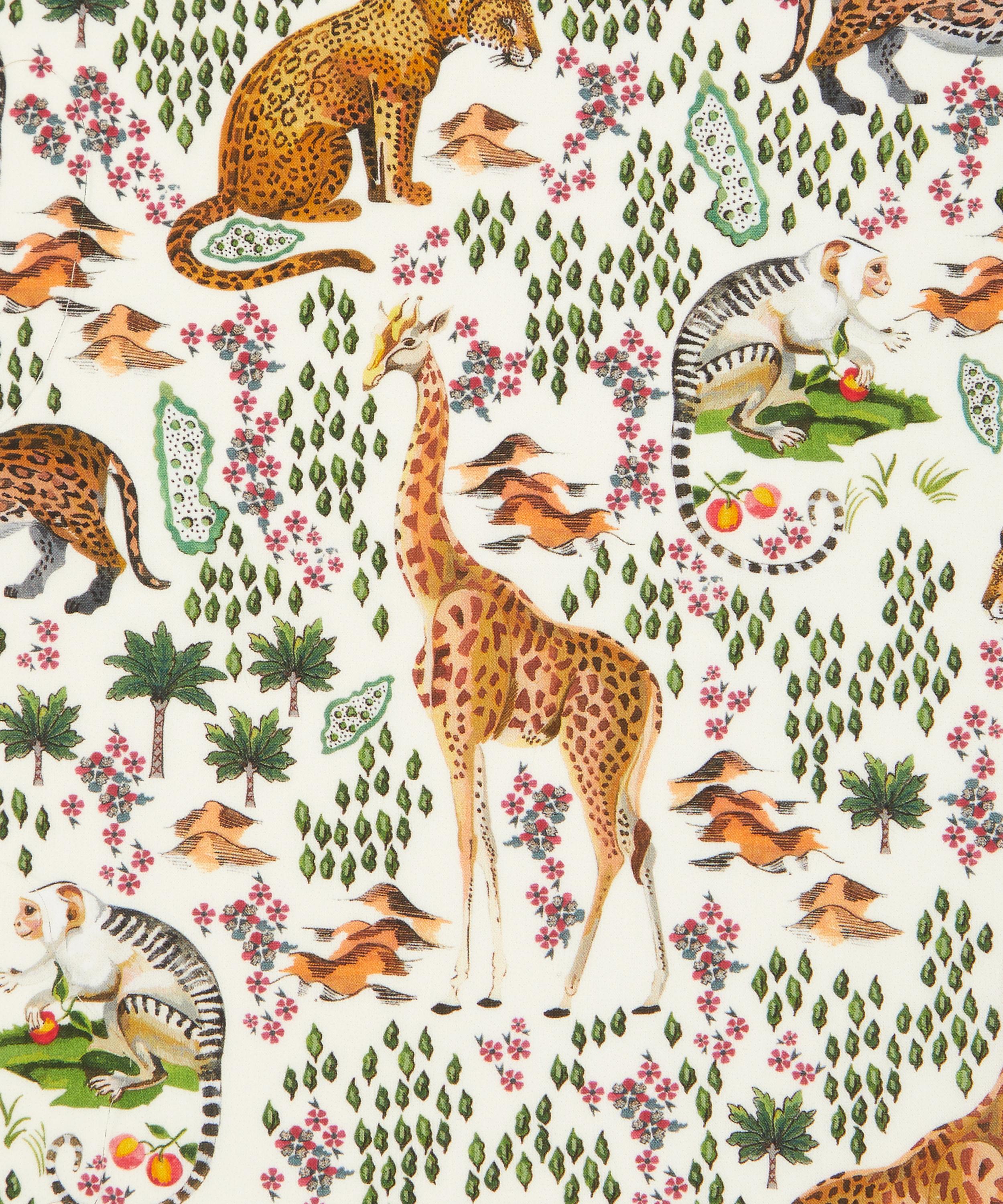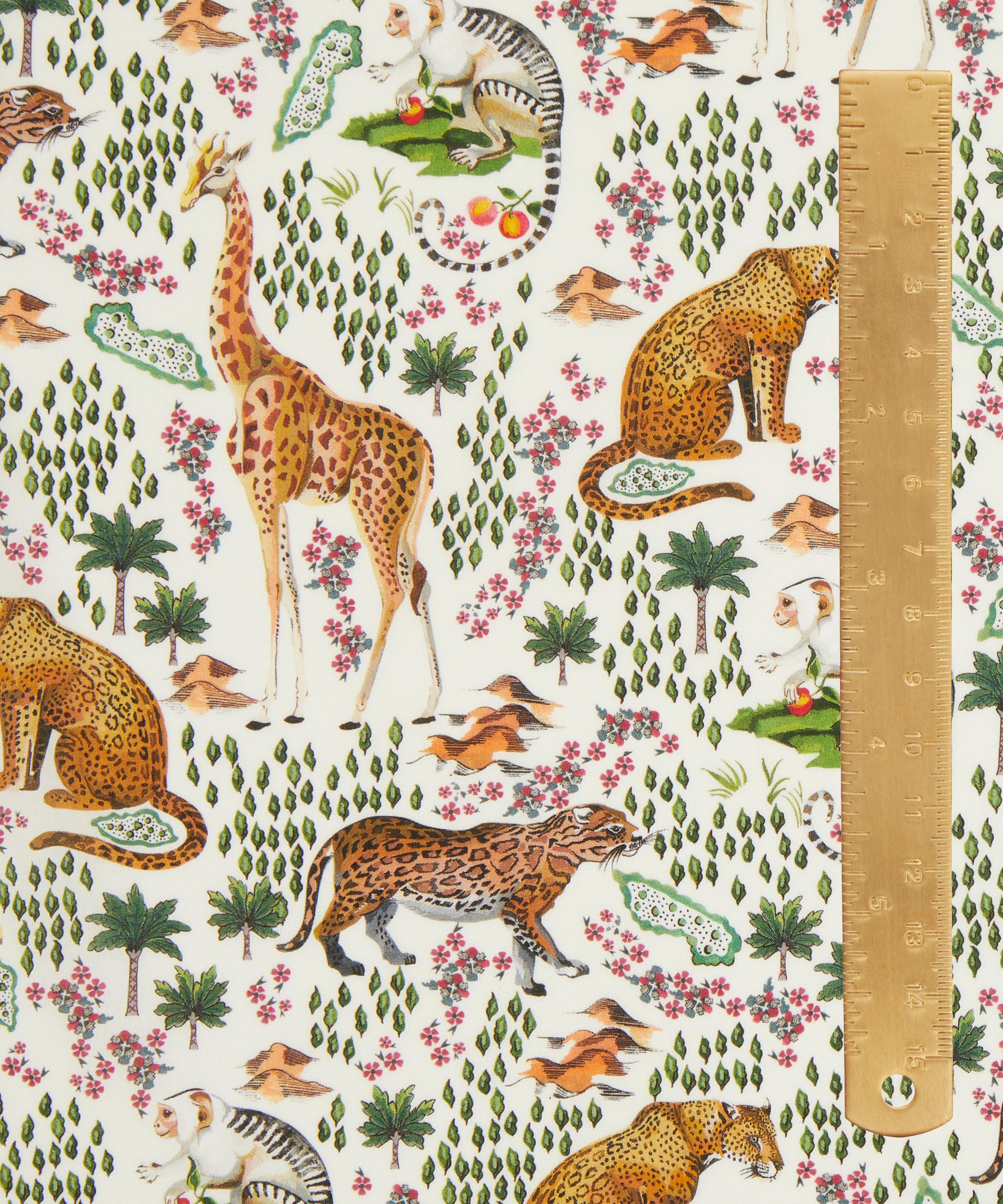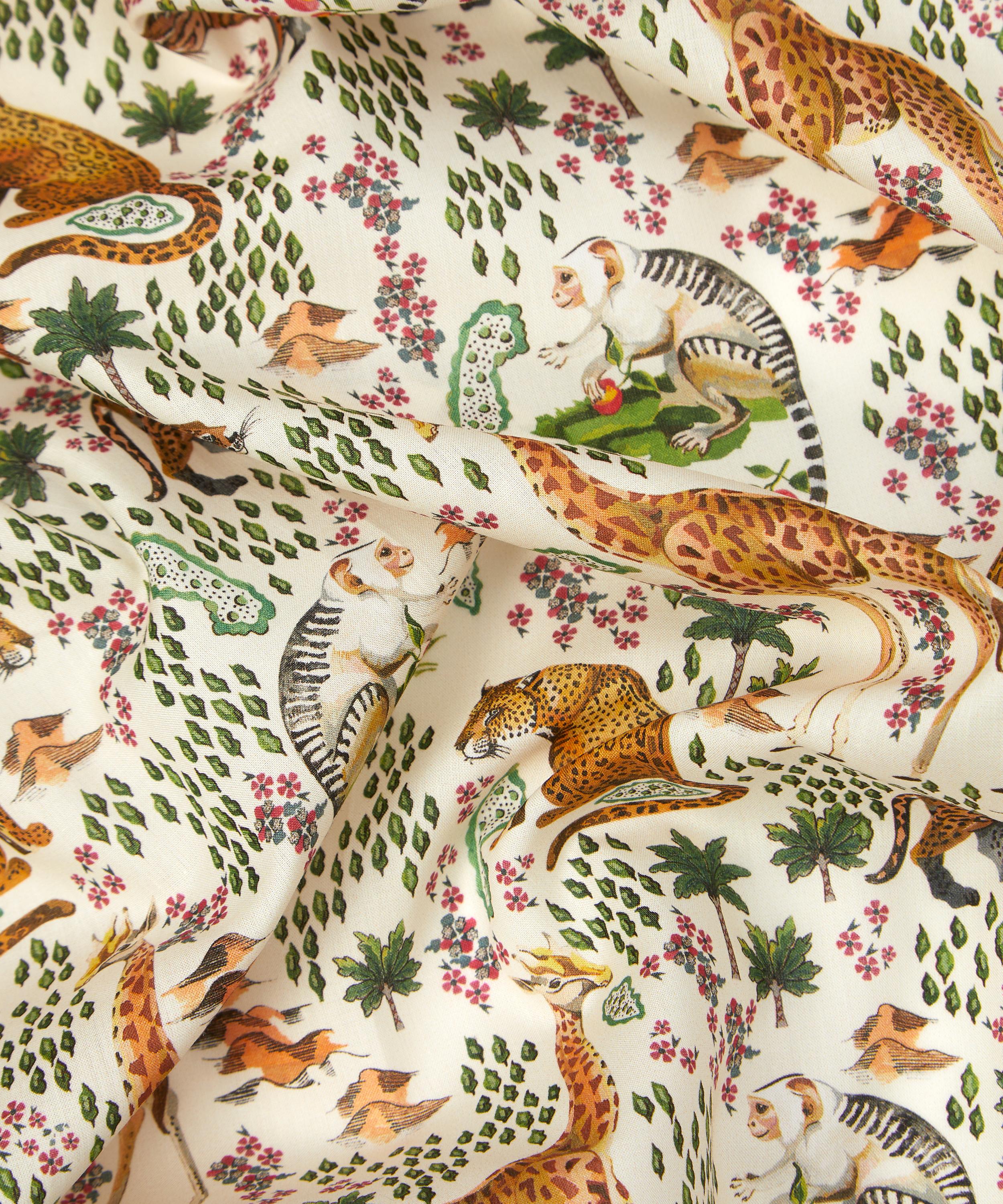 Championing the natural markings found on elegant safari animals, this design is a riot of pattern and colour. Painted in the Liberty Design Studio using gouache paints and fine brushes to add fastidious detail - leopards, giraffes, ocelots and monkeys sit within a landscape of mountains, palm trees and tiny, fragrant blossoms and fruit.