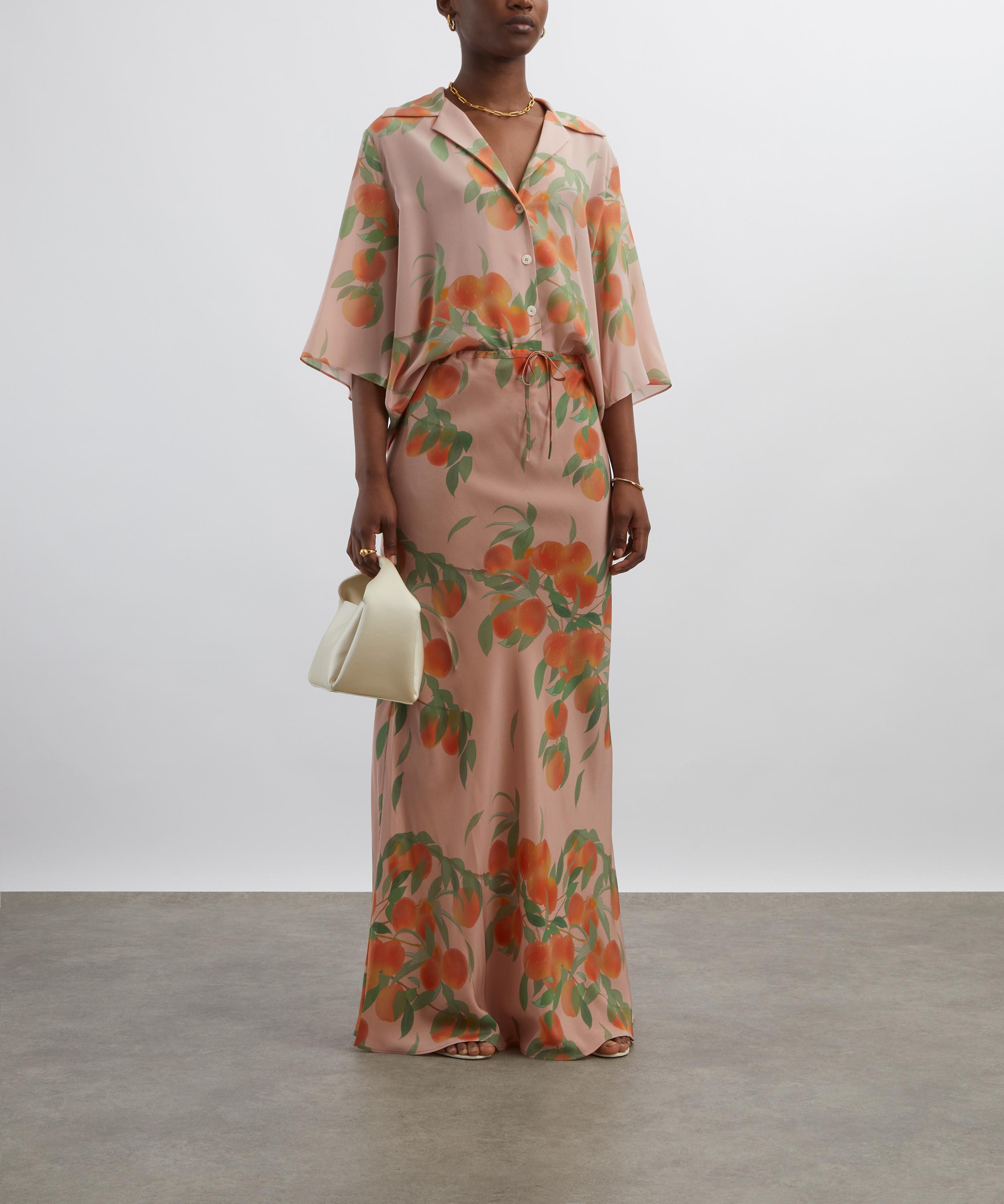 Adorned with this season’s Peachtree print, this maxi skirt flows gracefully to the ankle and features a drawstring waistband for an effortlessly comfortable fit. Crafted from light silk crêpe de chine fabric, it’s a must-have summer essential.