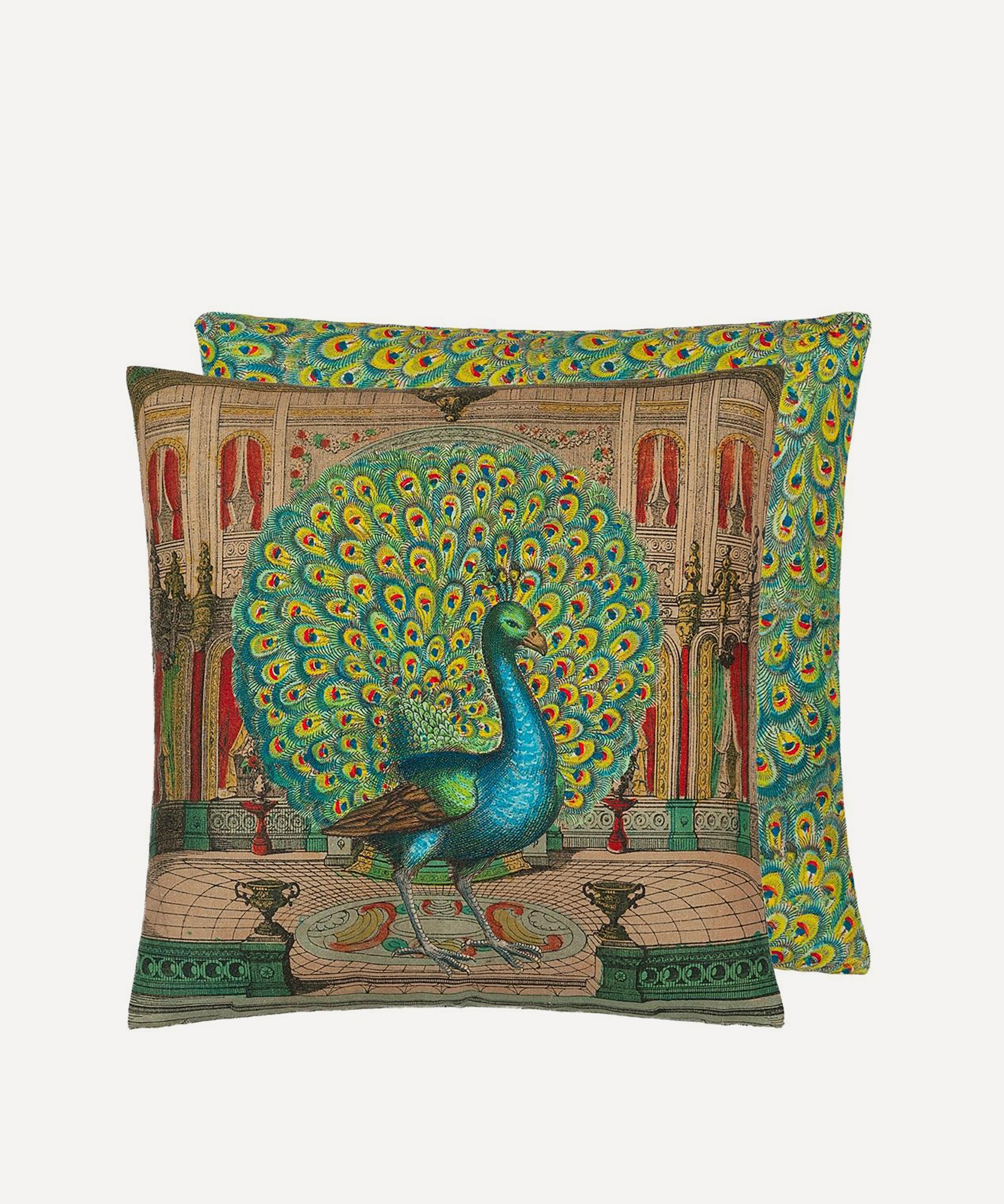 Digitally printed onto a luxe linen cotton blend this cushion features a resplendent peacock set amongst opulent architecture. Finished with an all-over feather pattern to the reverse, style either way on a daybed or armchair to effortlessly elevate your soft furnishings.
