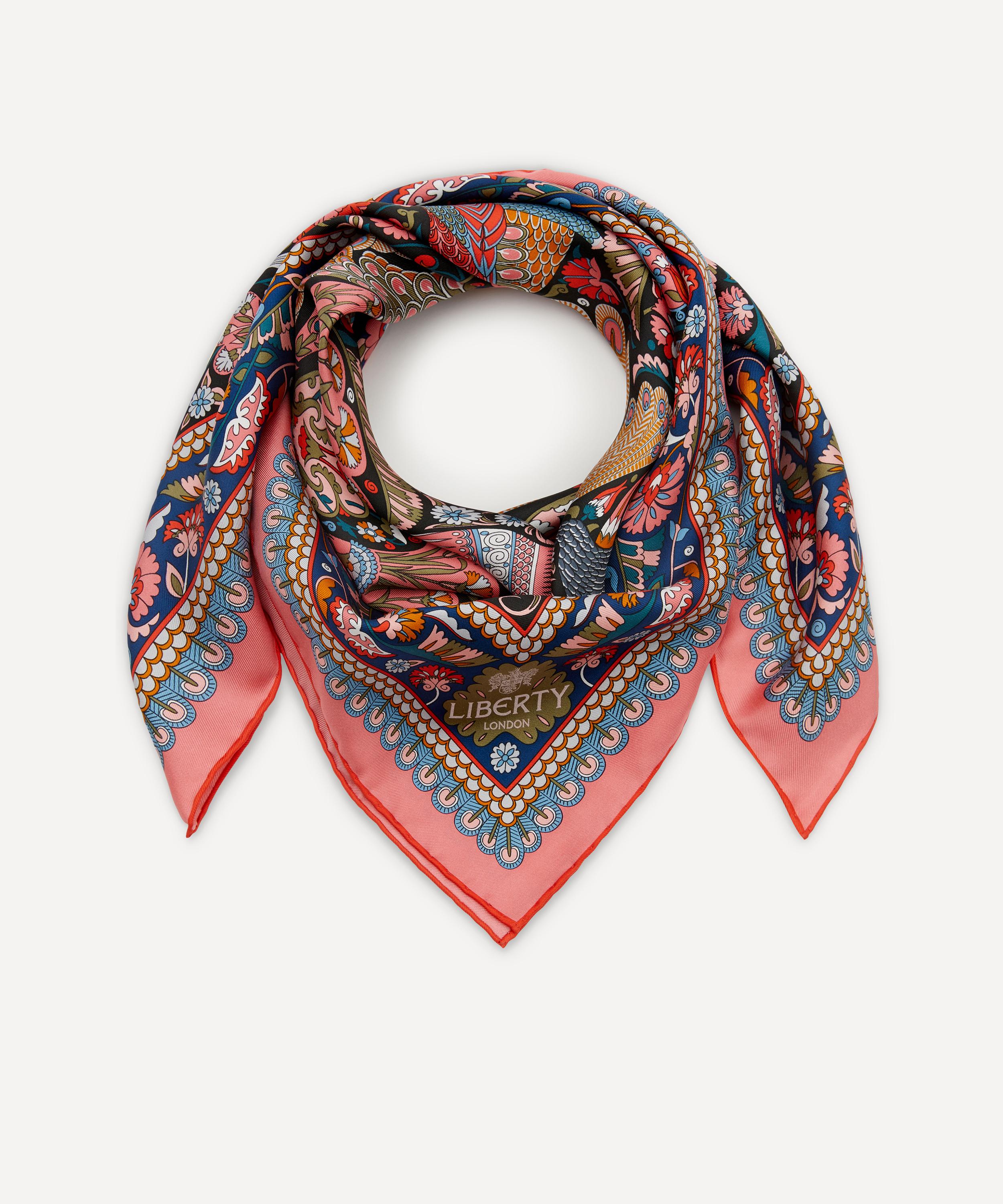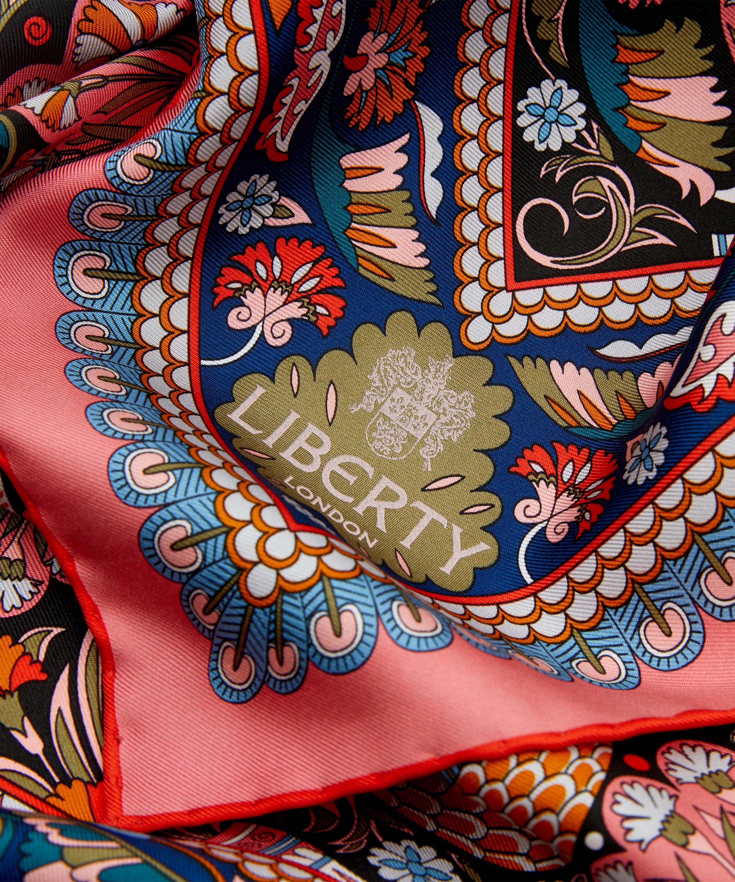 Whether looped around your neck or twisted through the handles of a tote, a Liberty silk scarf is a heroine of versatile styling. This square scarf is printed with Peacock Garden – dating back to 1990, this update on a classic Liberty archival artwork was originally based on an intricate tile mosaic by Arts and Crafts designer William de Morgan. This contemporary interpretation has been printed in Italy onto an expertly-woven silk twill, using innovative technologies alongside specialist finishing techniques.
