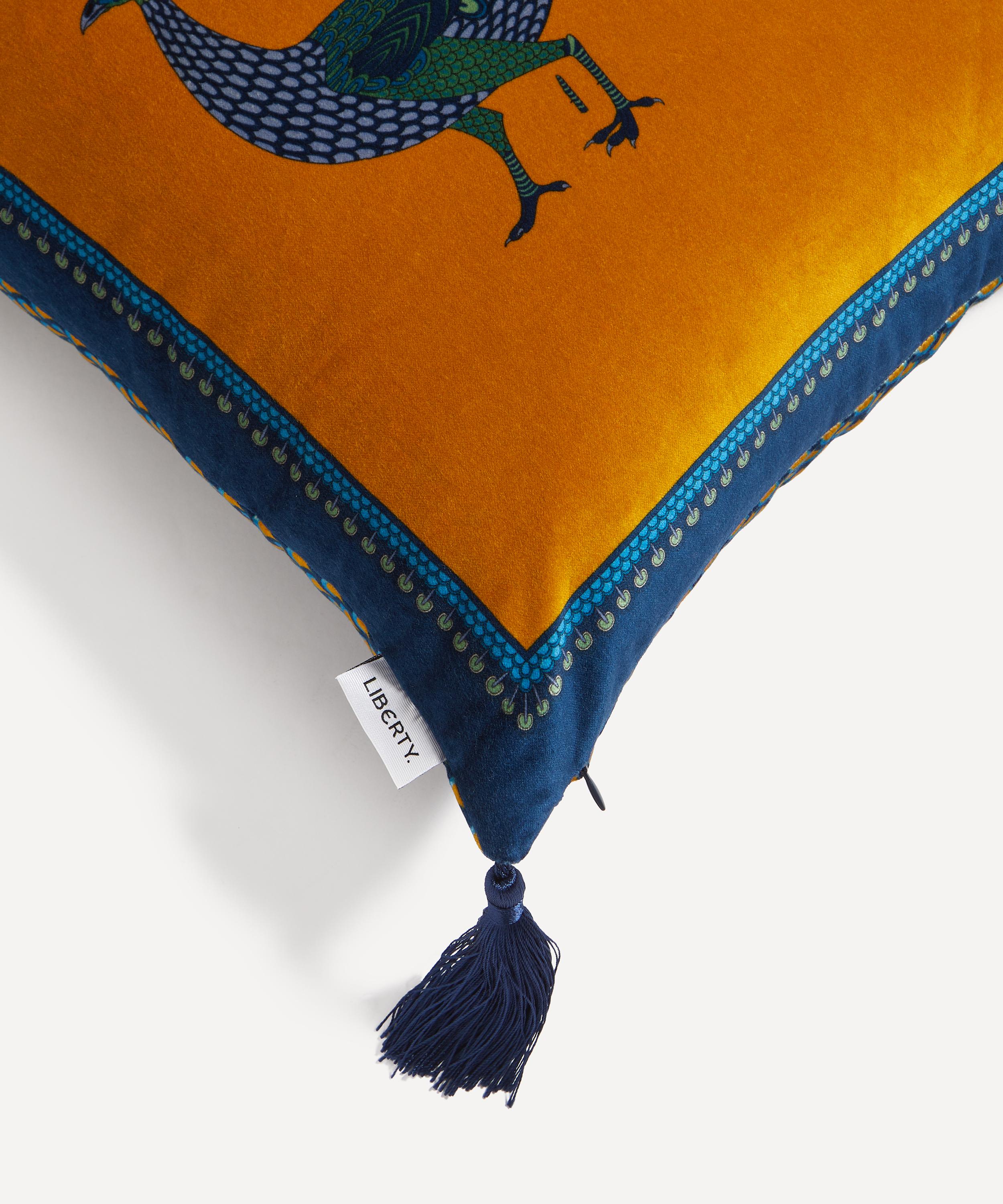 This Liberty square cushion features our Peacock print on velvet and is decadently plump with a recycled duck feather filling. Designed in-house, the peacock is a classic Liberty motif, intricately printed here with a bold, contrasting background to bring out the finer details. The cushion’s classic silhouette and contrasting sides allows for maximum versatility, complementing both minimal and decorative interiors.