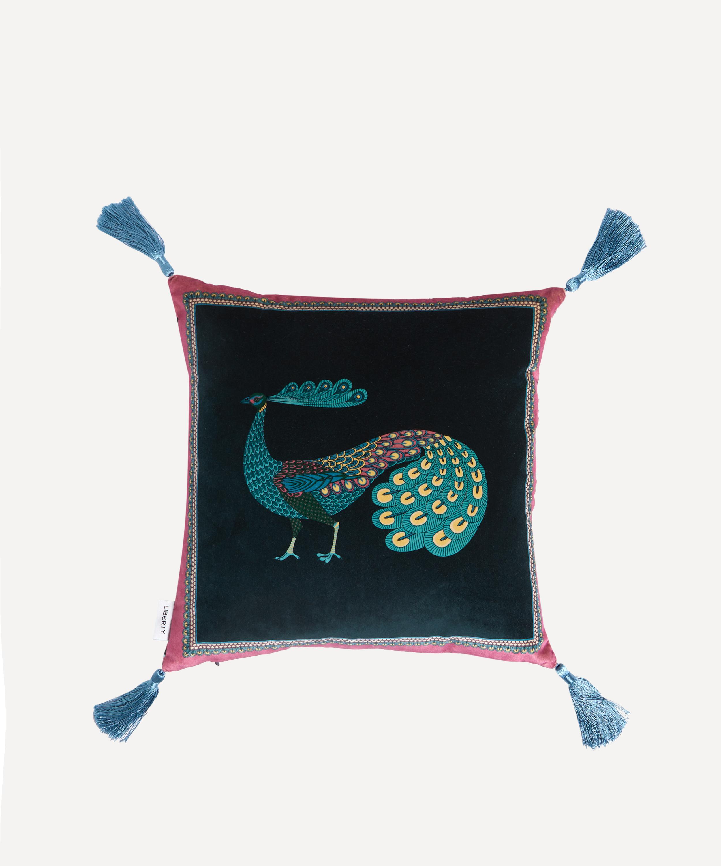 Liberty’s Peacock Garden square cushion is a versatile interiors staple, crafted in England and featuring a print from our archives.