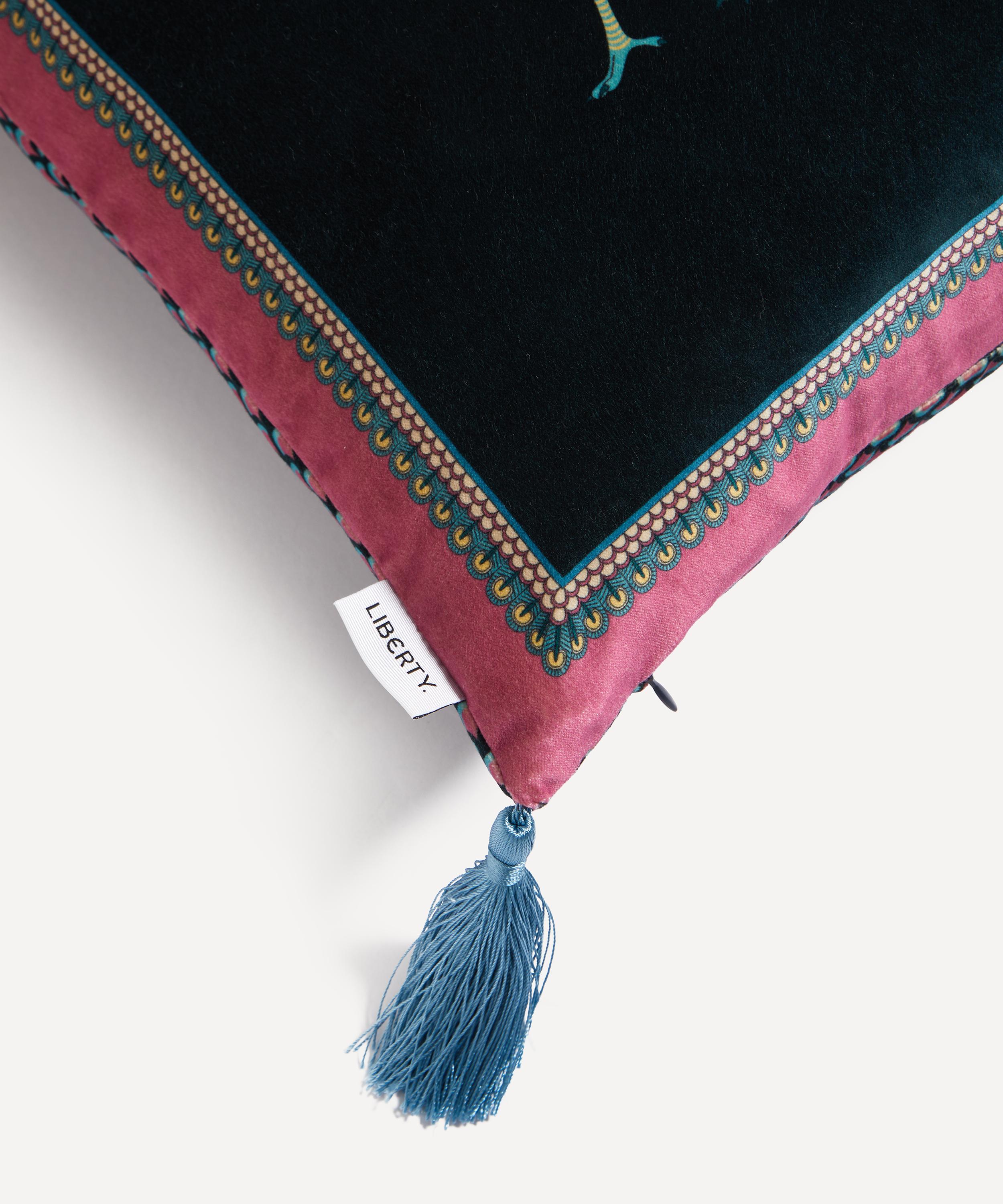 This Liberty square cushion features our Peacock print on velvet and is decadently plump with a recycled duck feather filling. Designed in-house, the peacock is a classic Liberty motif, intricately printed here with a bold, contrasting background to bring out the finer details. The cushion’s classic silhouette and contrasting sides allows for maximum versatility, complementing both minimal and decorative interiors.