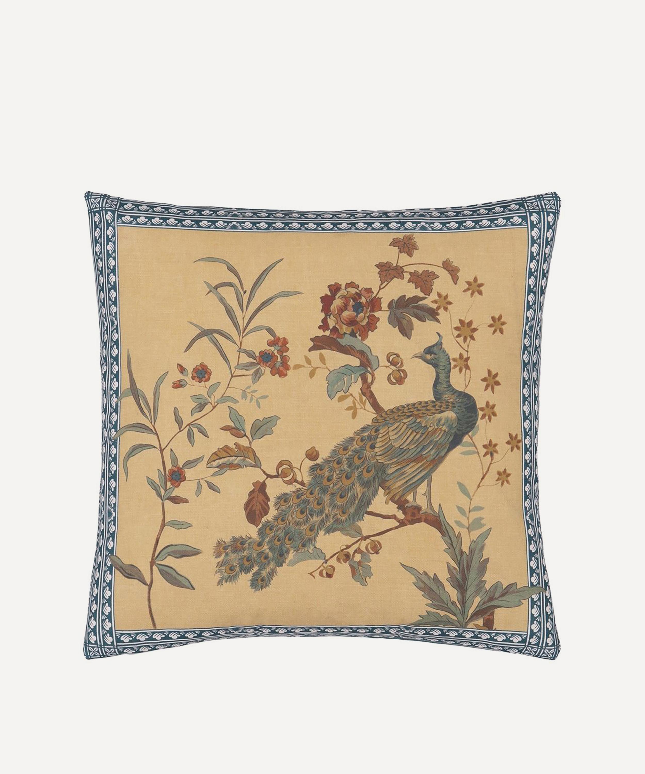 Digitally printed onto a luxe textured cotton this cushion features a resplendent peacock perched among trailing leaves and flowers, backed by a rich sepia ground and bordered with a tiled design. Finished with blooming florals and botanicals to the reverse, style either way on a daybed or armchair to effortlessly elevate your soft furnishings.
