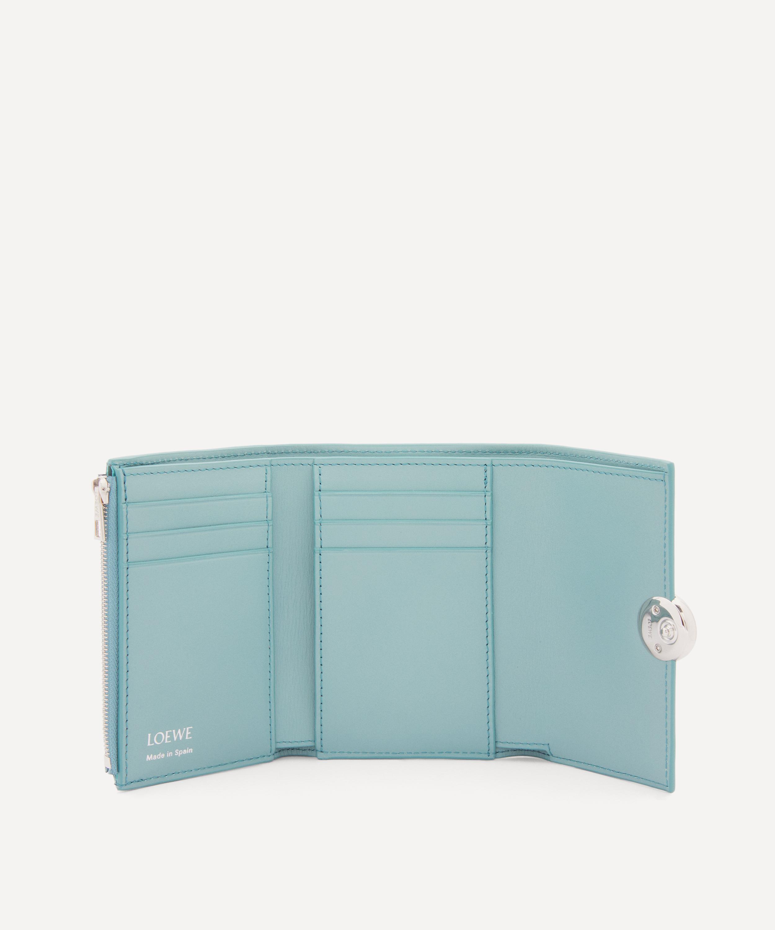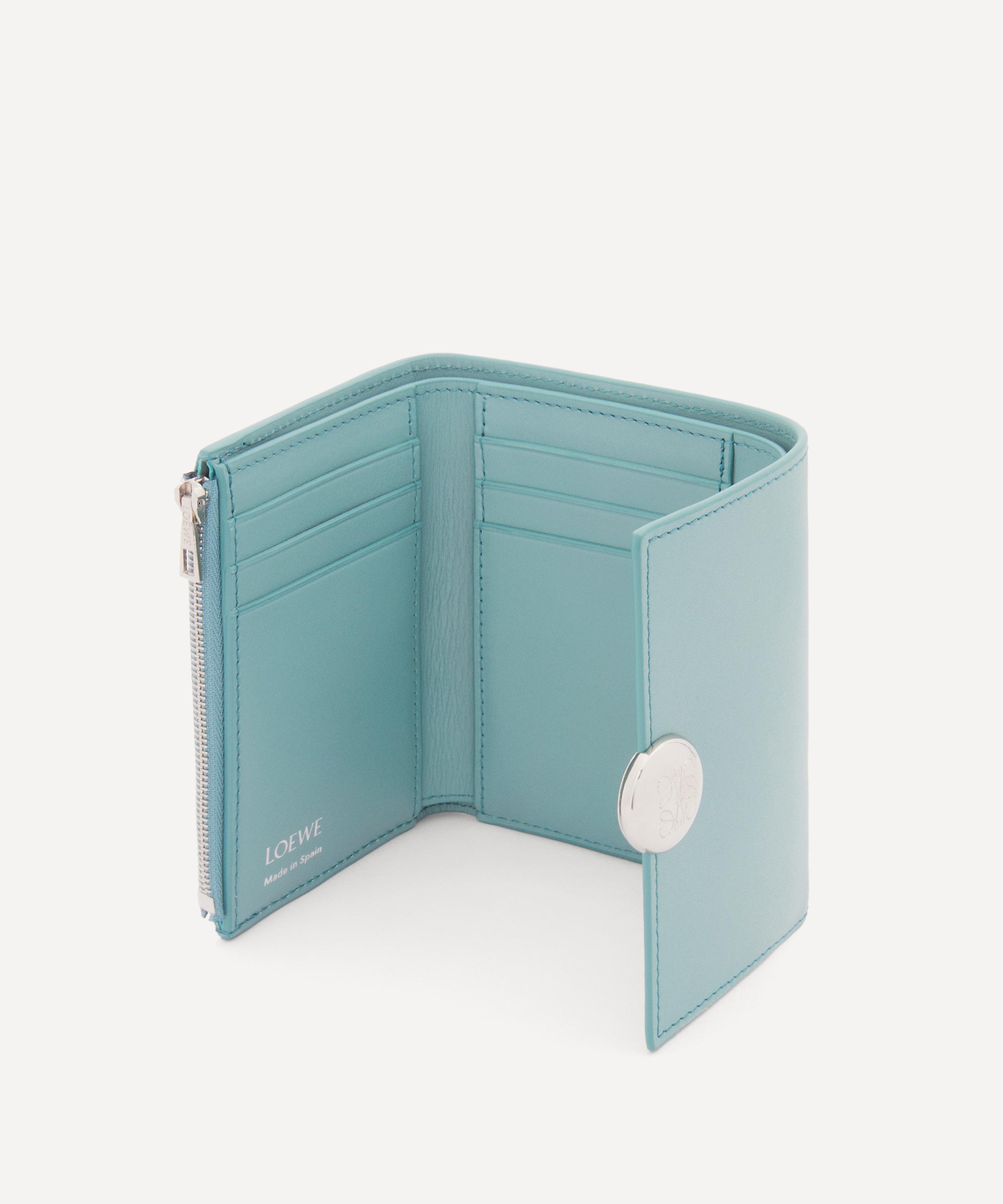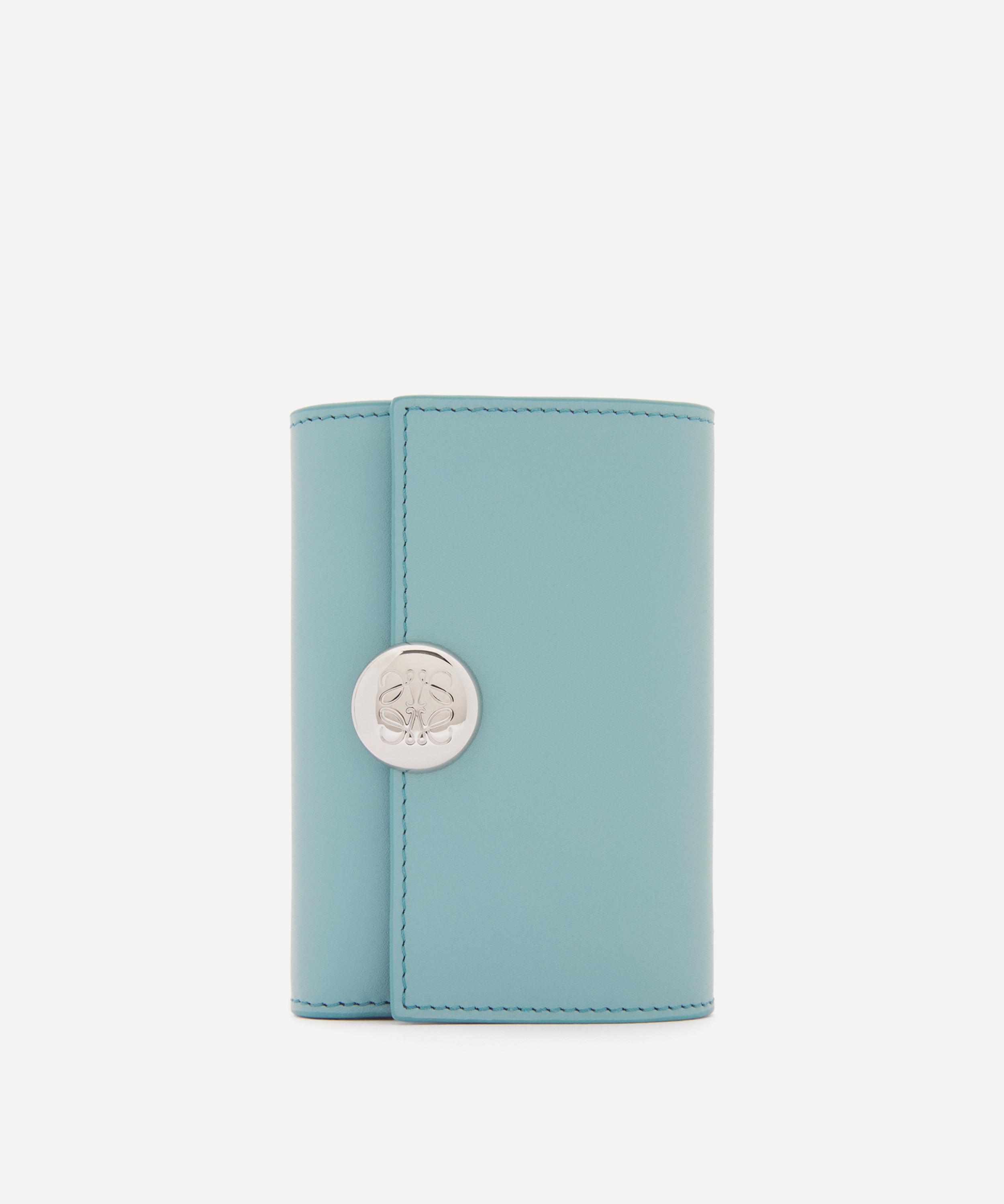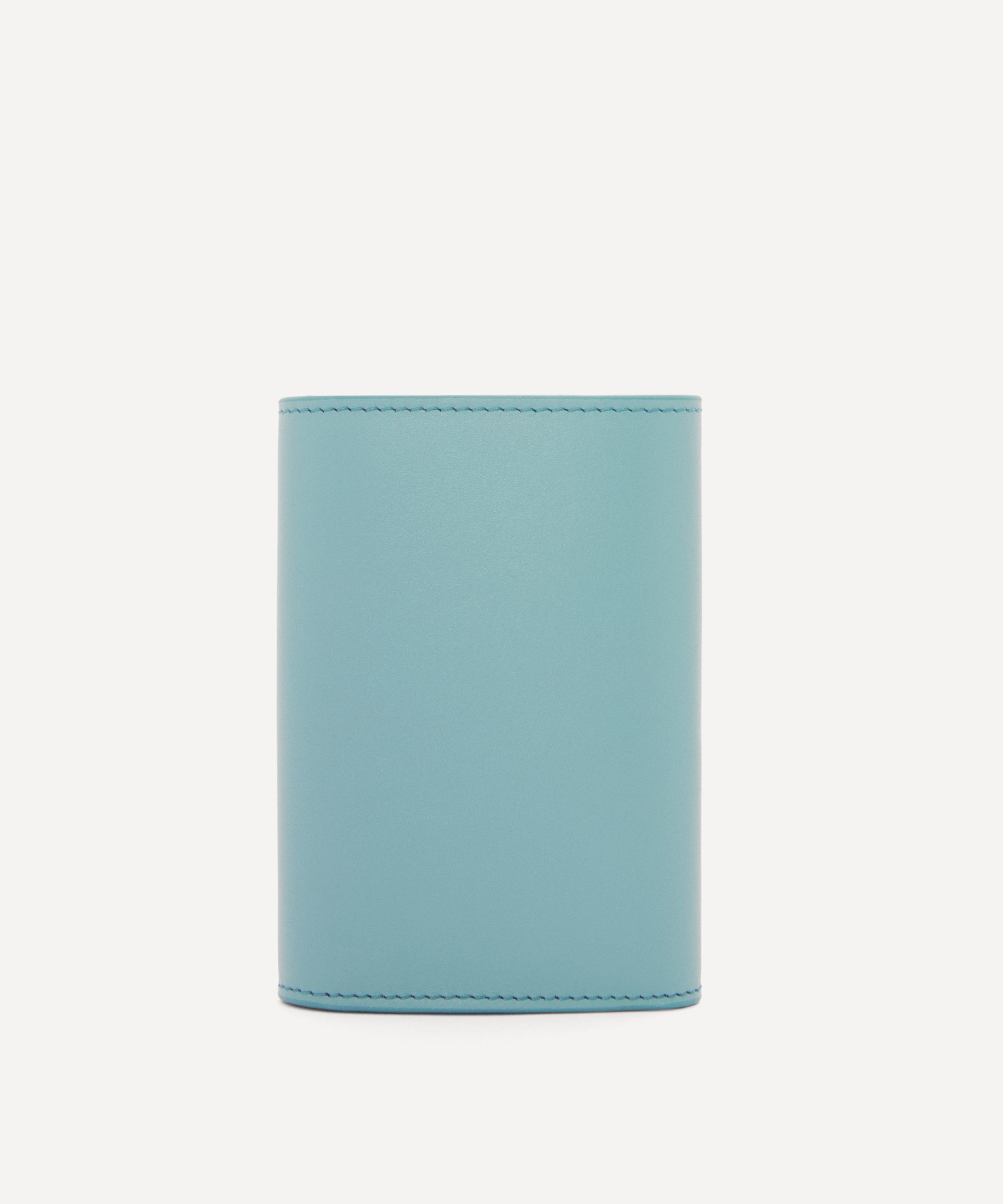 Crafted from shiny nappa calfskin leather, this small vertical wallet features a classic trifold design with six card slots, three interior pockets and a single zipped coin compartment. Secured by a snap button closure at the front, detailed with the brand’s signature pebble and an engraved Anagram logo, it's perfect for slipping into a handbag or jacket pocket to keep essential cards organised in style.