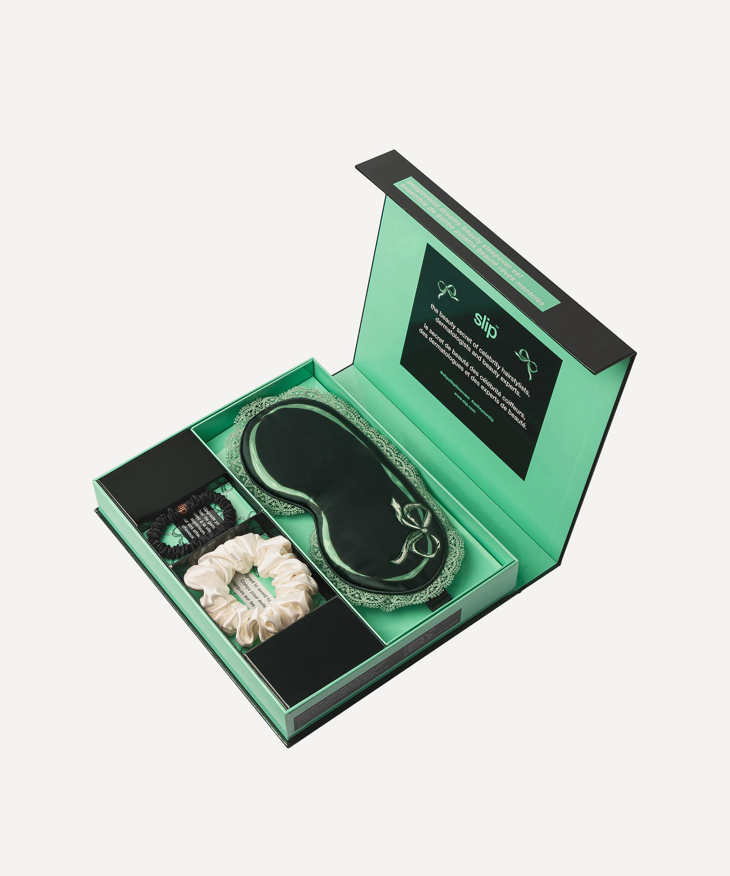 - Includes: 1 x Slip Contour Sleep Mask with lace trim in Evergreen, 1 x Black Skinny Scrunchie, 1 x White Large Scrunchie