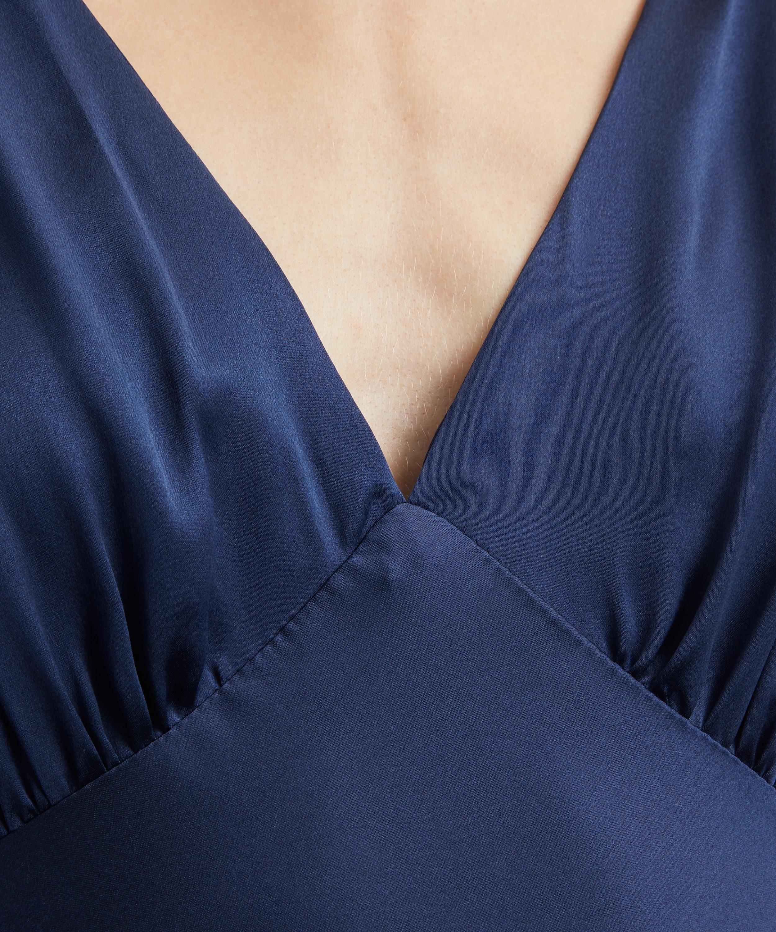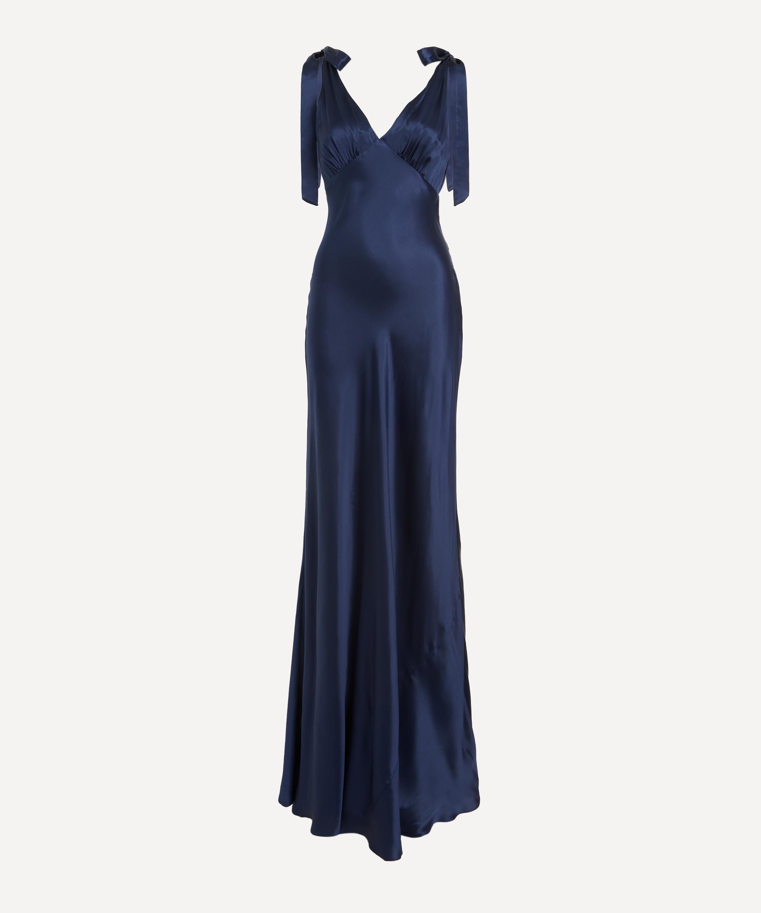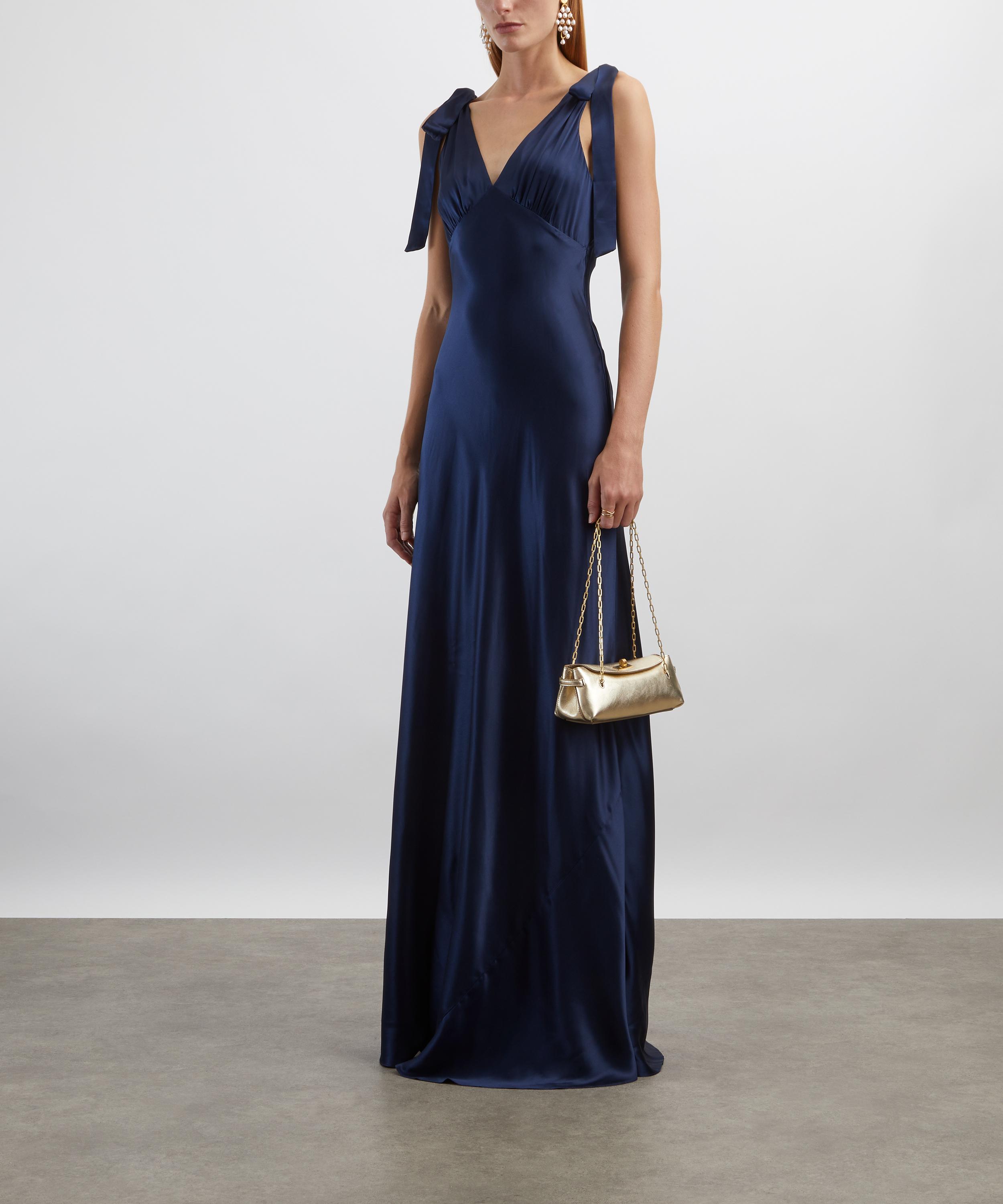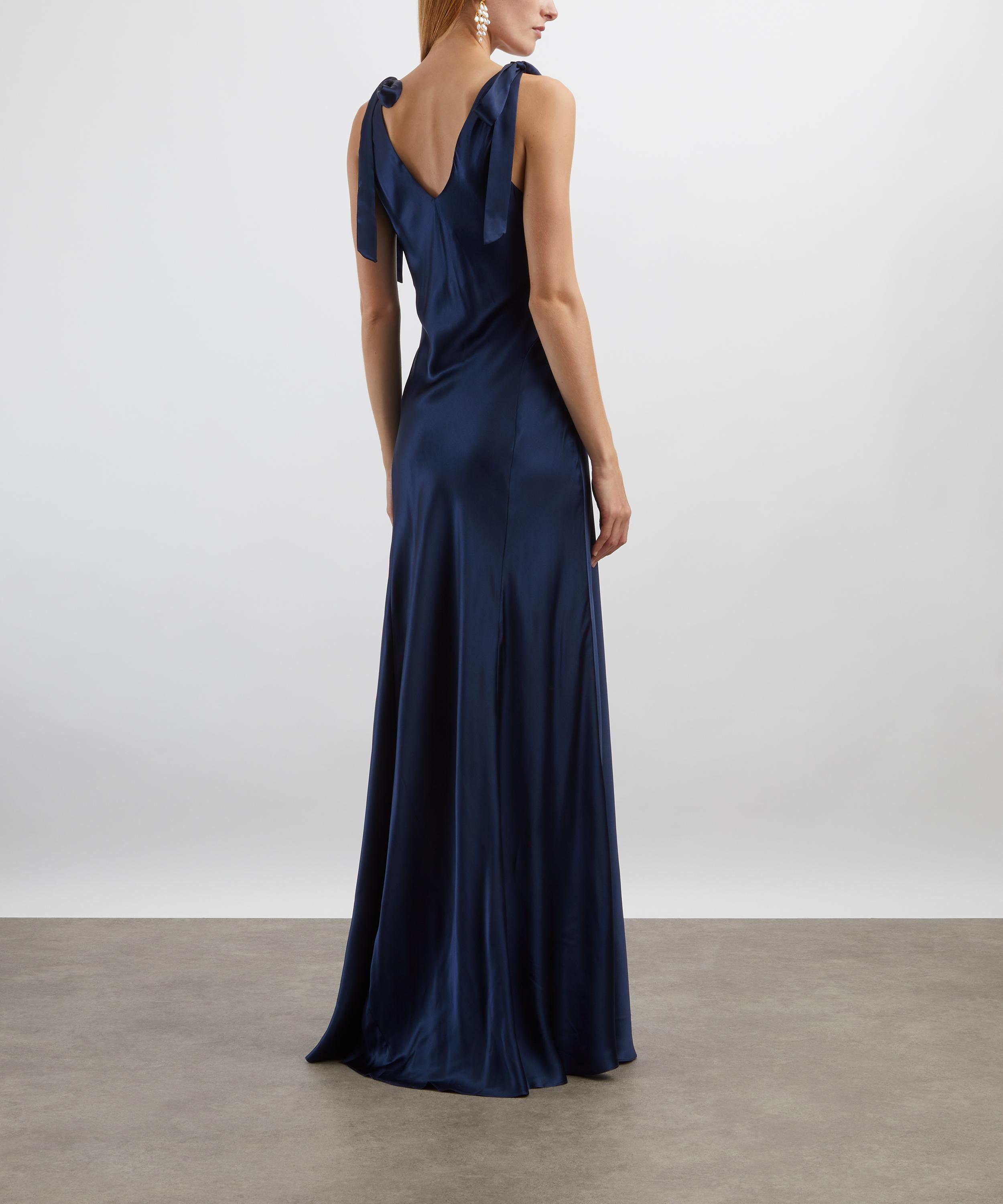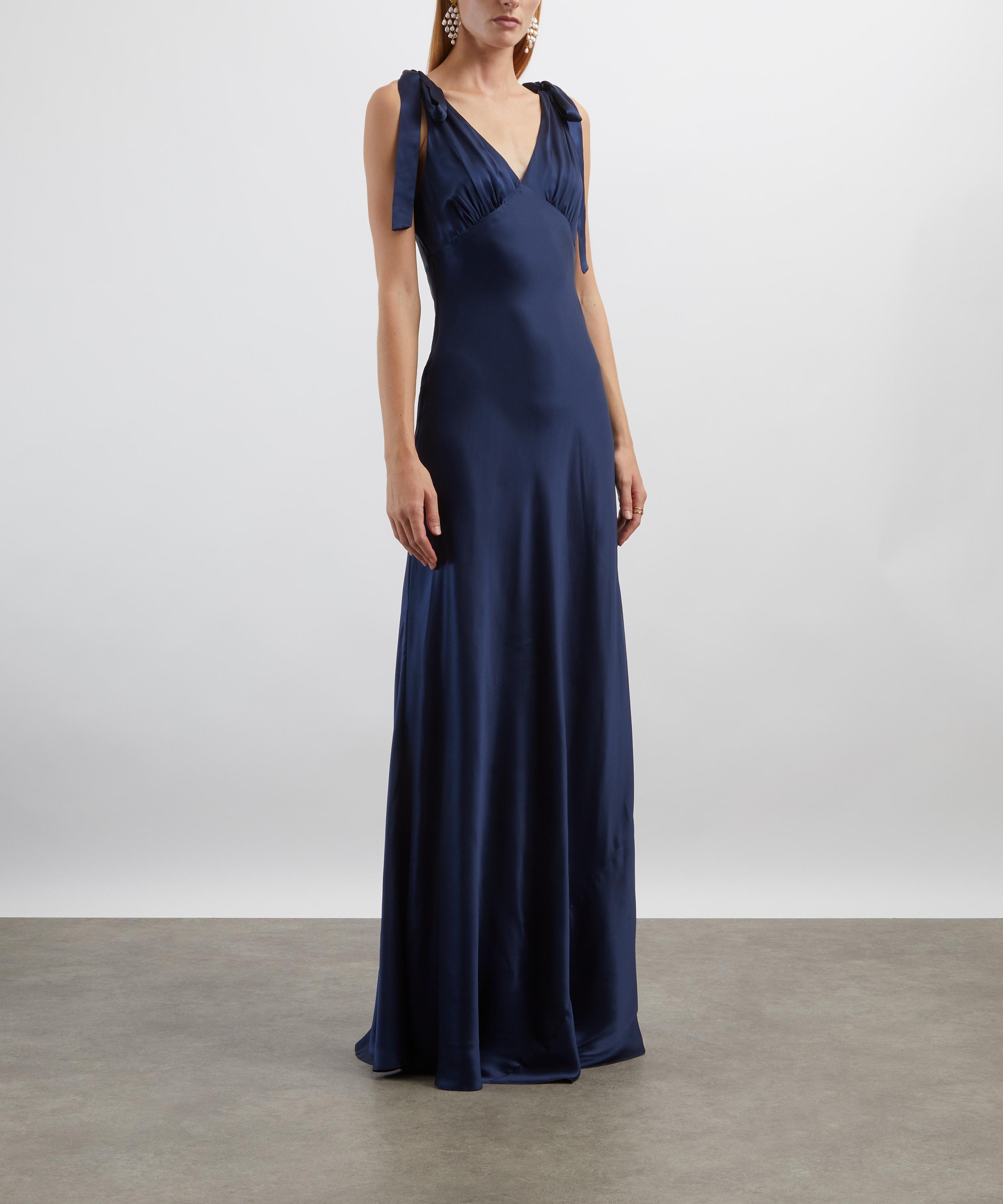 Crafted from lightweight silk charmeuse, this navy maxi dress is a striking statement piece with a flowing, floor-length silhouette. Fitted through the bodice, it features an elegant V-neckline, delicate tie straps, and a flattering empire waist.
