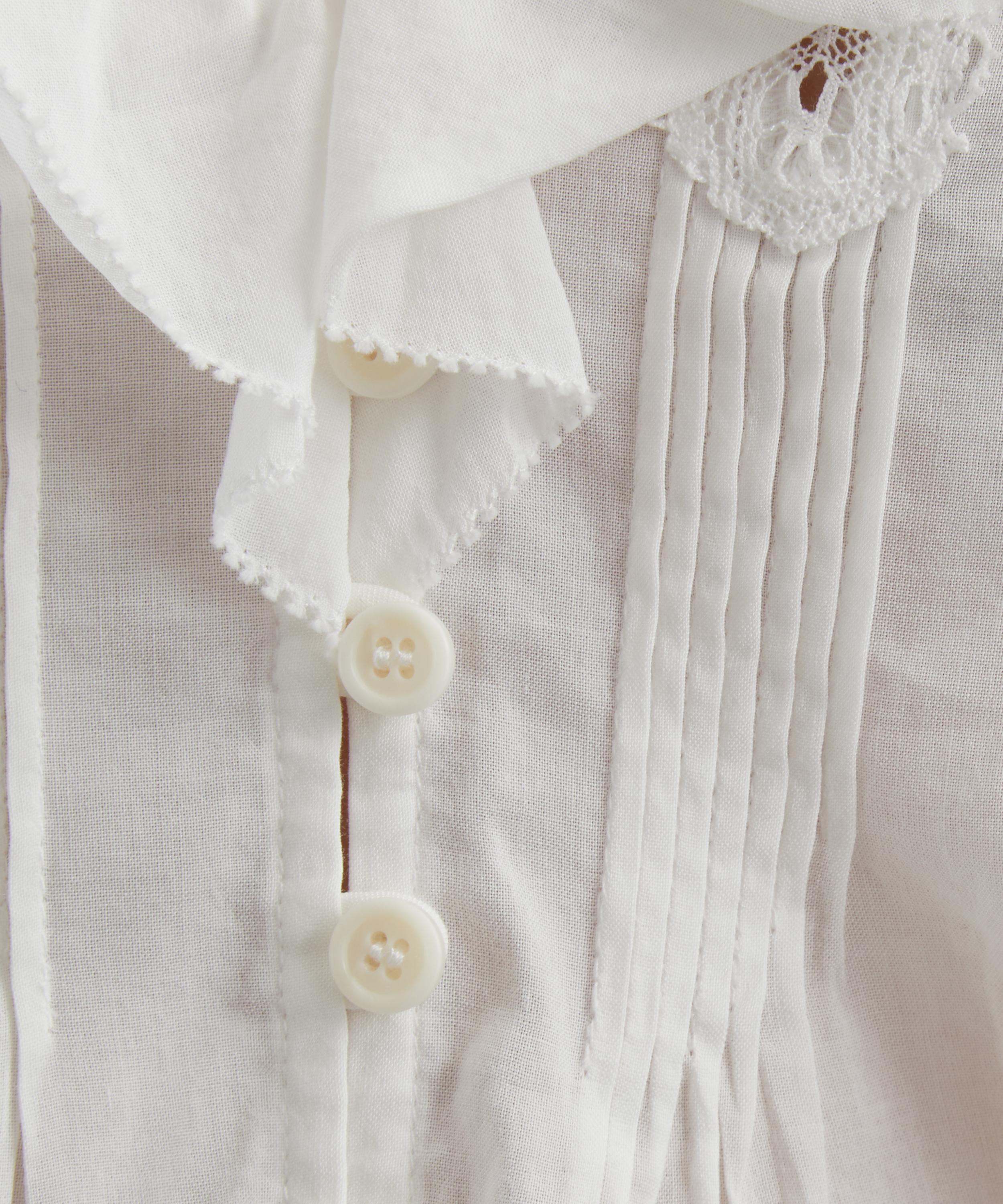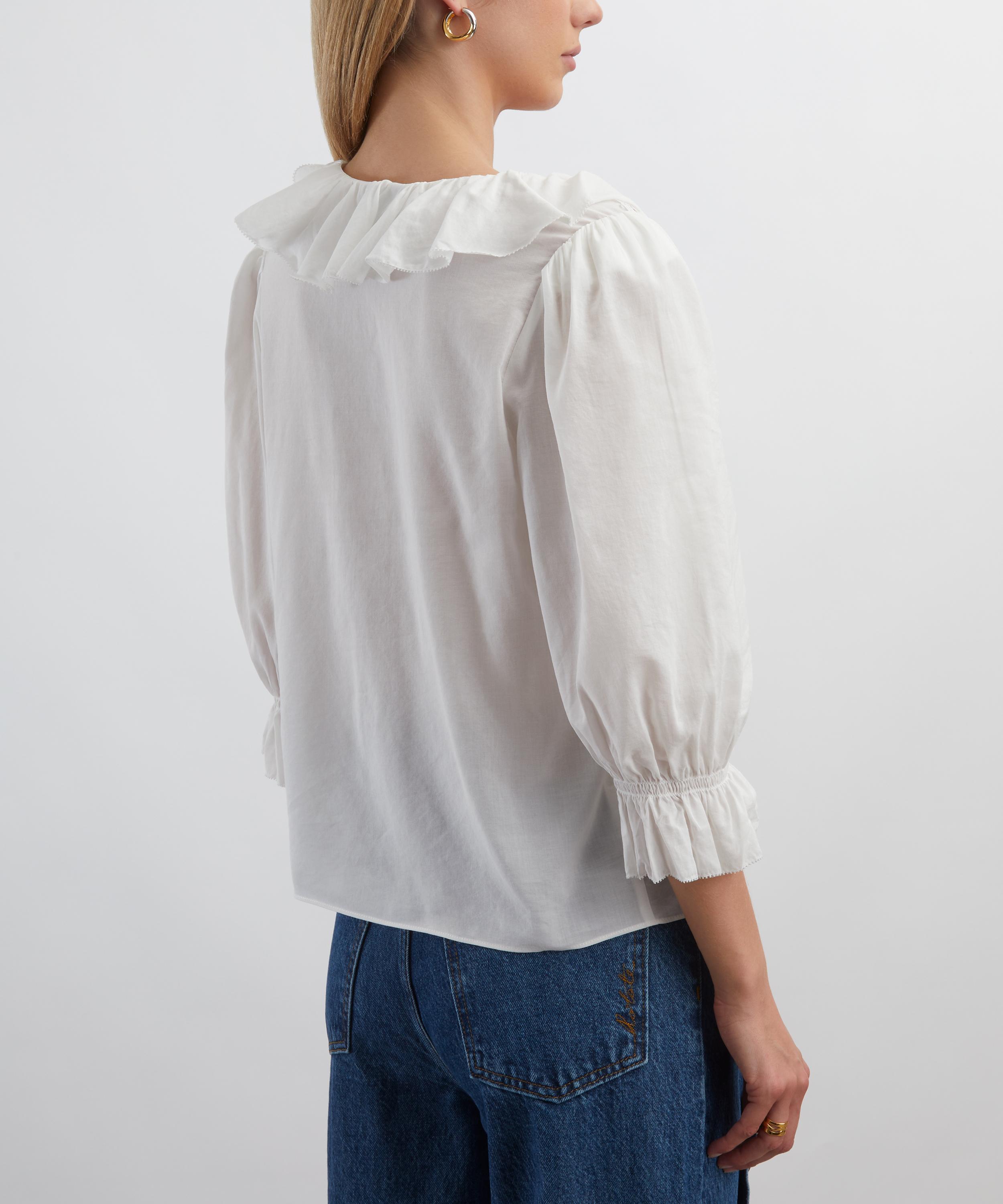 Crafted from lightweight voile, the Perry top exudes effortless elegance. Designed with a relaxed fit and mid-length blouson sleeves, it features a ruffled V-neckline accented by lace trims and a delicate buttoned placket.
