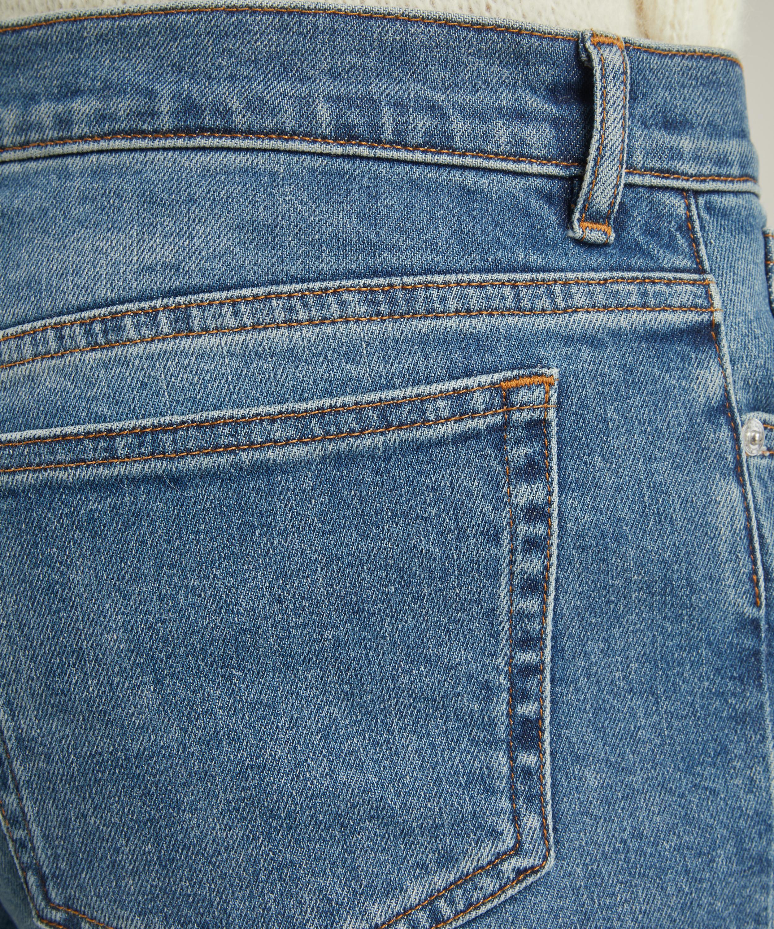 Made from Japanese stonewashed stretch-denim, these mid-rise jeans have a very tight, straight leg complete with five pockets, caramel-coloured topstitching, and a top button engraved with for a trademark finish.