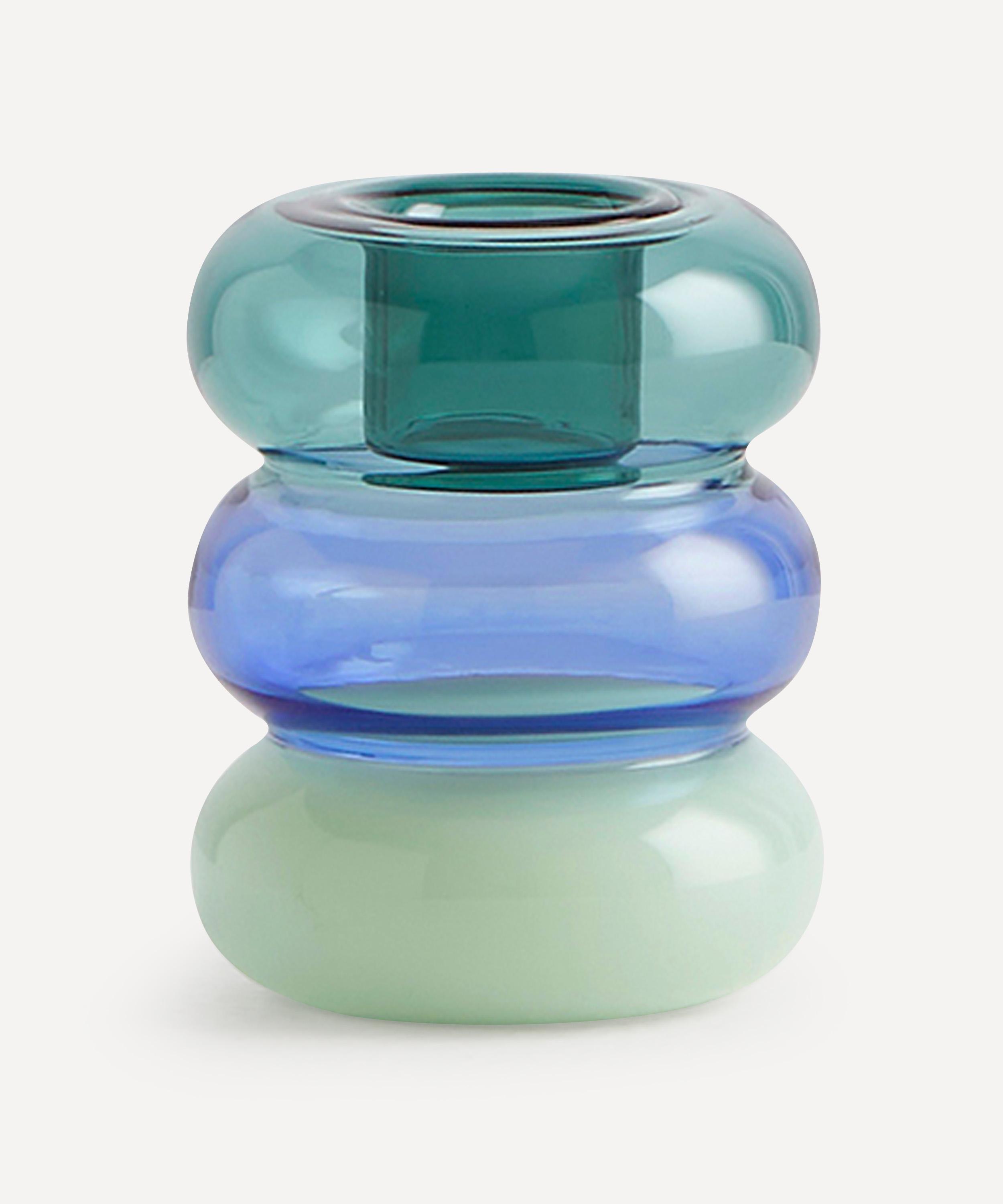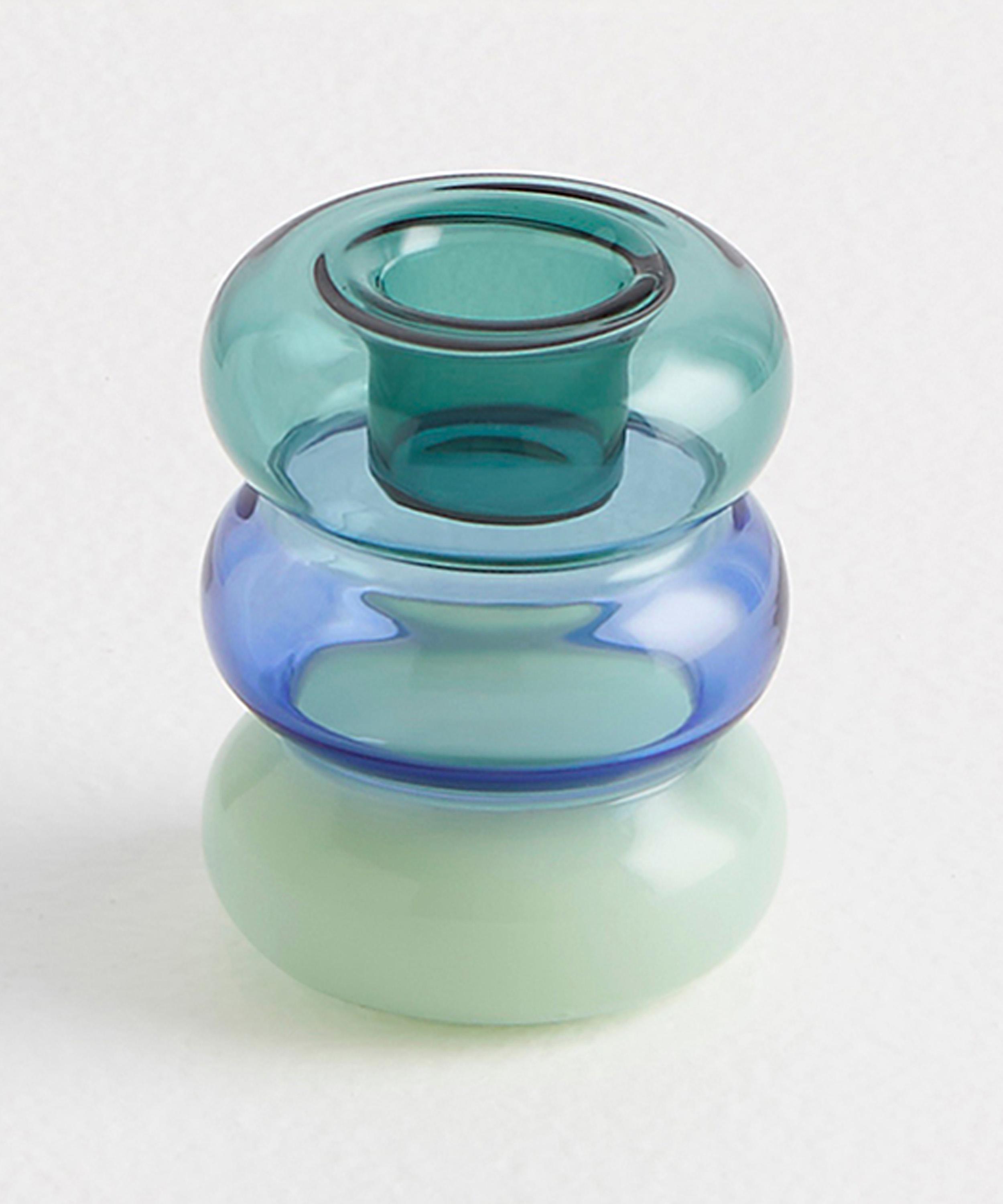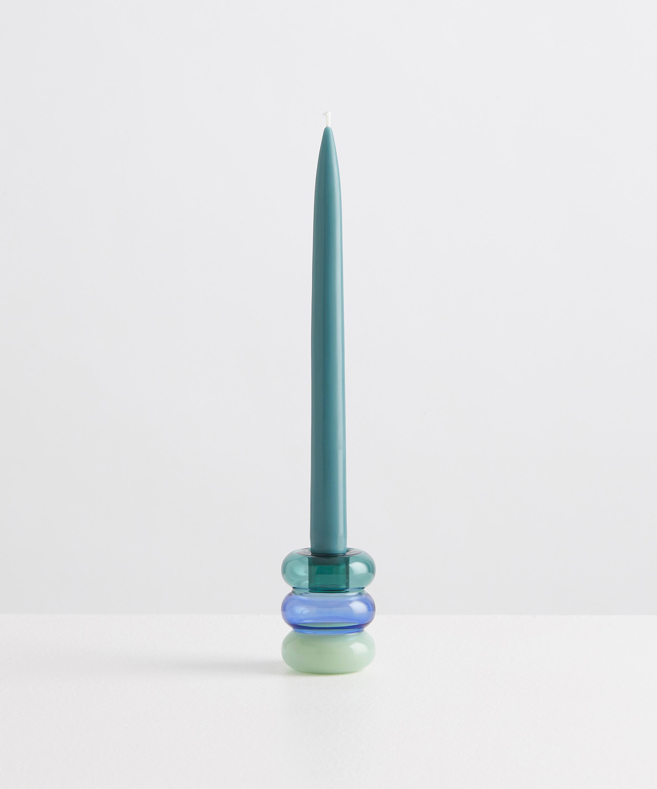 Crafted from durable borosilicate glass, Petite Pauline is a playful stack of glass bubbles waiting for a candle to complete its airy silhouette. In a palette of teal, azure blue and mint green, it’s sure to bring a serene touch to any mantel piece or table setting. Use to display Maison Balzac’s sculptural Volute candles or colourful tapered candles of your own choosing.