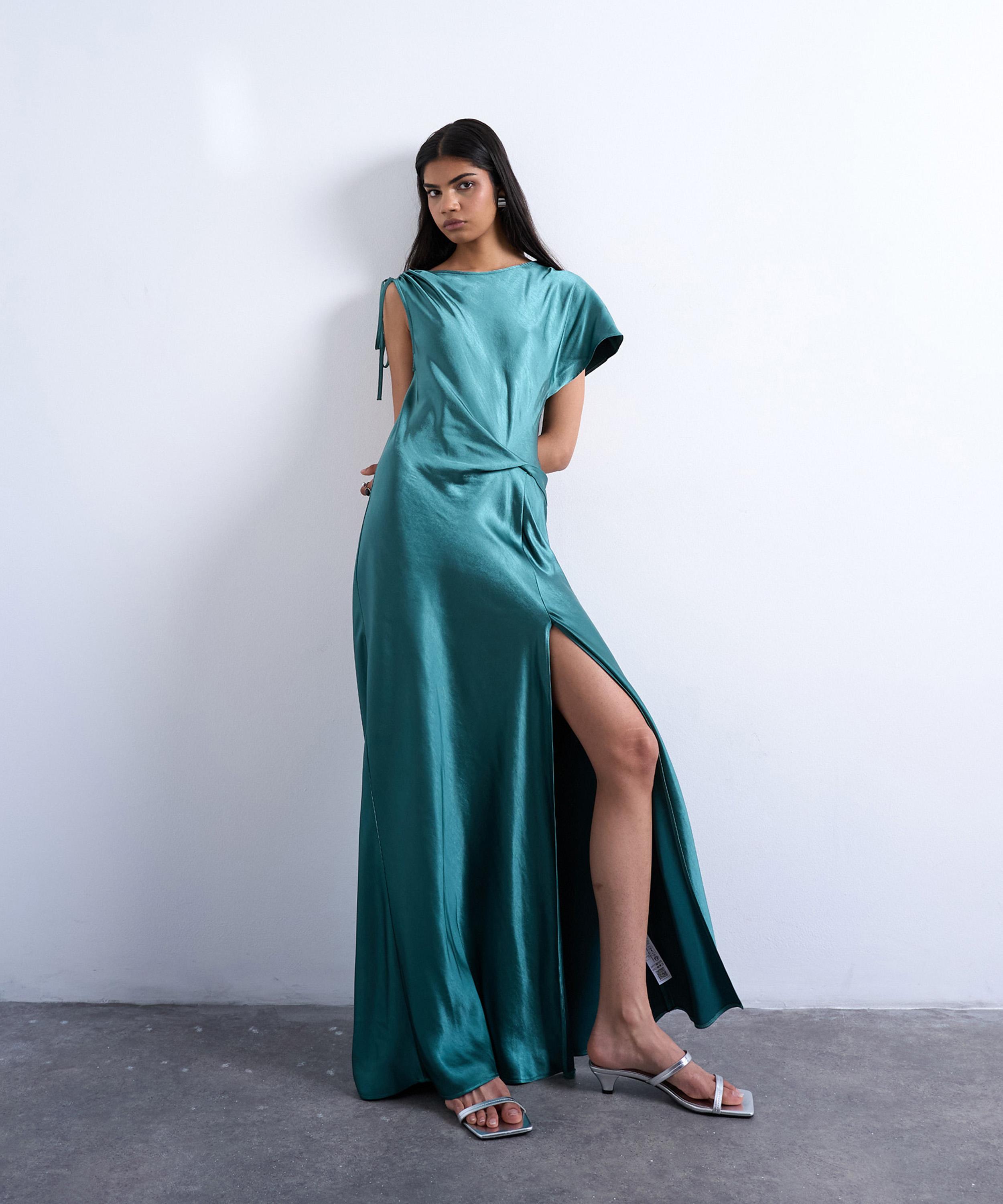 Crafted from satin in a lustrous teal hue, this sleek evening dress exudes effortless elegance with its draped neckline, single flutter sleeve, open back, and a flowing silhouette finished with a dramatic thigh-high slit.