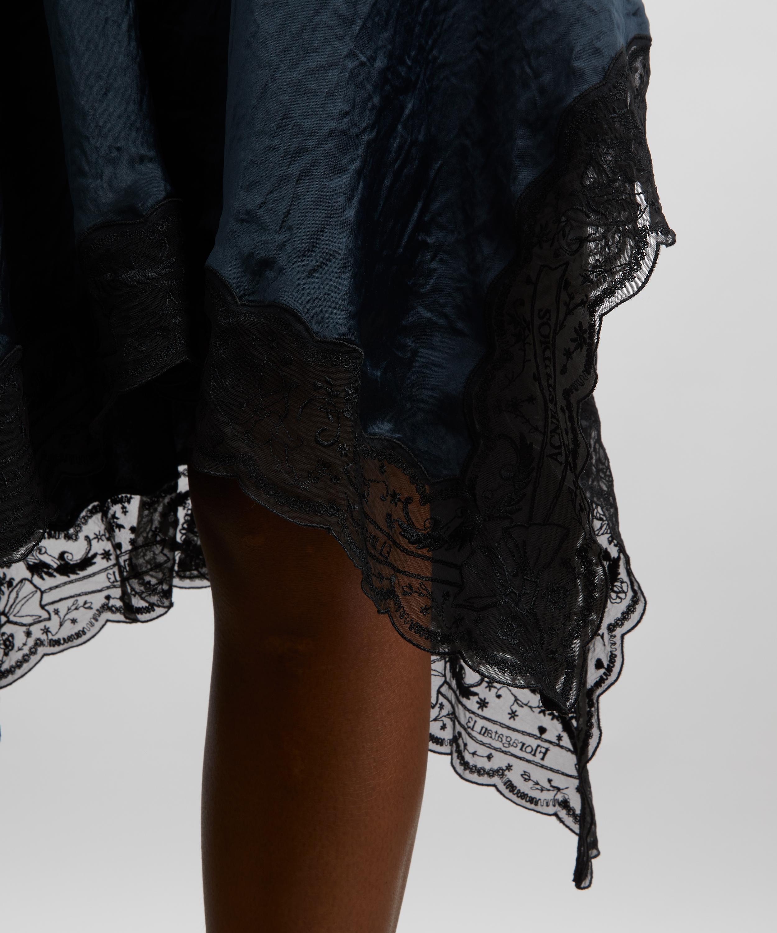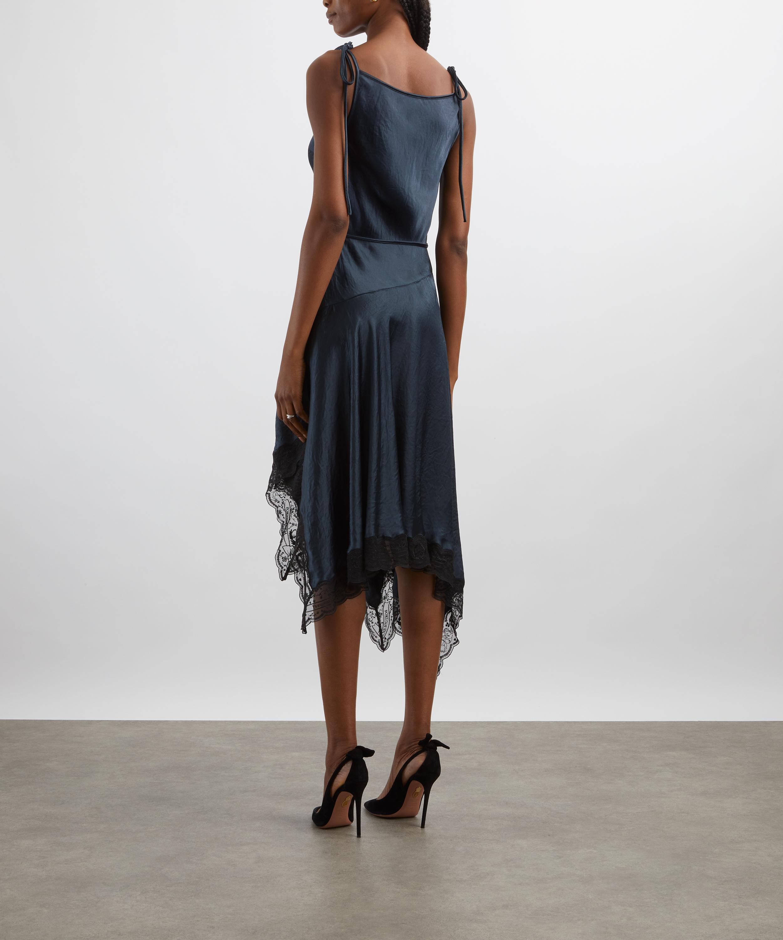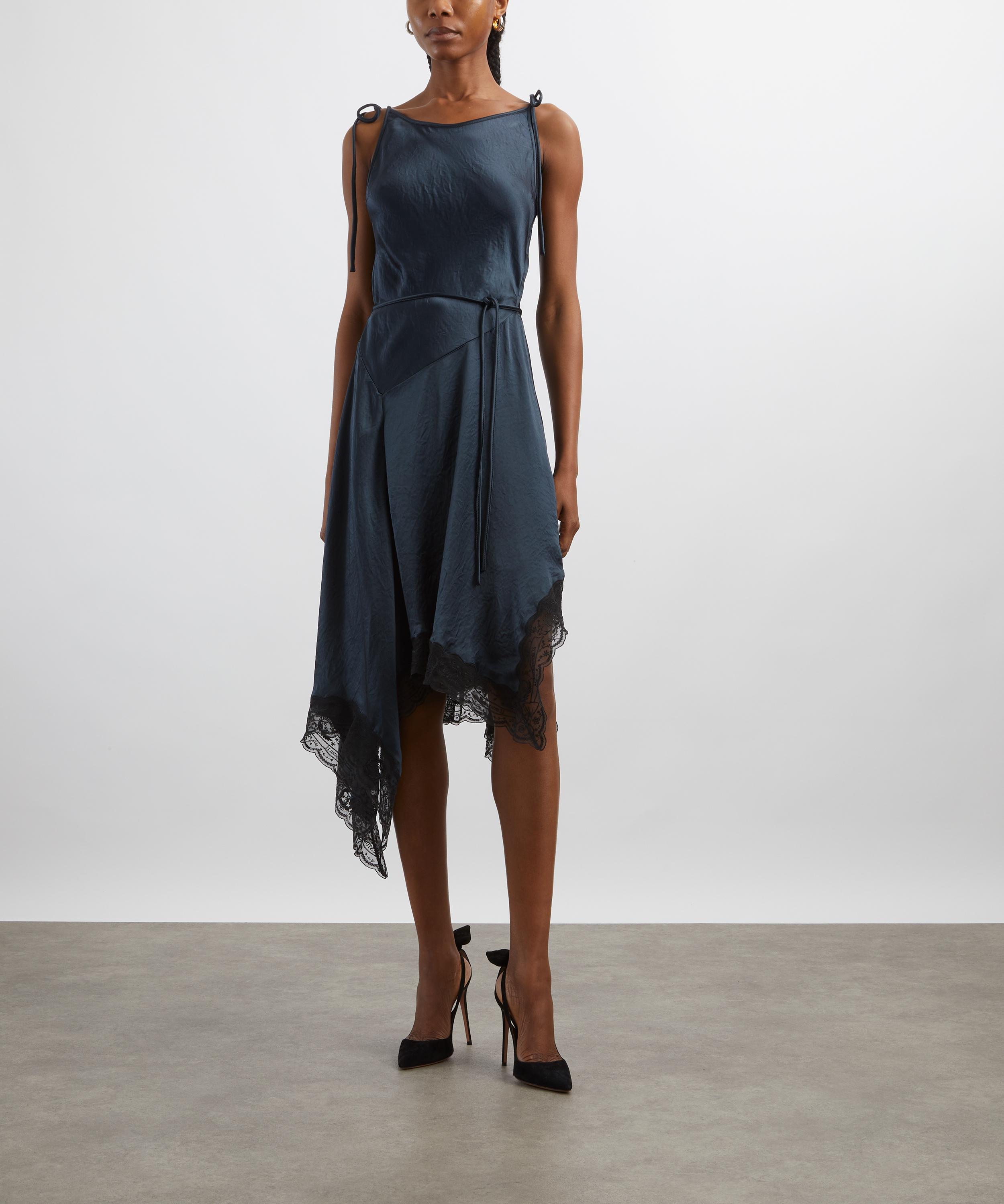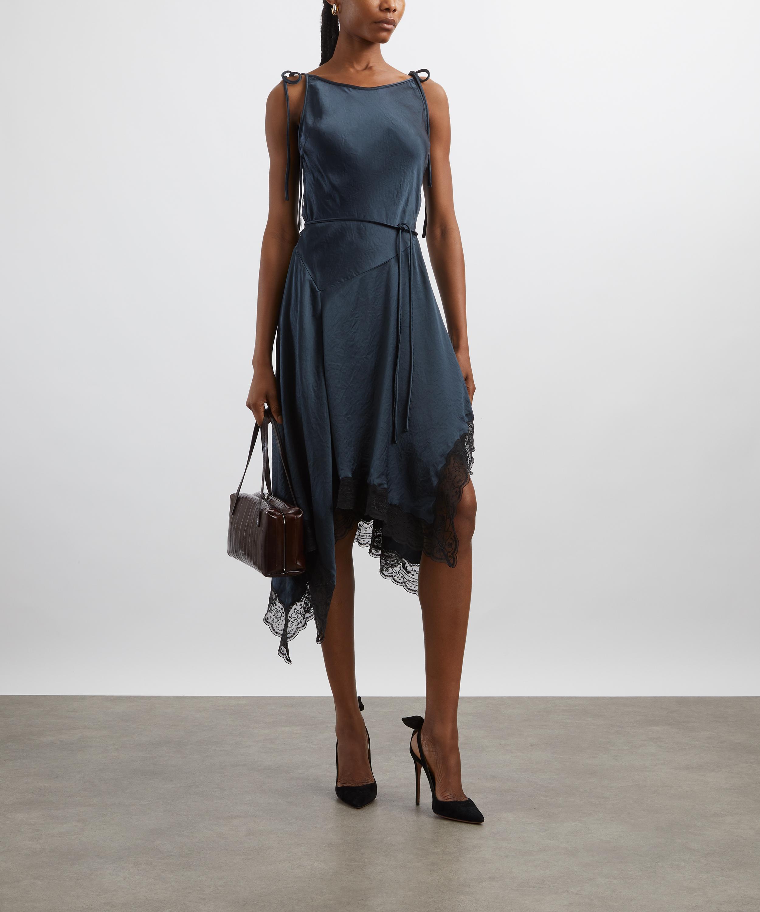 Crafted from fluid satin with a crinkled texture, this bias-cut dress exudes effortless sophistication, featuring a tie-up design and a lace-trimmed asymmetric hem for a touch of delicate contrast.