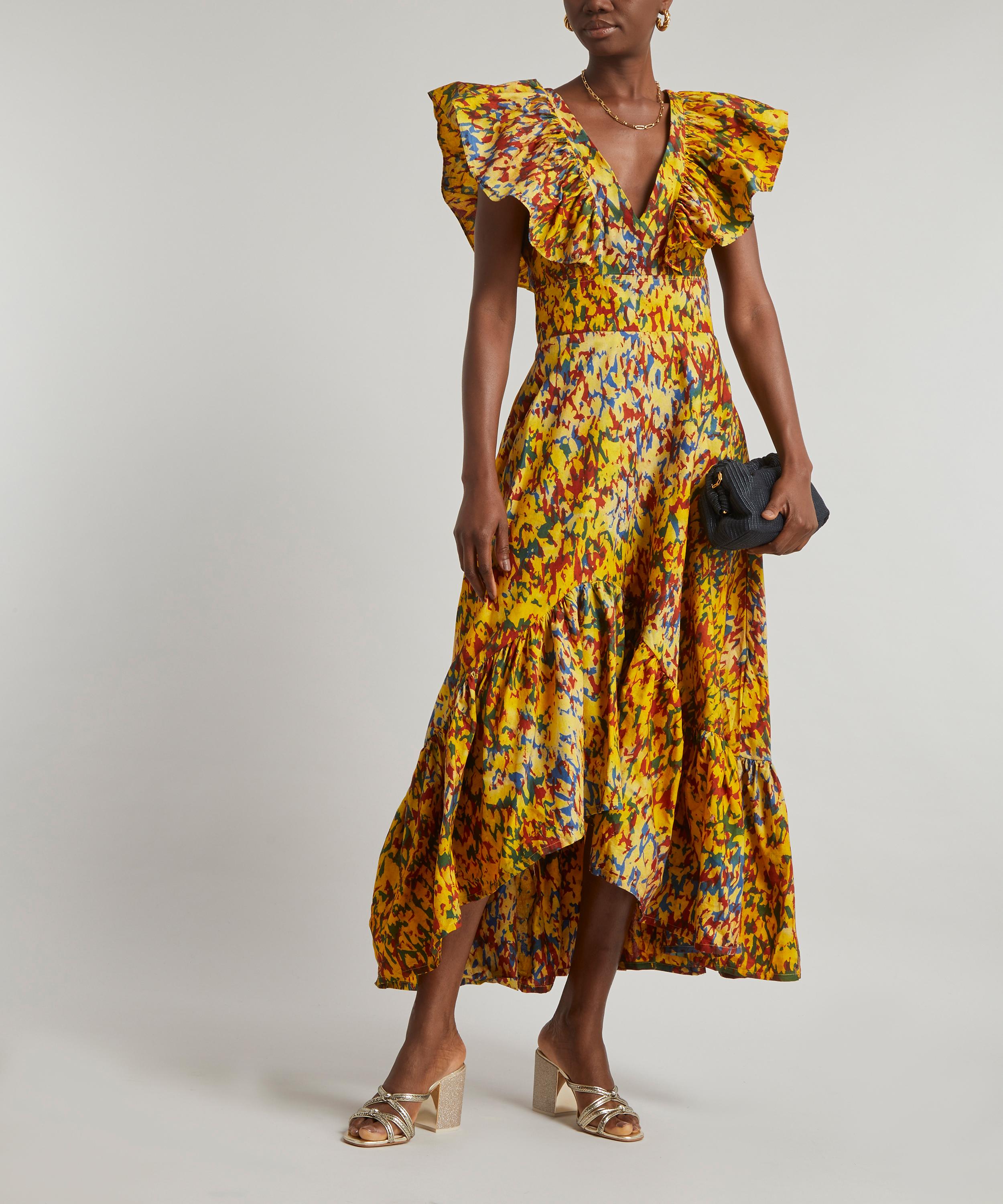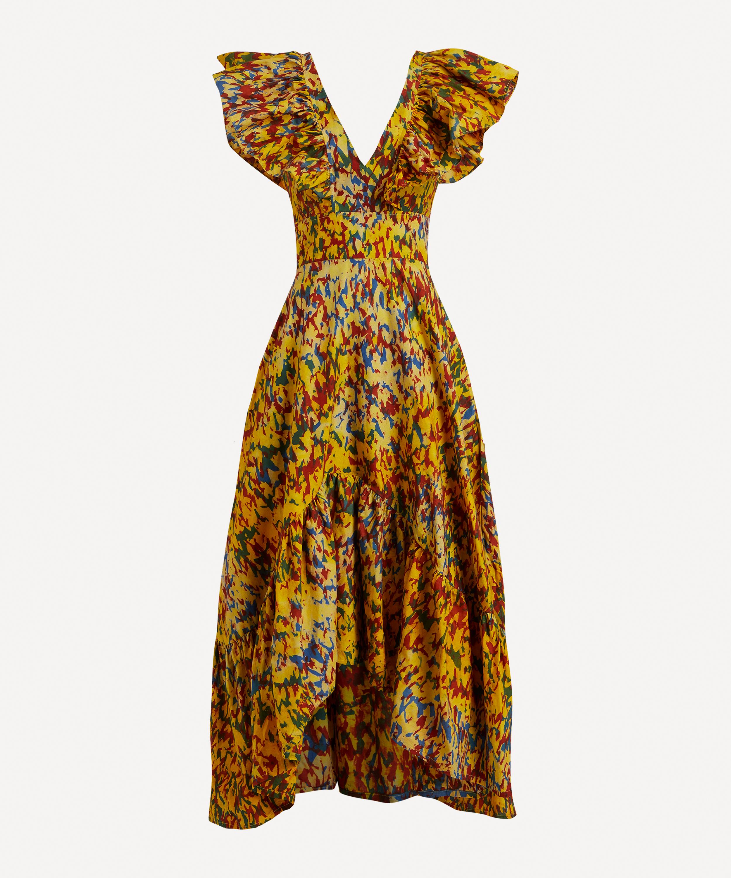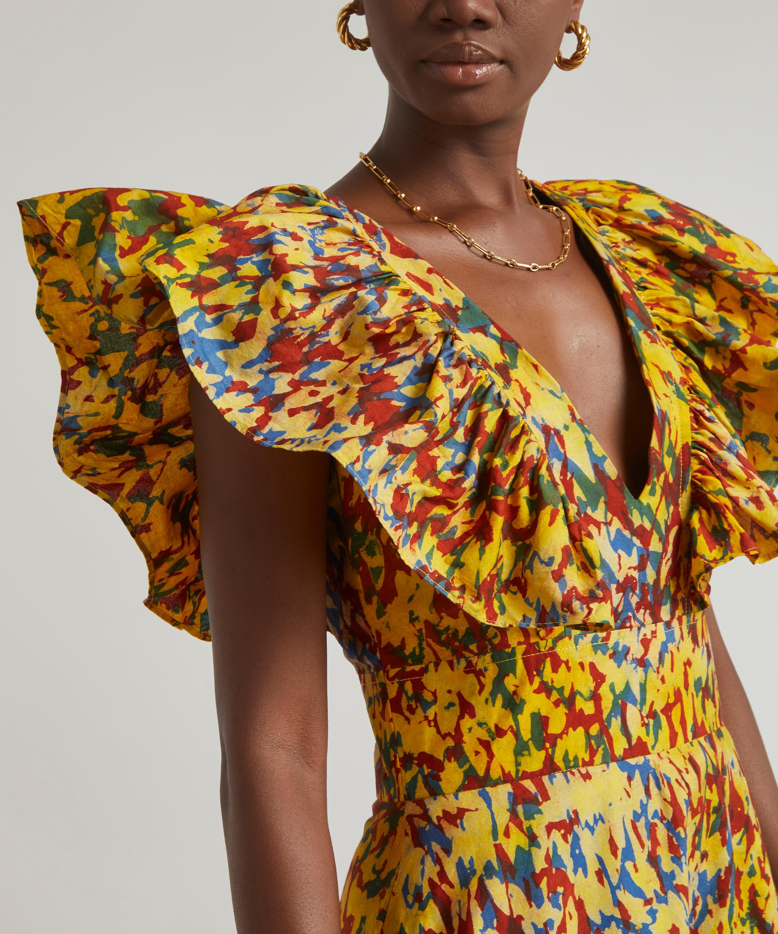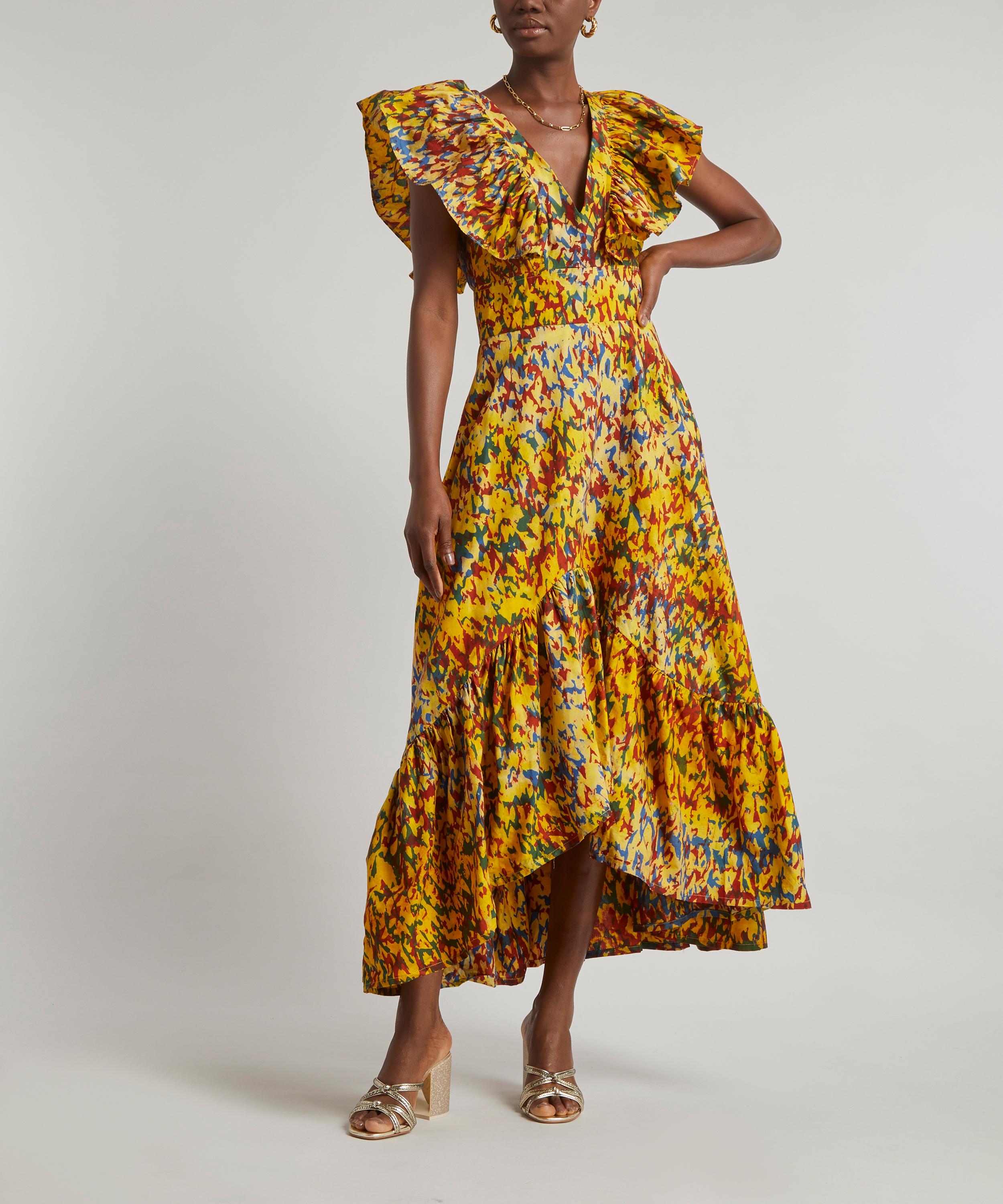 Stylish and sustainably sourced, the Phoenix dress from ethical womenswear label SIKA is expertly hand-made in Ghana. Crafted from cotton in a kaleidoscopic ikat pattern, the Aurora is cut to an elegant midi-length, featuring a fitted waist that falls to a tiered, full skirt with gathered seams for a flowy finish. With a flattering square neckline and a buttoned front closure, its bodice has short sleeves complete with statement-making ruffles. Team it with a simple pair of strappy black sandals for a chic evening edit with an eclectic edge.