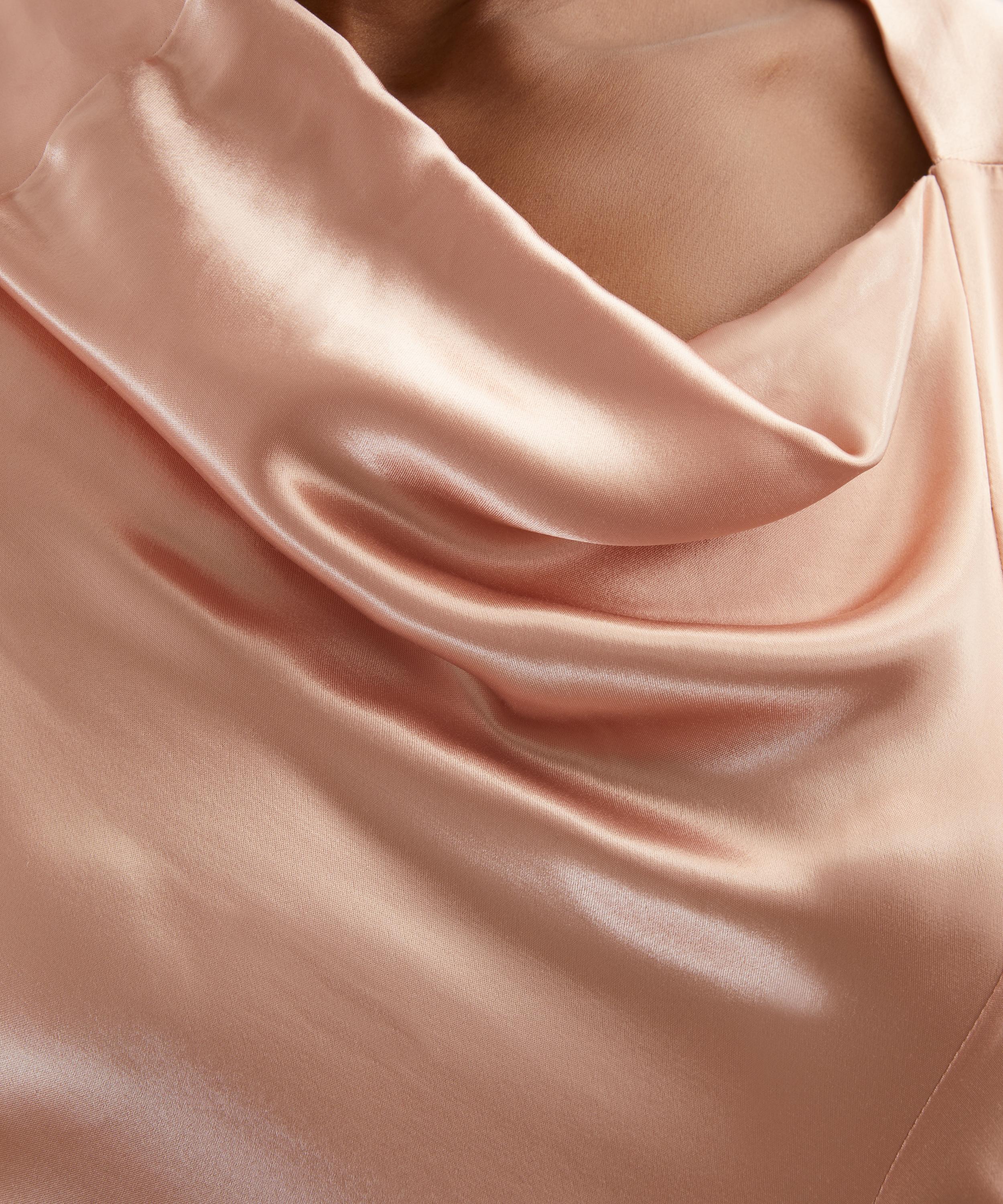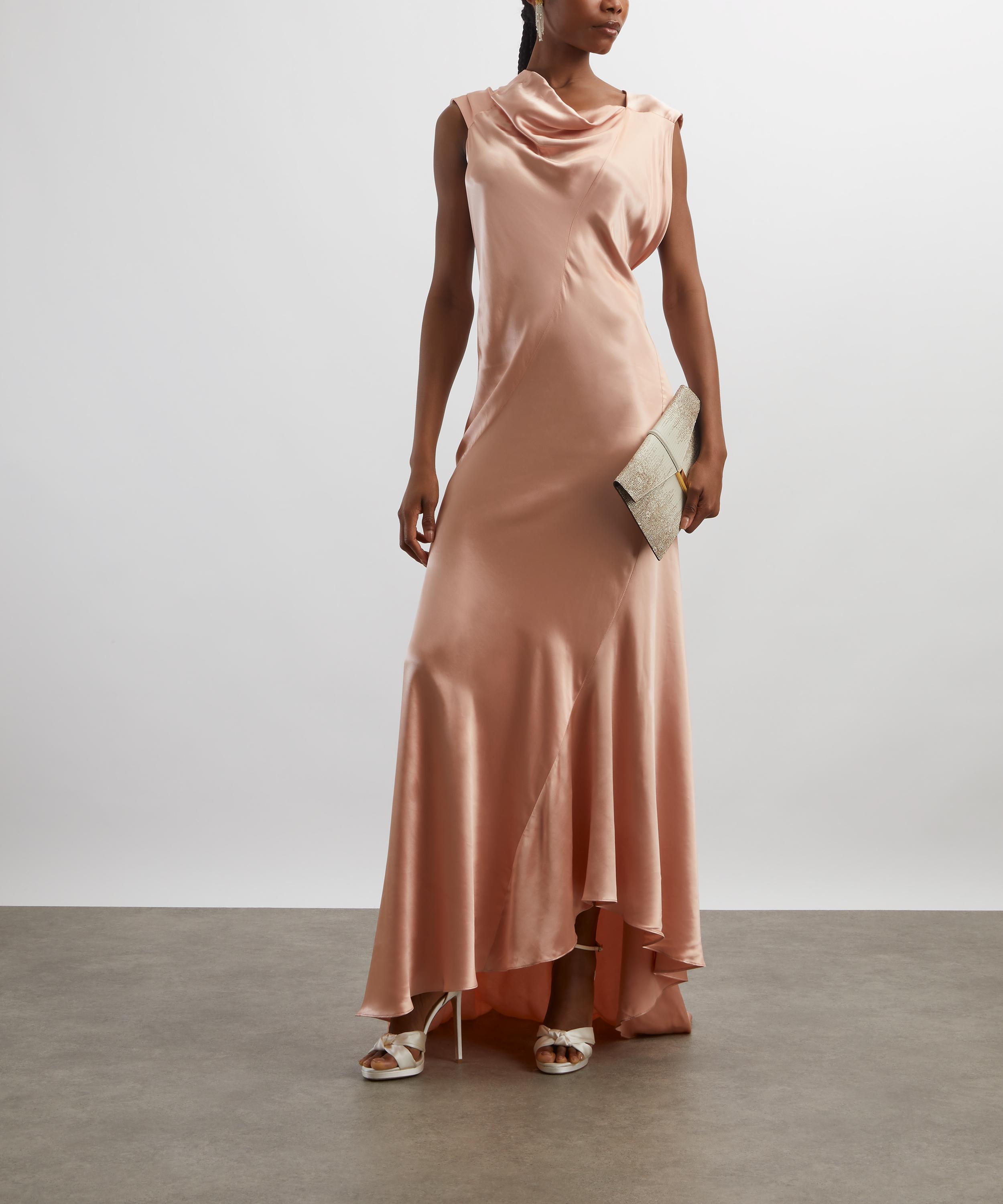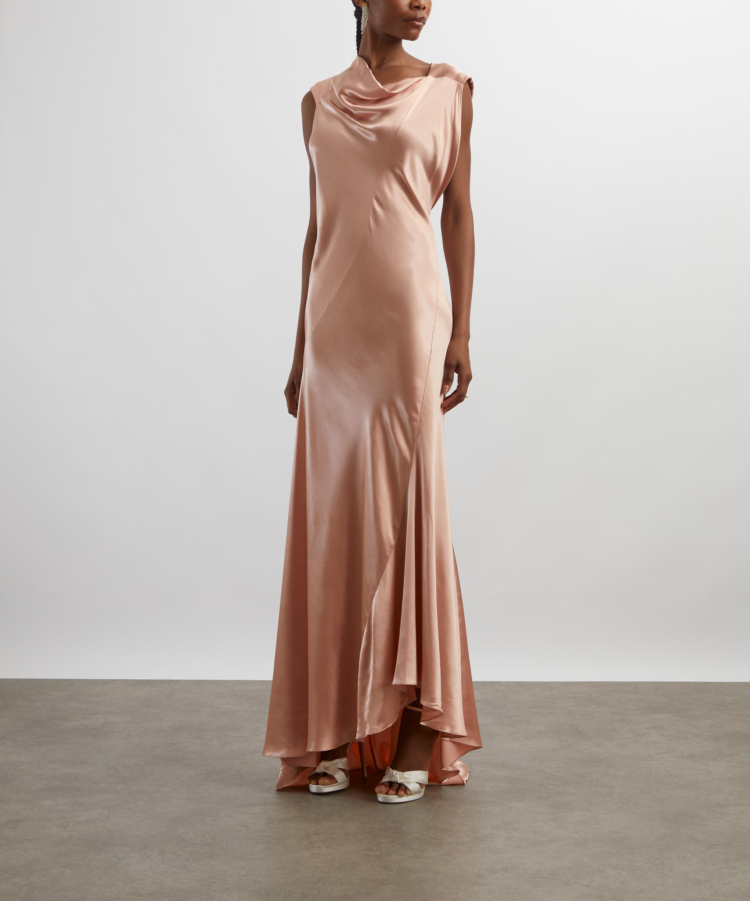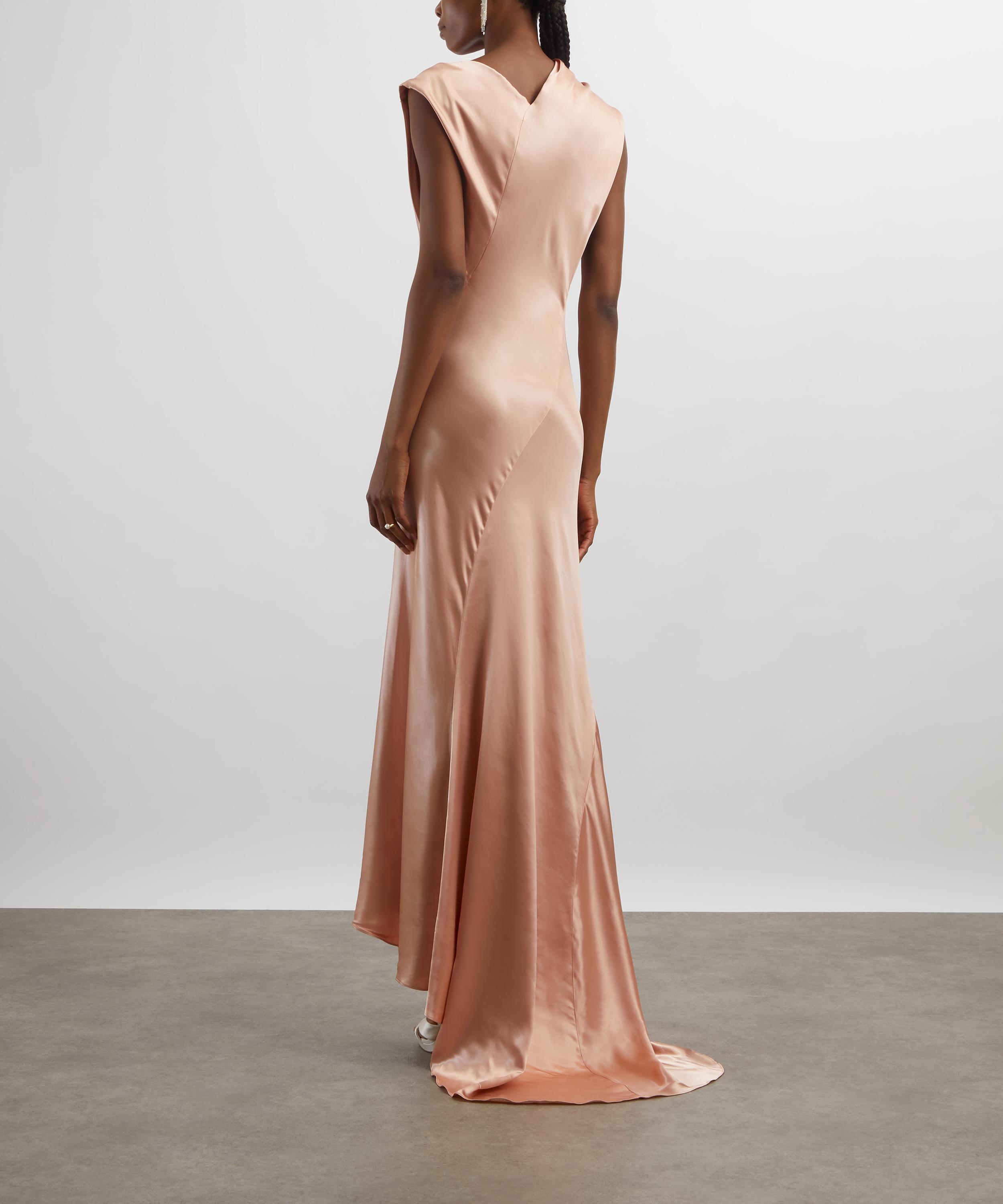 With its sleek satin finish and artful construction, this floor-length dress exudes timeless Italian elegance. Graceful draping and a fluid silhouette are elevated by an asymmetric neckline, while a trailing train enhances its dramatic appeal.