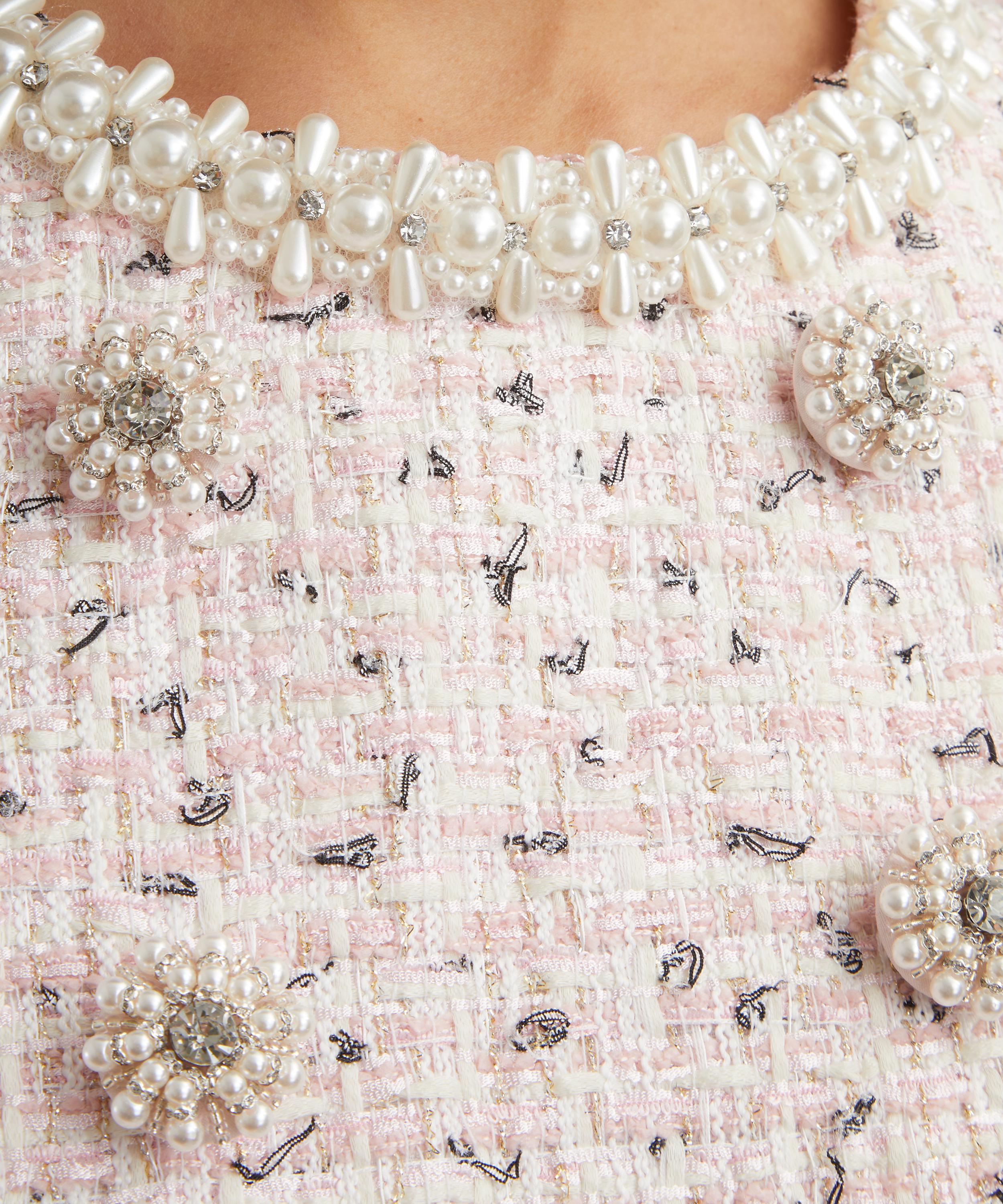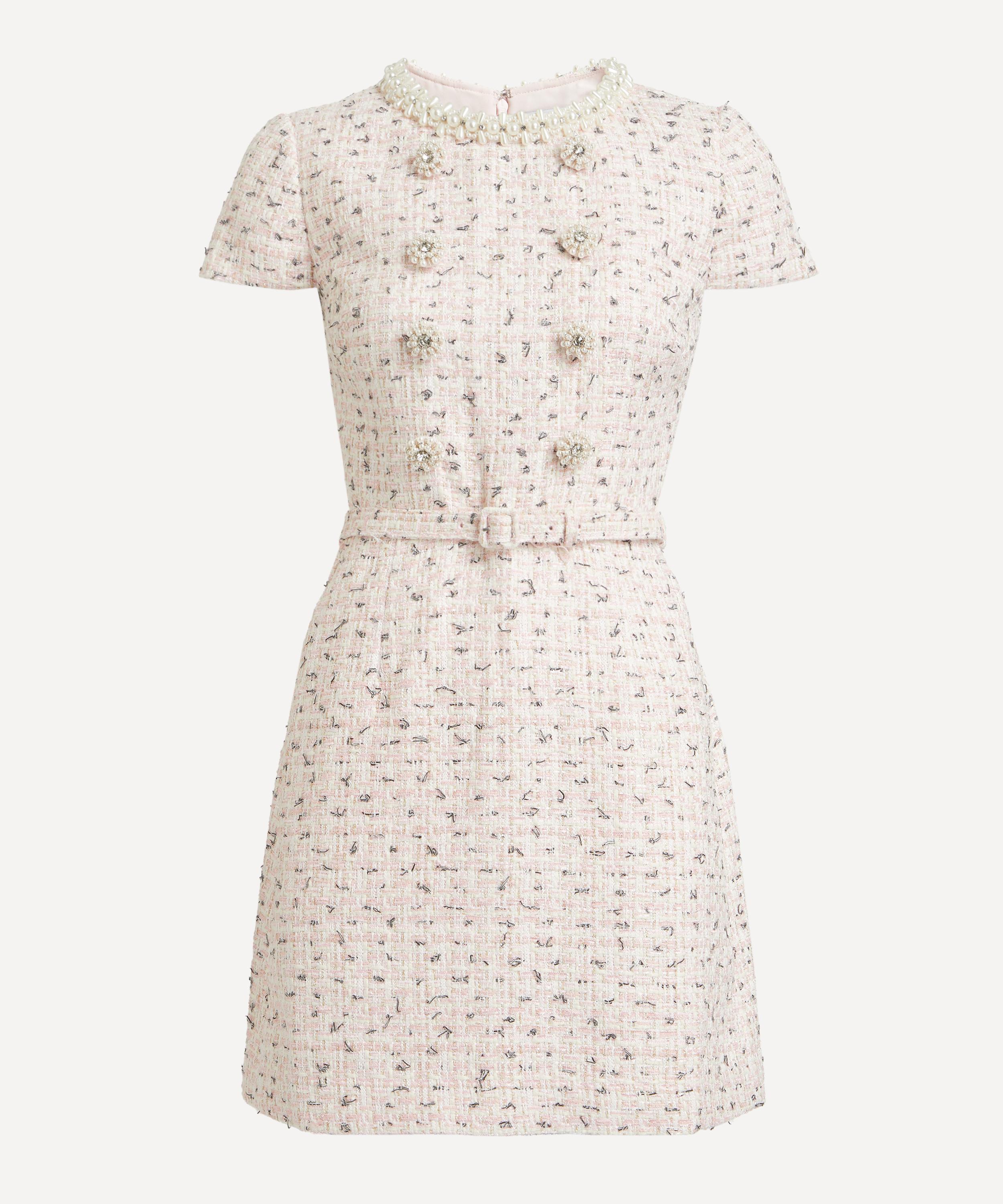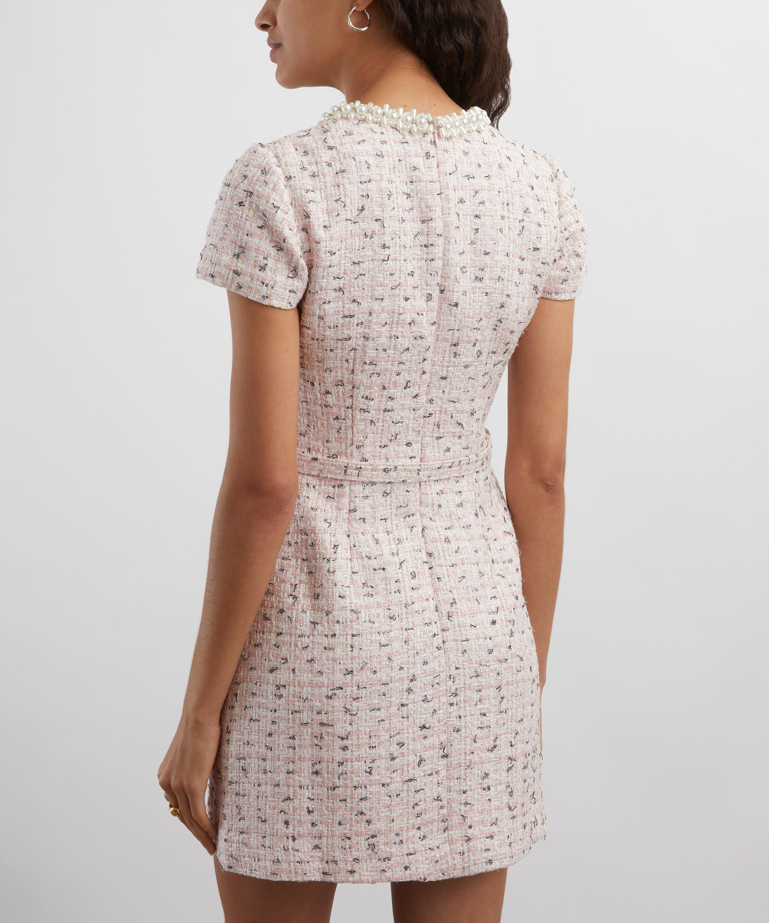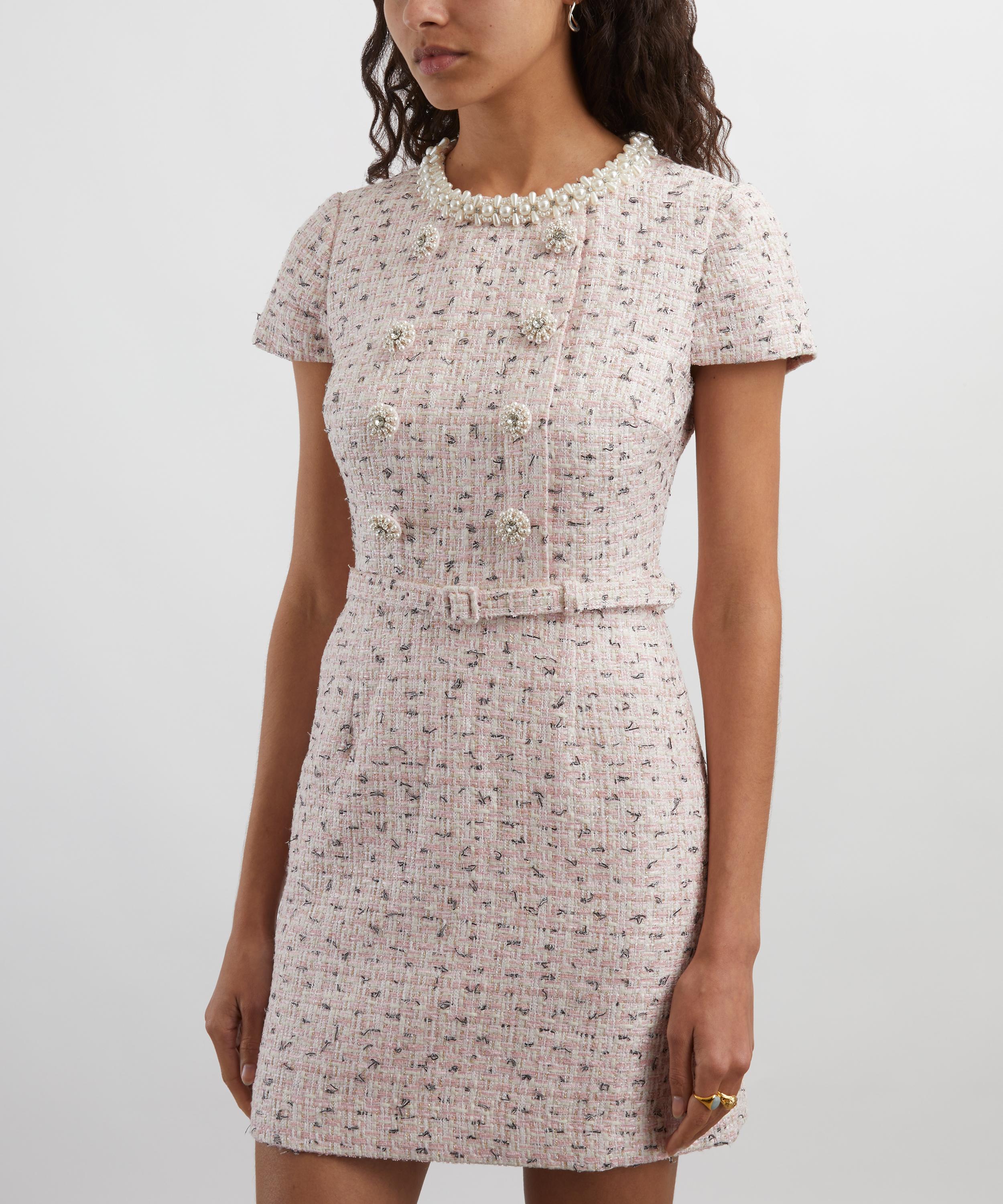 Timelessly chic, this pink bouclé mini dress is tailored to flatter with a cinched waist, while pearl trims and diamanté buttons lend a touch of refined glamour.