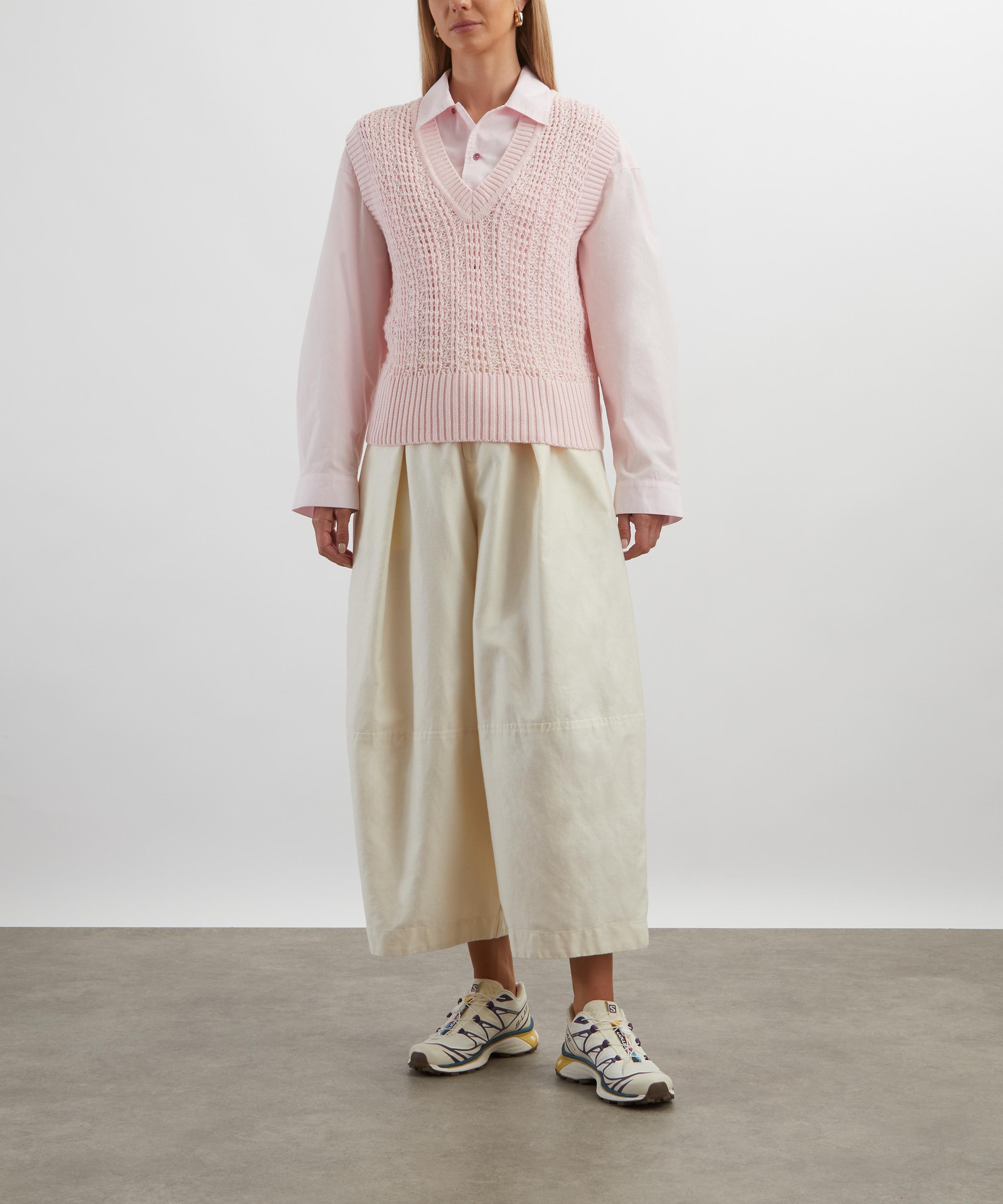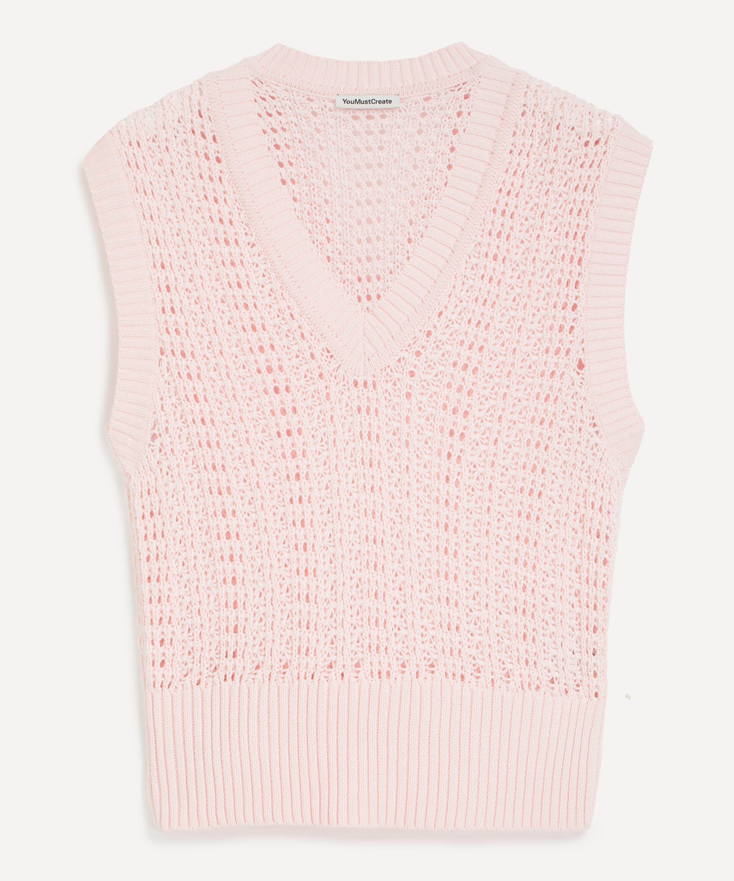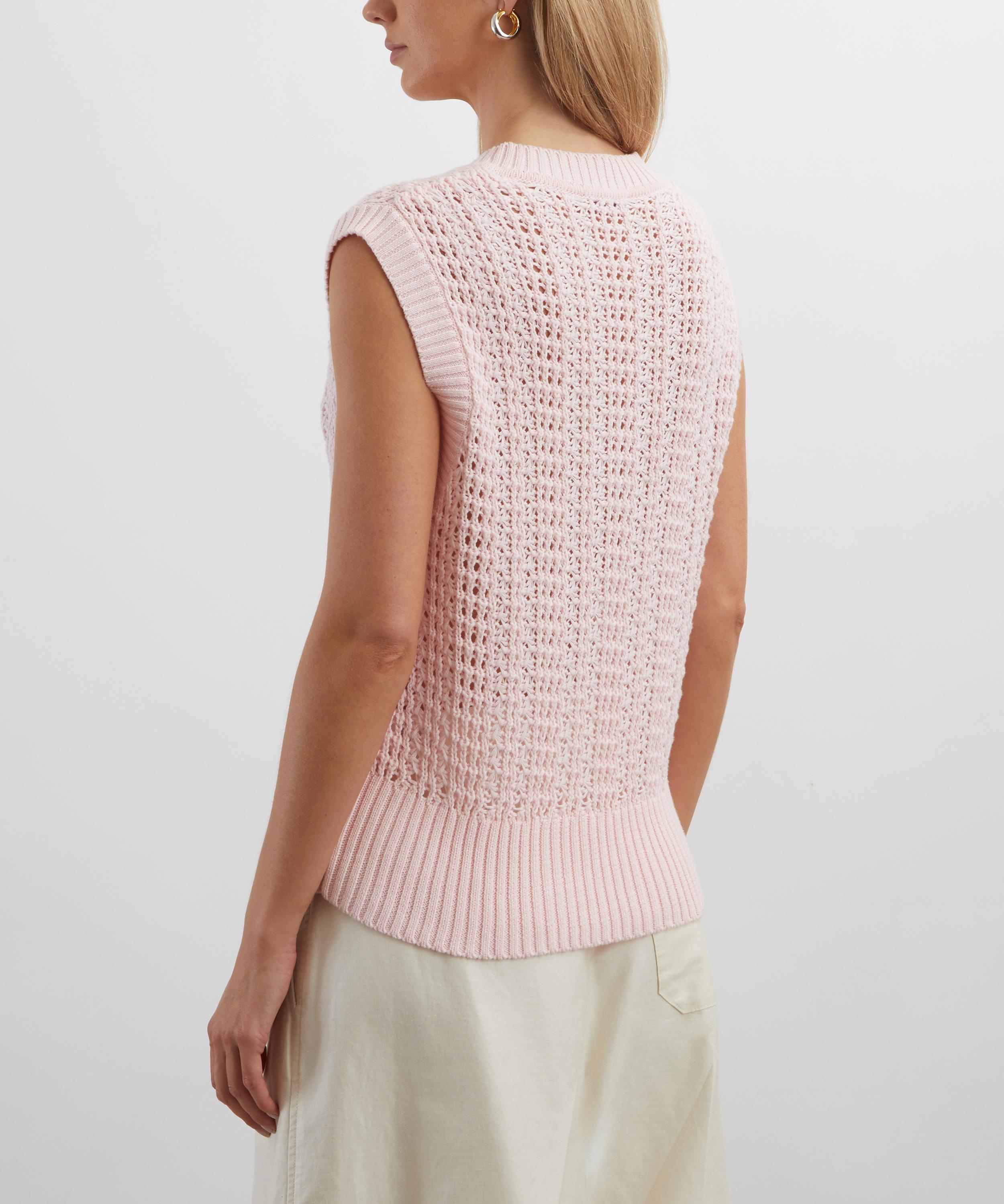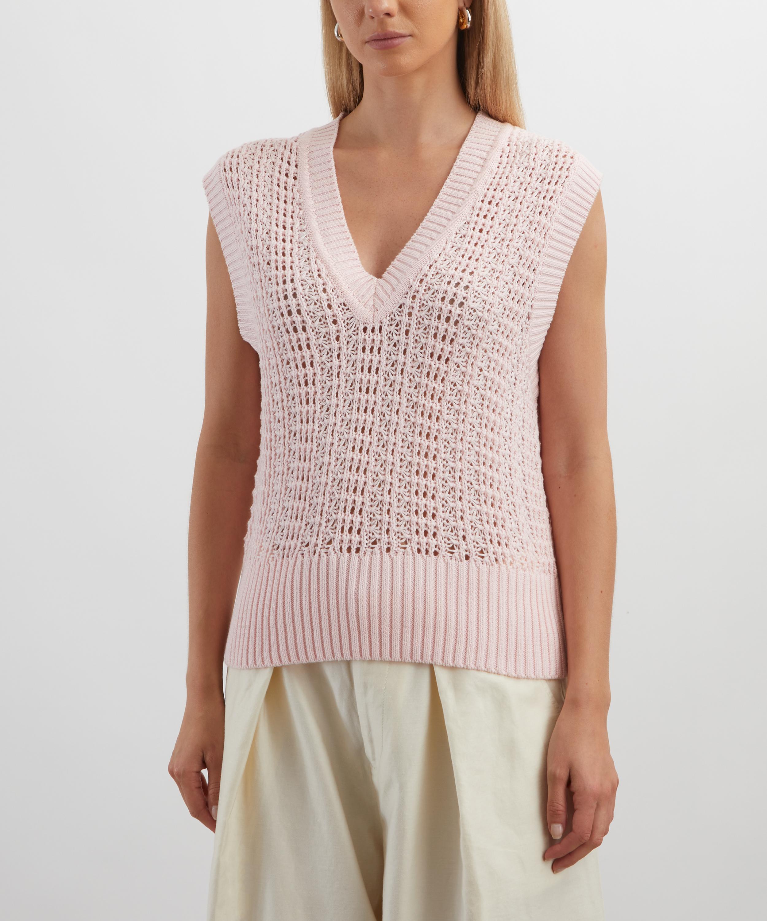 Knitted from lightweight cotton yarn, this pink V-neck vest features ribbed trims, and an intricate ladder-stitch construction for a delicate, airy finish.