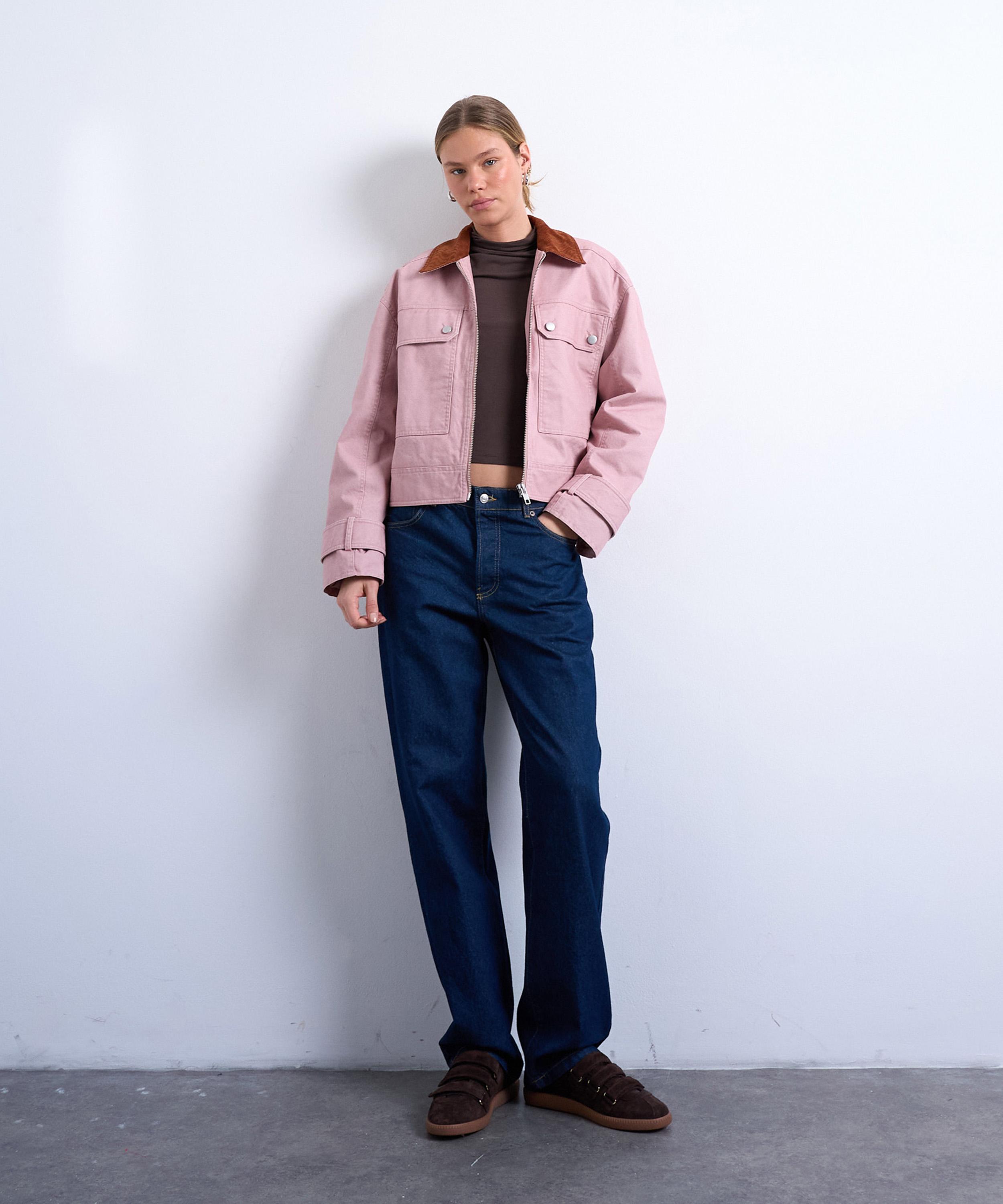 Crafted from pale pink non-stretch denim, this barn jacket takes cues from classic utilitarian styles, featuring a contrast cord collar, zip closure, sleeve loops, and large bellows chest pockets.