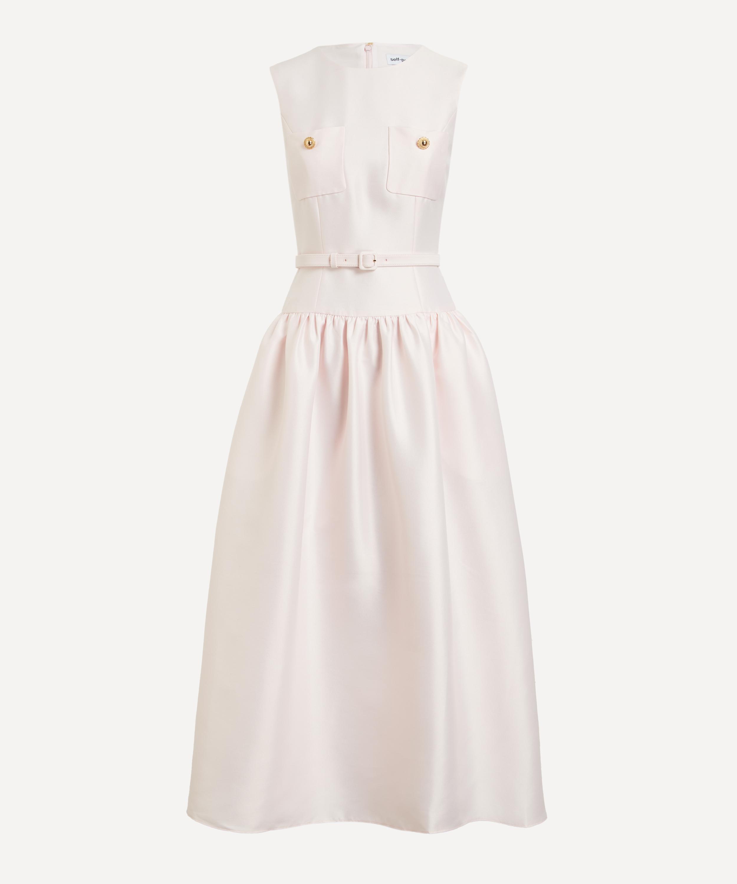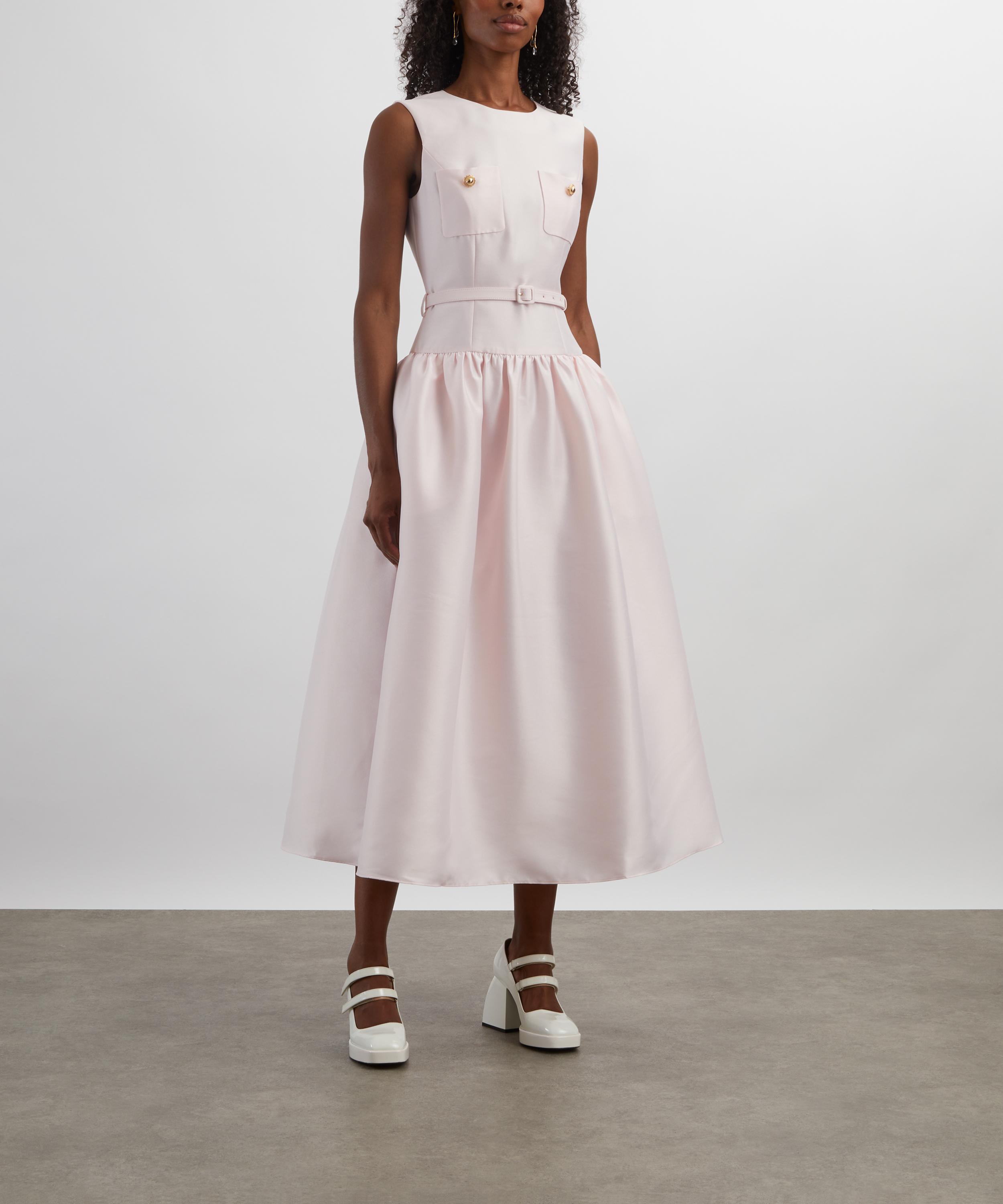 A romantic vision in pink, this taffeta midi defines elegance with its dropped waistline and full skirt, complemented by gold buttons and a belted waist for a polished, premium look.