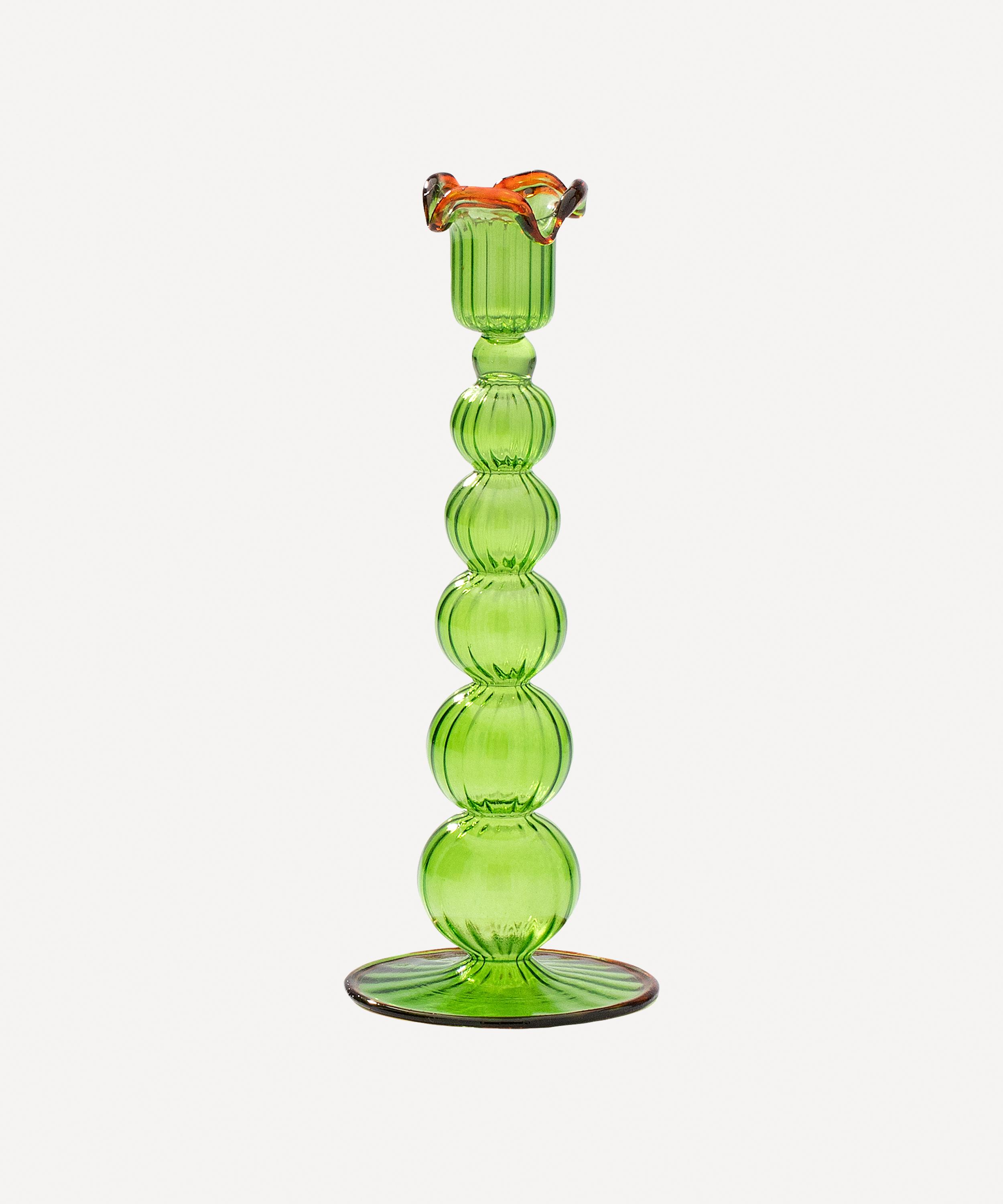 With its undulating spherical form, this elegant candle holder is the perfect accessory to burn a long, flickering taper. Characterised by a sense of wonder and whimsy which stems from the designers’ global travels, the ribbed green glass is finished with subtly contrasting orange edging. Pair with other candle holders from the collection for an eclectic dining arrangement, or place on a dresser as an atmospheric party accent.