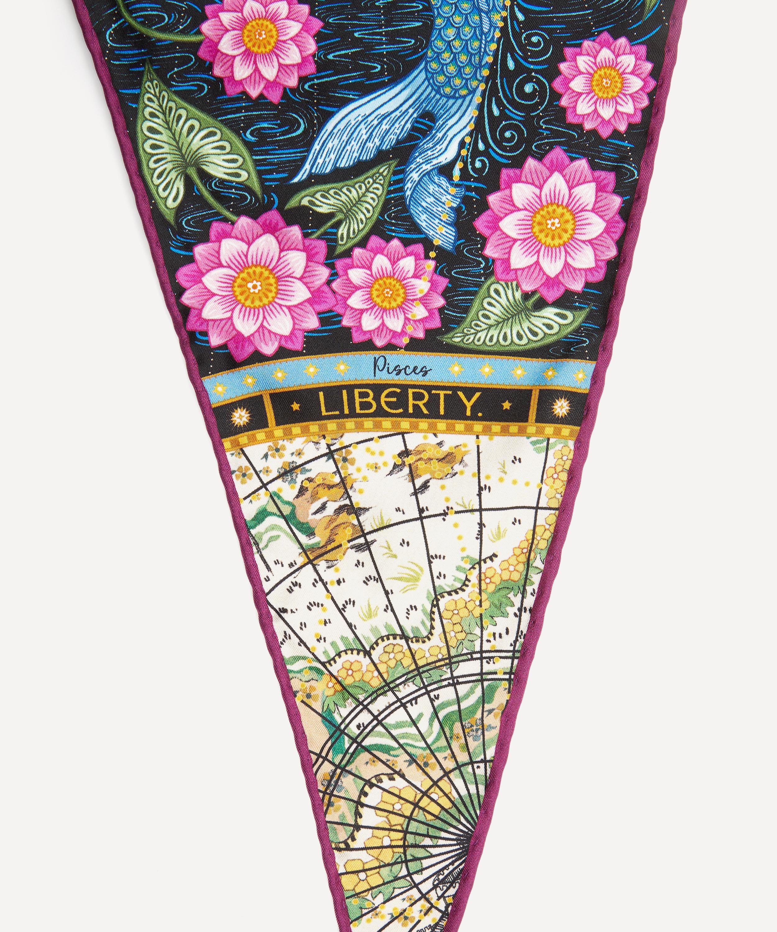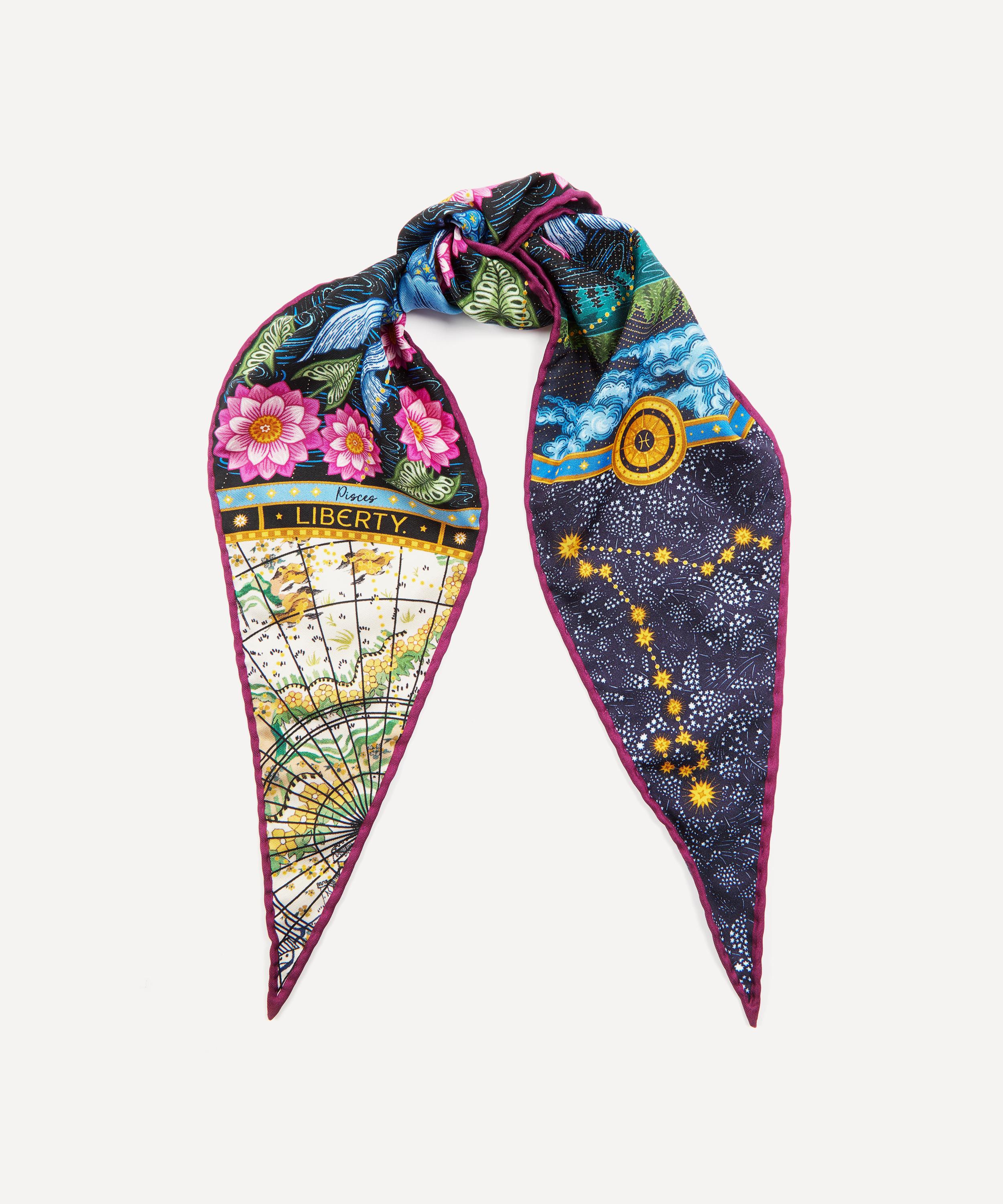 Liberty’s exclusive Celestial series spotlights each of the astrological signs within a luminously moonlit skyscape. Exquisitely made and printed in Italy on 17mm silk twill, each design appears on a striking lozenge silhouette. When combined, the full set of scarves make up a star-shaped map of the sky, united by the islands of an imagined globe beneath. Wear your sign with pride as a head band, scrunchie or neckerchief, for a flash of cosmic print magic – heaven-sent as a birthday gift for someone special, or a treat for yourself.
