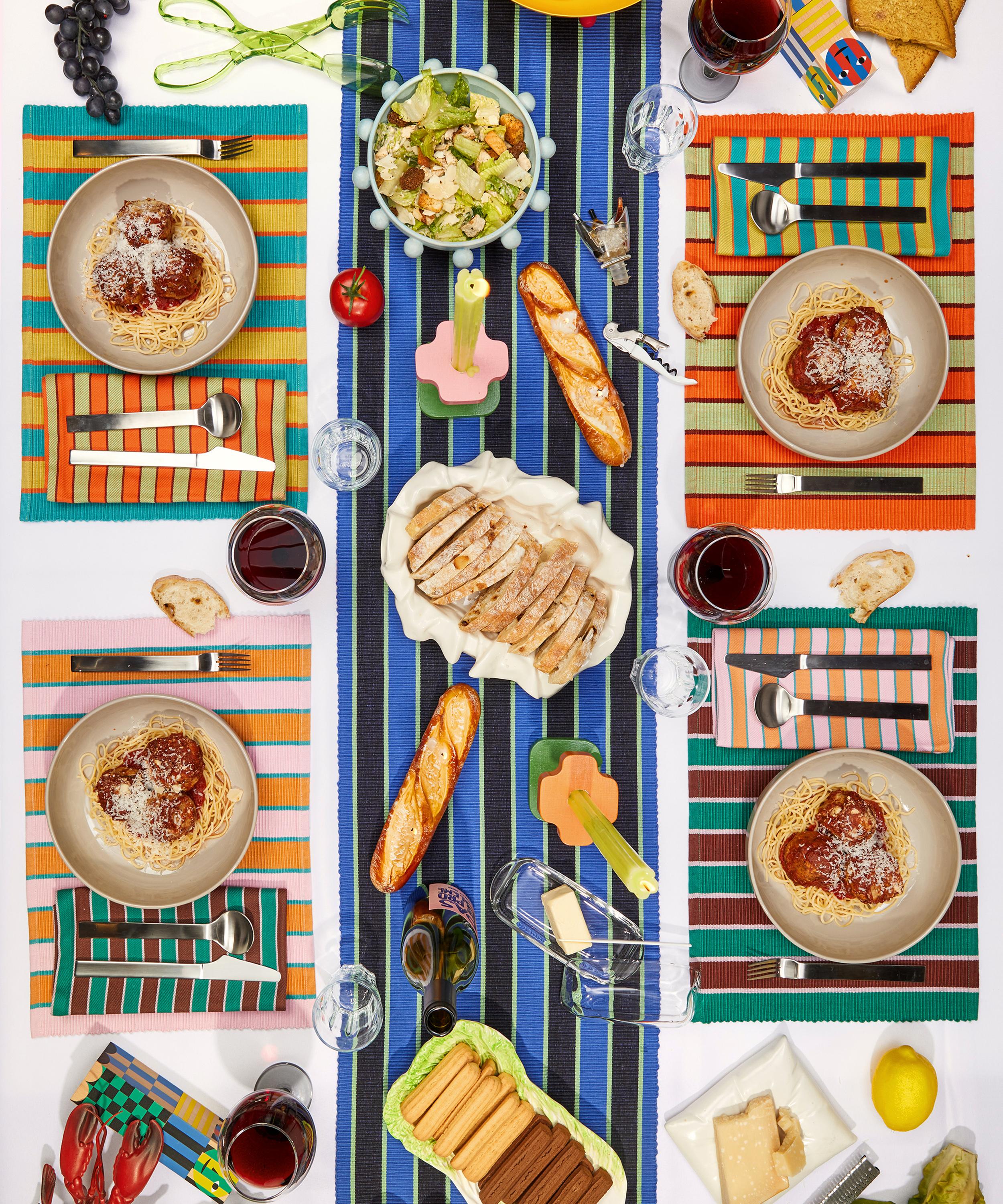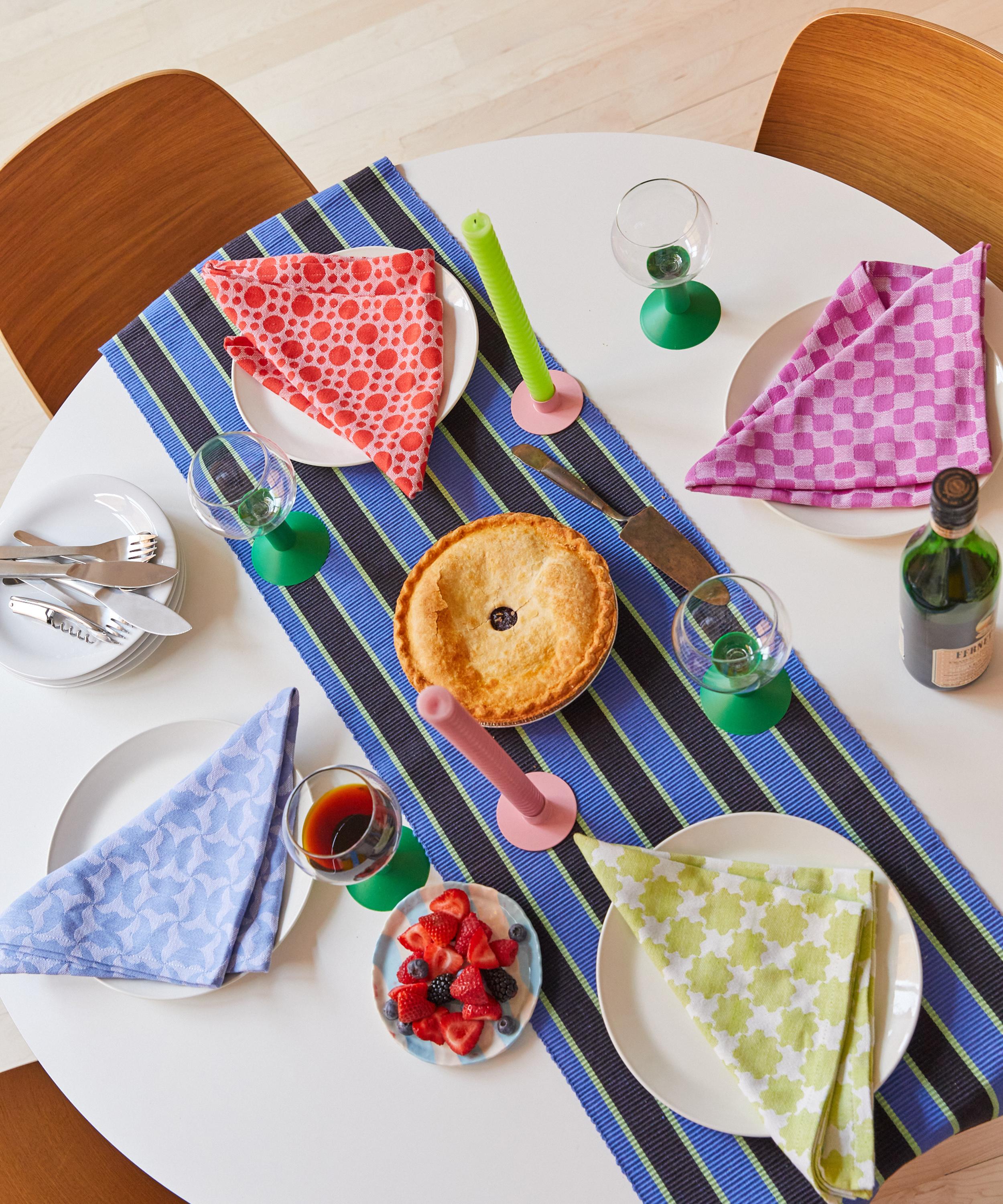The Pistachio Stripe table runner from Dusen Dusen brings a charming dose of pattern to your table setting, perfect for pairing with mismatched placemats and napkins for a lively, eclectic flair.