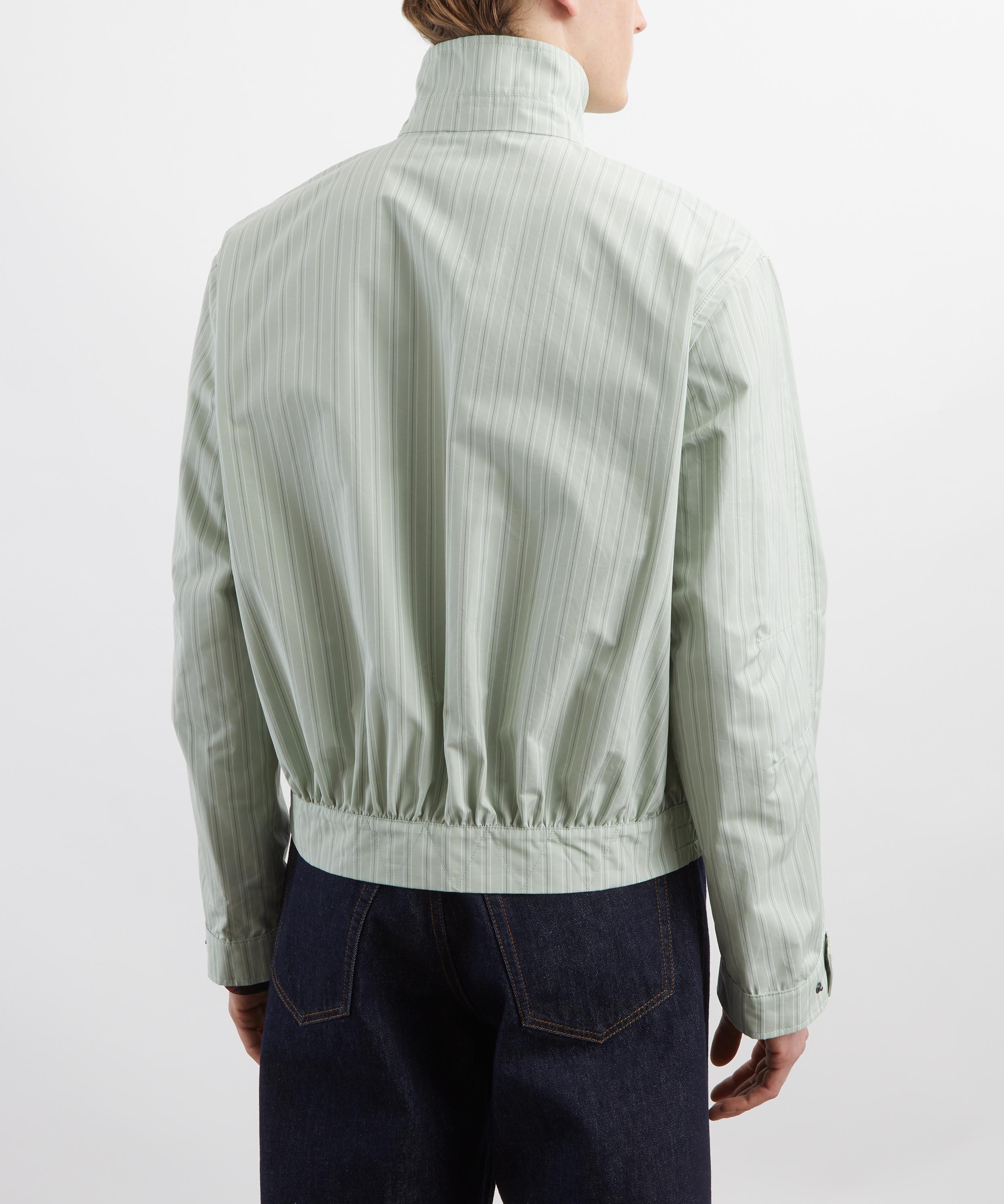 Crafted from crisp cotton with pistachio-green stripes, this lightweight jacket draws inspiration from classic bomber styles, featuring a snap-fastened high collar, two-way zip, and elasticated hem.
