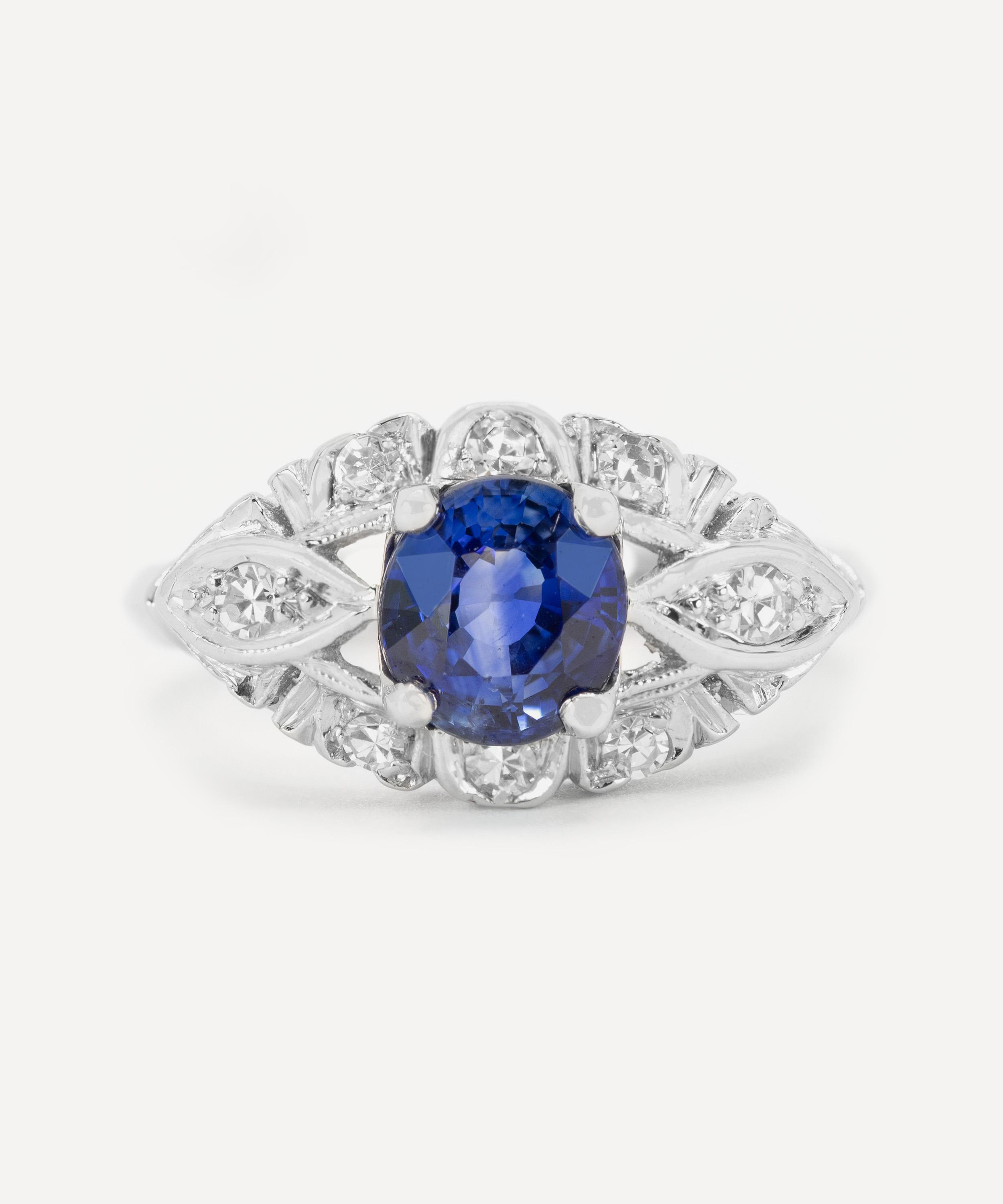 This show-stopping Art Deco ring from antique purveyor Kojis is set with a single blue sapphire and approximately 0.34-carats of dazzling white diamonds.
