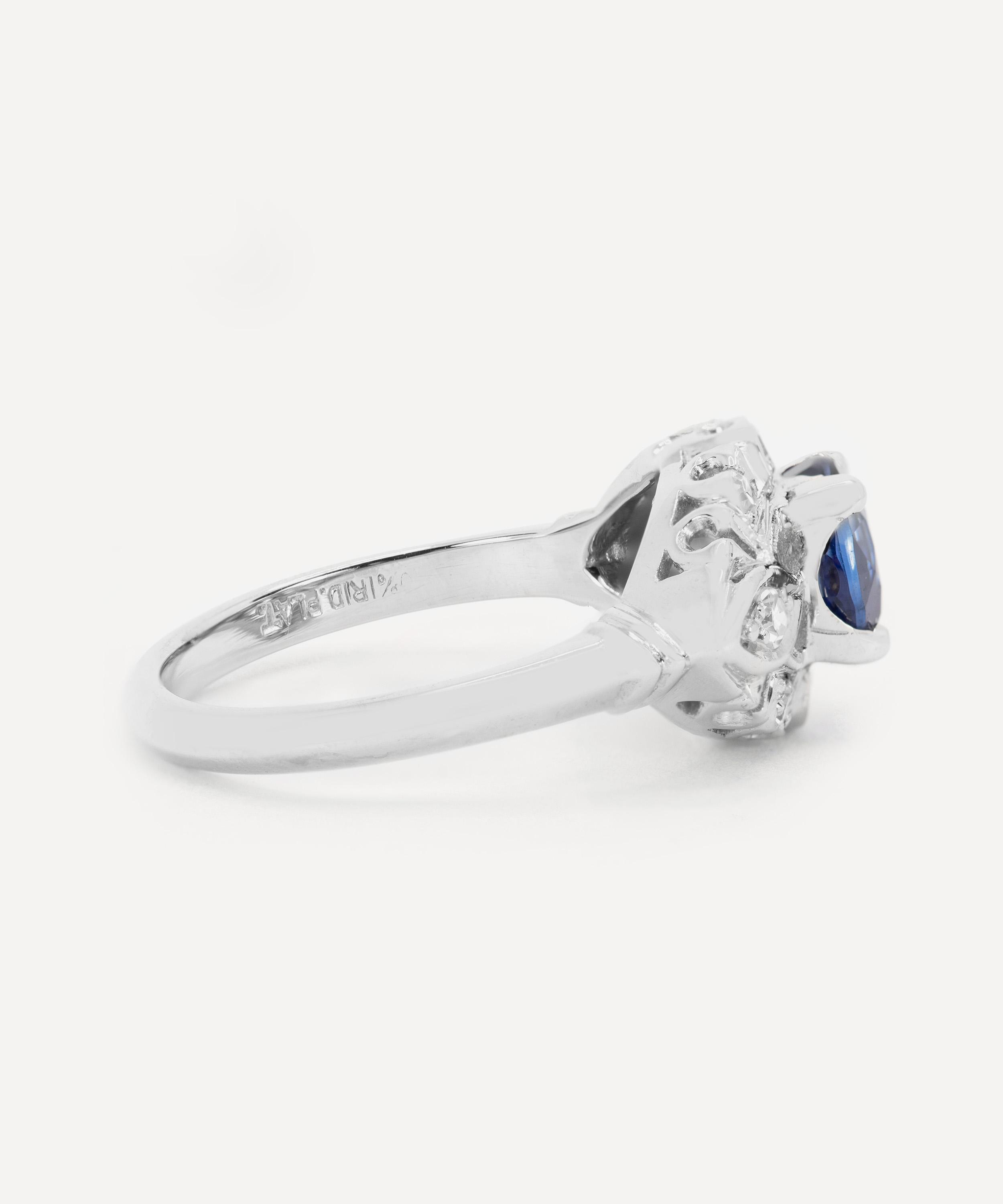 Crafted from solid platinum, this ring features a deeply saturated blue sapphire, set in the centre of a lozenge shaped cluster. The cluster is decorated with open work metal and ten single cut diamonds, set with a milgrain finish. A stunning example of Art Deco in all of its decadent glory, it is a truly timeless addition to any collection - wear it alone to showcase its unique brilliance and watch it become the focal point of your next special occasion look.