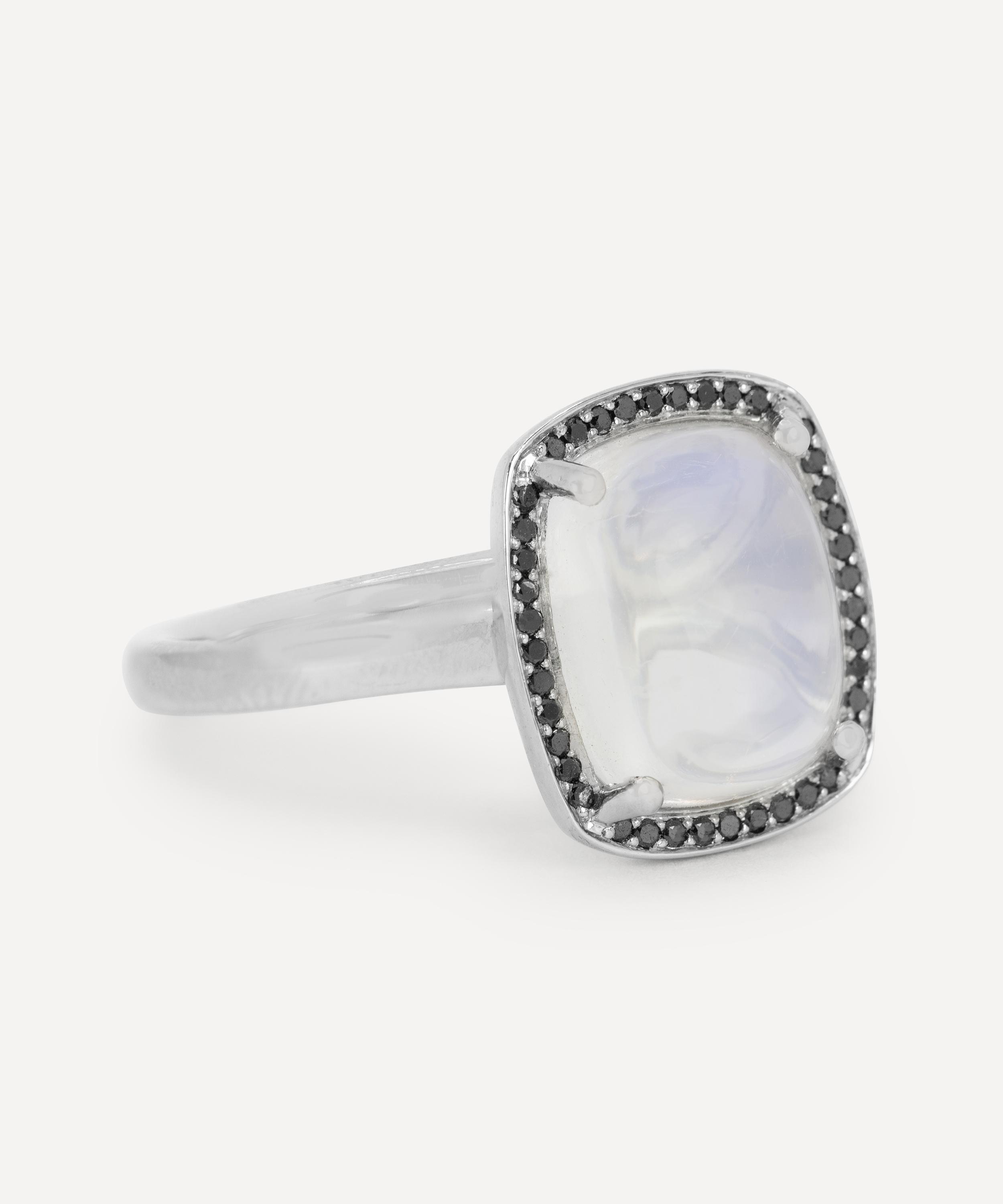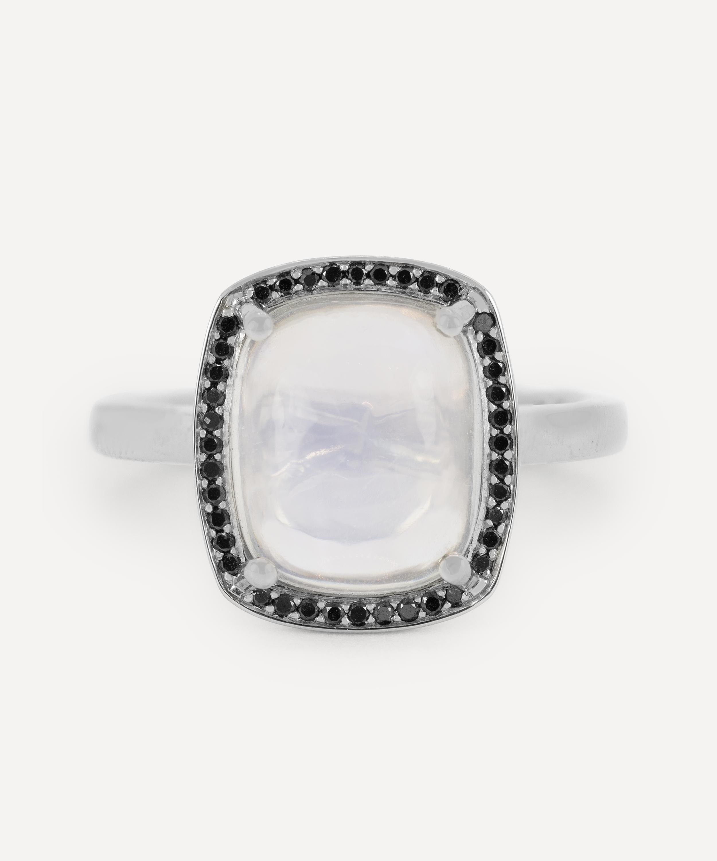 This platinum cluster ring from antique purveyor Kojis is set with glittering black diamonds and a large, ethereal moonstone.