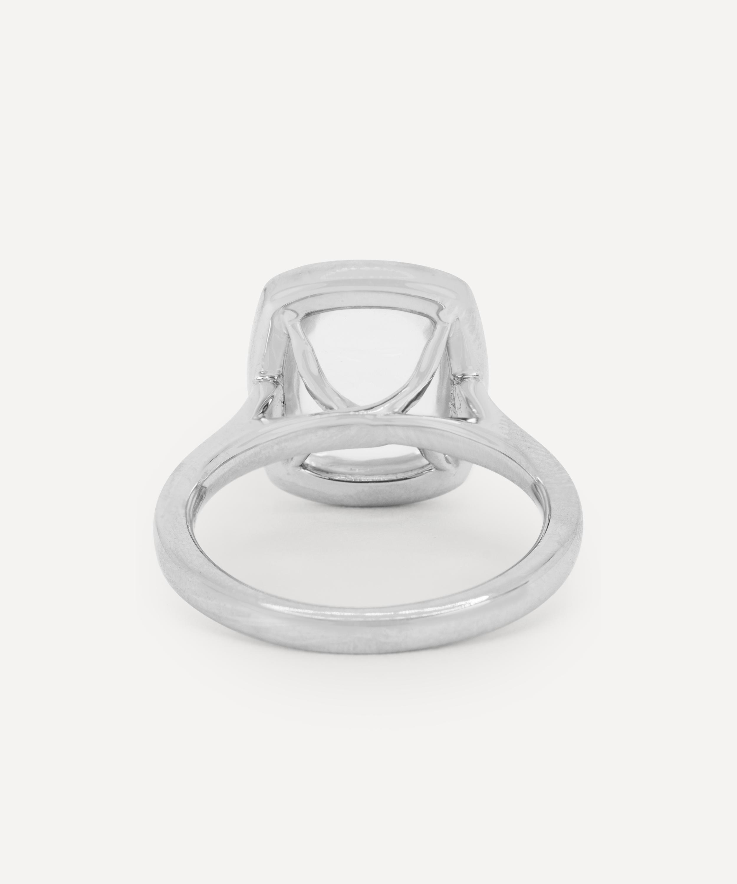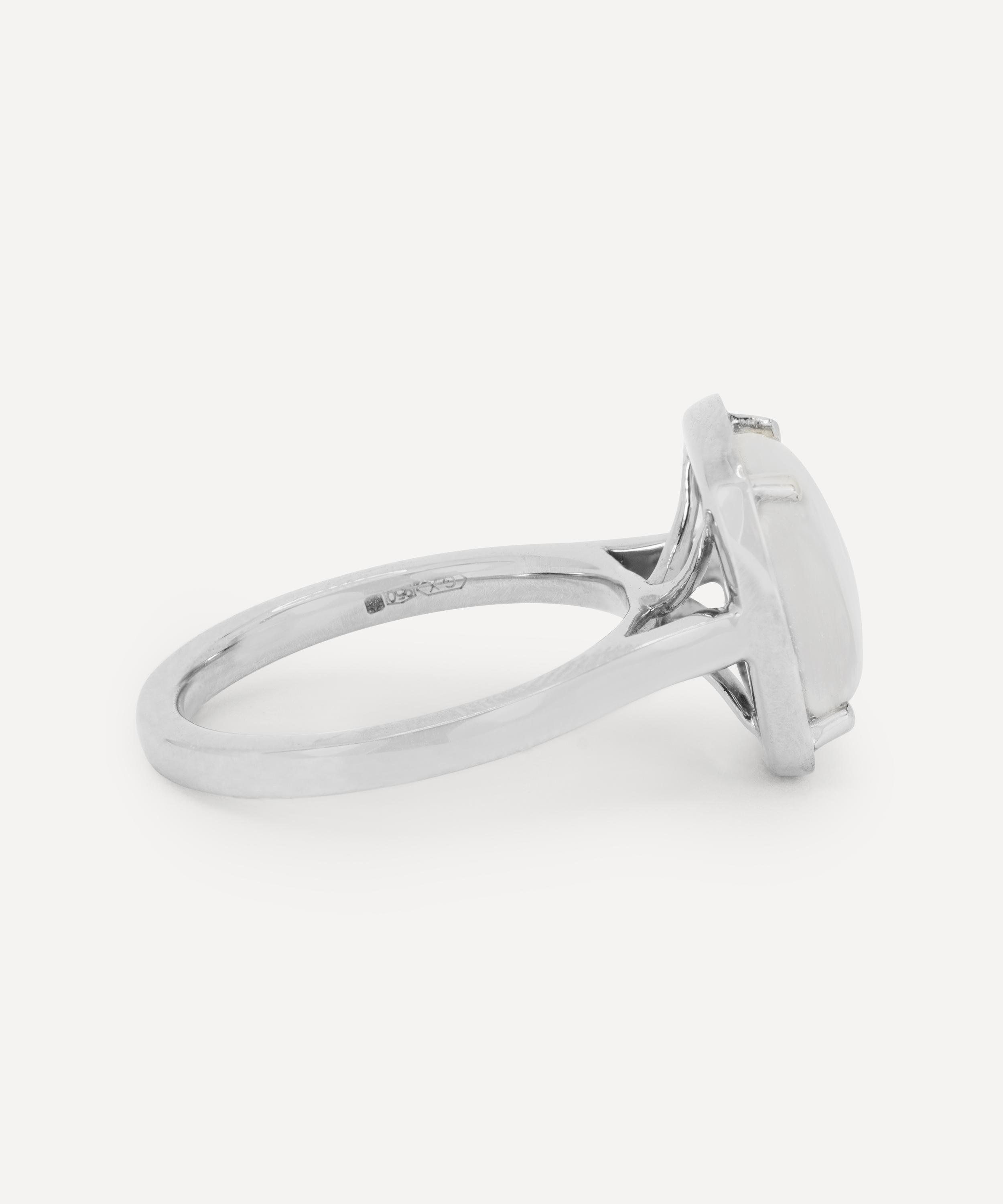 Crafted from solid platinum, this ring features a large, rectangular cabochon cut moonstone displaying a light blue adularescence surrounded by 40 round, brilliant cut black diamonds, pavé set in platinum. Presented on a slim, polished band, it offers a modern alternative to the brand's signature elaborate antiques - perfect as an alternative engagement ring or a timeless addition to your everyday jewellery line-up.
