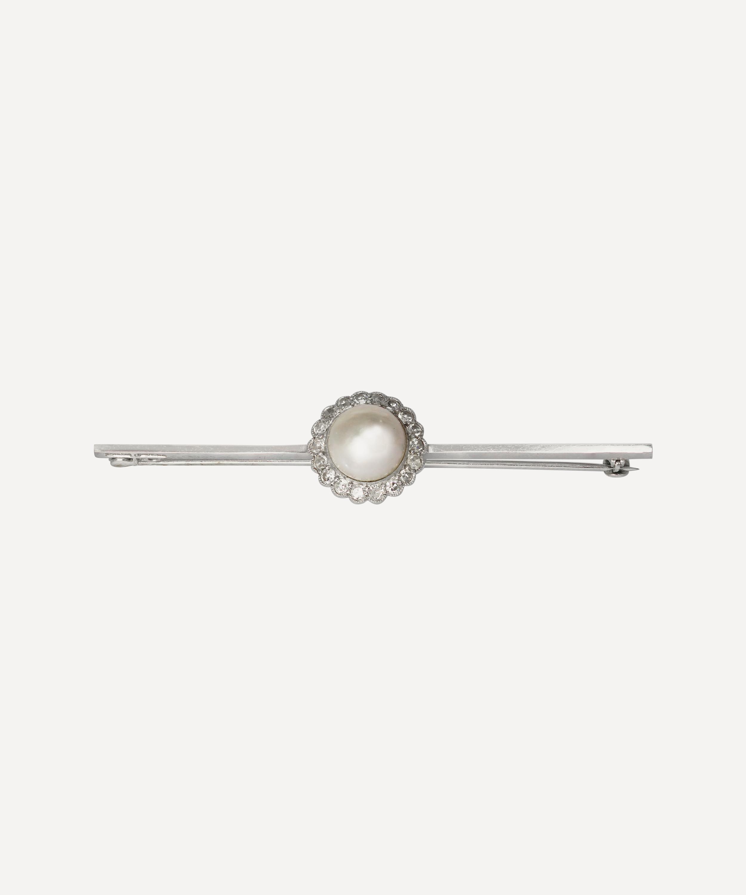 Crafted from 18 carat gold topped with platinum, this sleek bar brooch features a large daisy-inspired cluster with a lustrous mabé pearl centre and an array of single cut white diamonds in milgrain bezel settings around the edge. The ideal gift for an avid antique collector, it's perfect for adding a touch of sparkle to evening looks - team it with several other gem-encrusted brooches and pins for a playful take on traditional formalwear.
