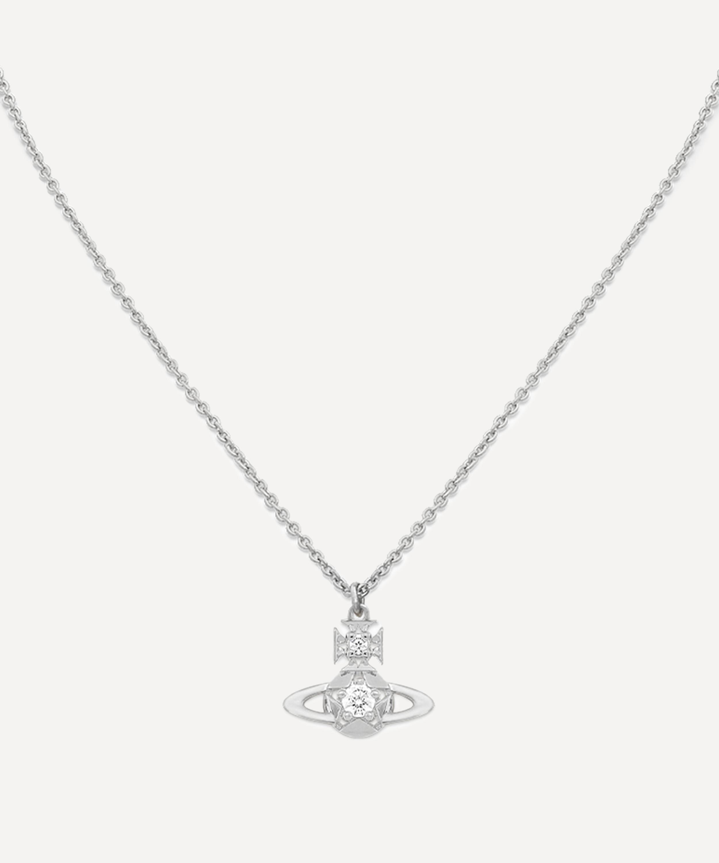 Channelling the brand’s rebellious spirit and individuality, it’s crafted from platinum-tone brass, featuring a fine trace chain and the house’s iconic cross-topped orb and saturn ring pendant, set with cubic zirconia. Wear this statement-making necklace on its own, incorporate it into a stack, or pair with matching pieces from the brand for a co-ordinating look.