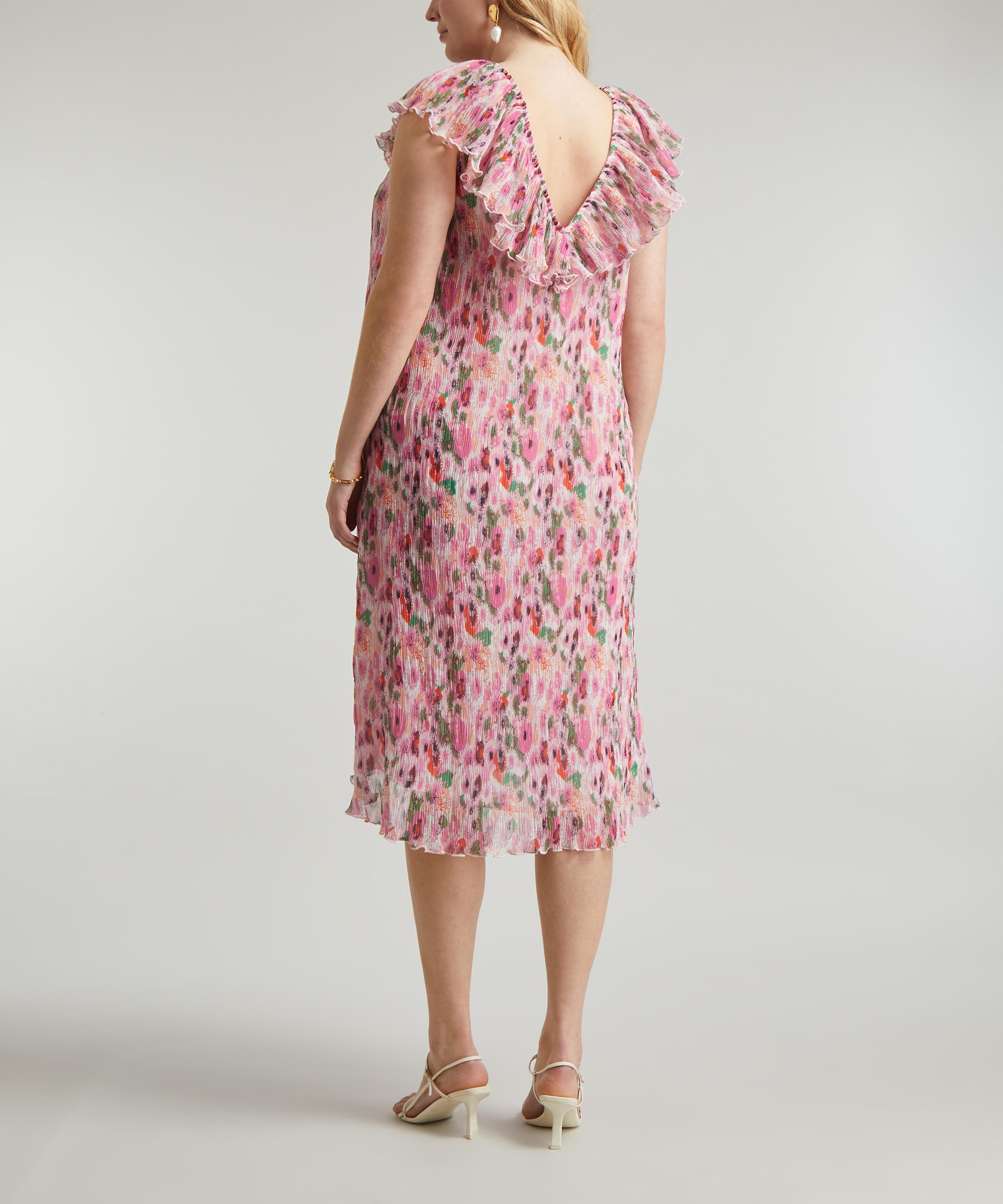 Effortlessly twee with its pink floral pattern, this pleated mini-dress from GANNI exudes elegance. Loose and lightweight in crinkle-pleated georgette crafted from 100% certified recycled polyester, its V-neckline is embellished with a ruffled edge at the front and back.