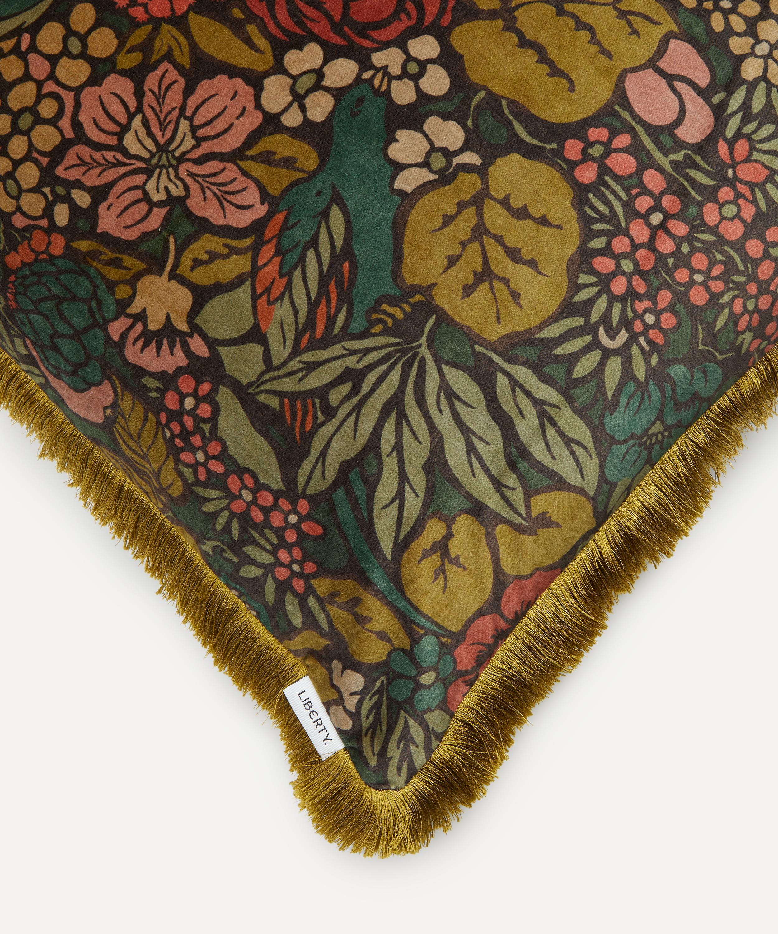 This Liberty square cushion features our Pomegranate Garden print and is decadently soft with a plump recycled duck feather filling. Created in the Liberty design studio, Pomegranate Garden – originally created in 1965 under the creative direction of former Design Director, Bernard Nevill, as part of the trendsetting ‘Lotus’ collections of the 1960s – appears here in a beautifully engineered iteration, complete with a fringed edge for an immaculate finish. The cushion’s classic silhouette and richly hued palette add an elegant twist to modern interiors.