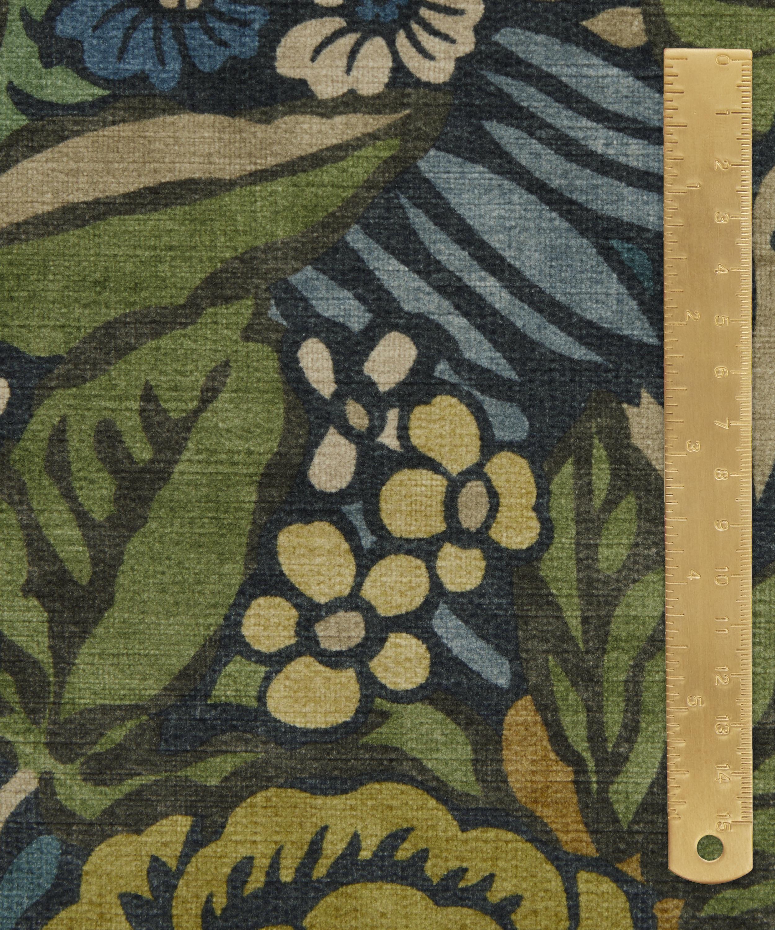 Pomegranate Garden was originally created in 1965 under the creative direction of former Design Director, Bernard Nevill, as part of the trendsetting ‘Lotus’ collections of the 1960s. Meticulously redrawn and reimagined into a stylised representation of a blossoming orchard, this eclectic pattern softens bold outlines with delicate textures. Camouflaged birds nestle amidst lush foliage, while roses, tulips, irises, and bluebells intertwine with vibrant accents of delectable fruits. Printed on Liberty’s signature velvet, this fabric is suitable for upholstery, drapery, cushions, and accessories.