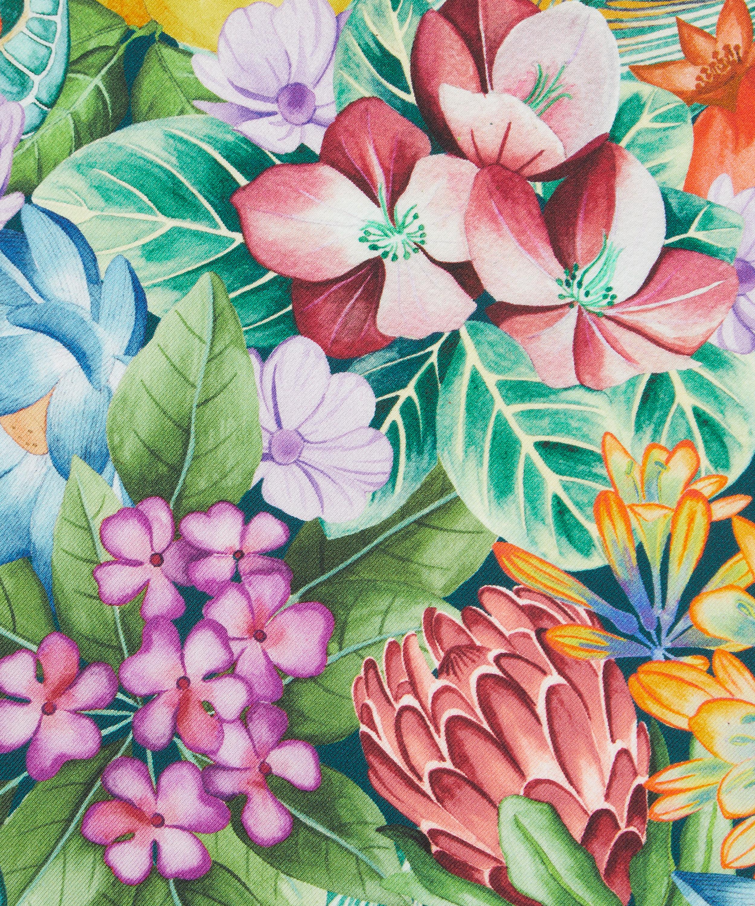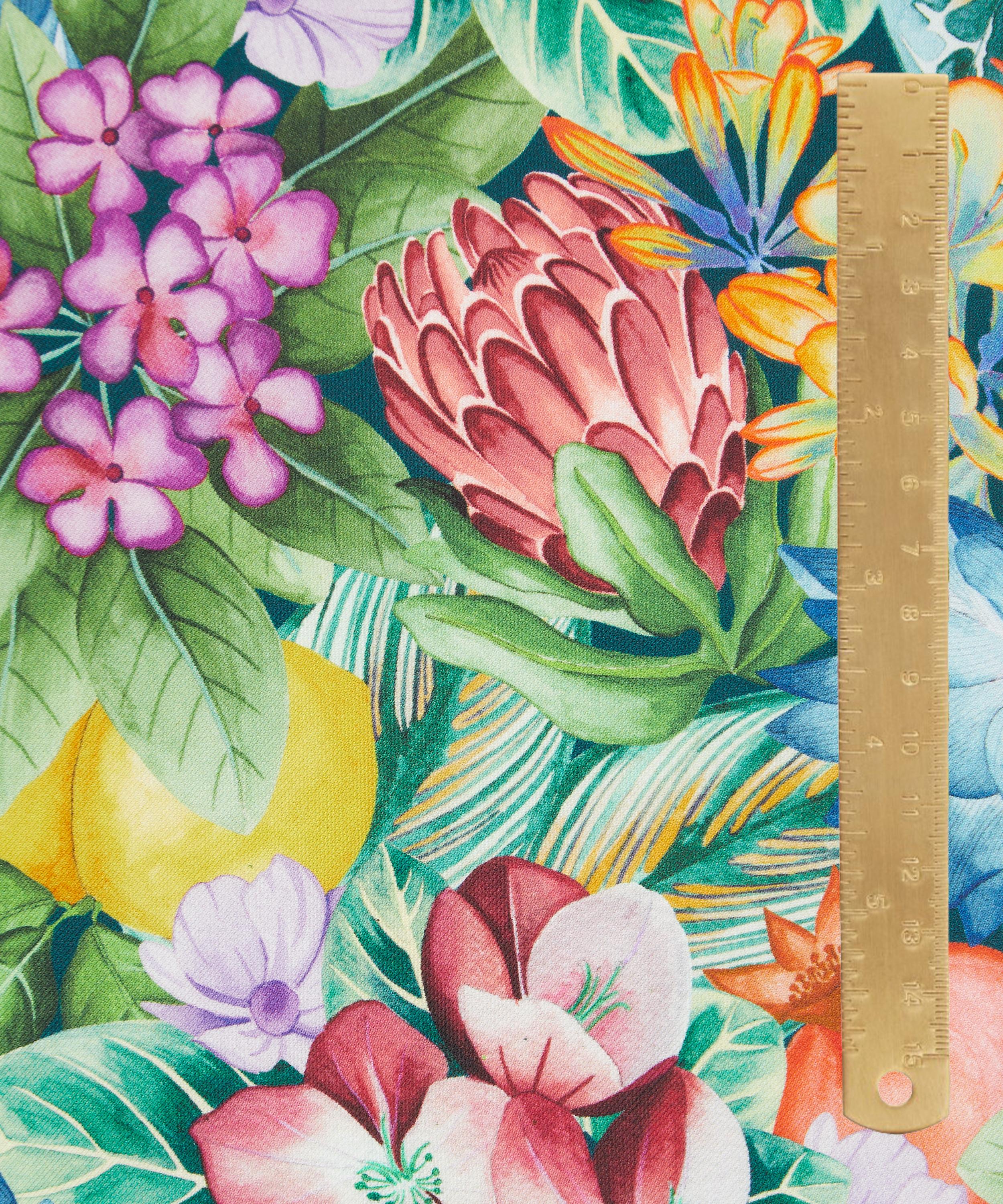 Poppy and Freddie was inspired by the extravagant costumes worn by Josephine Baker, a world-renowned performer, World War II spy, and activist. Hand-painted in the Liberty design studio using layers of watercolour, this tropical floral print showcases zesty fruits like pomegranates and lemons, alongside waterlilies and protea blooms, all nestled within dense foliage.