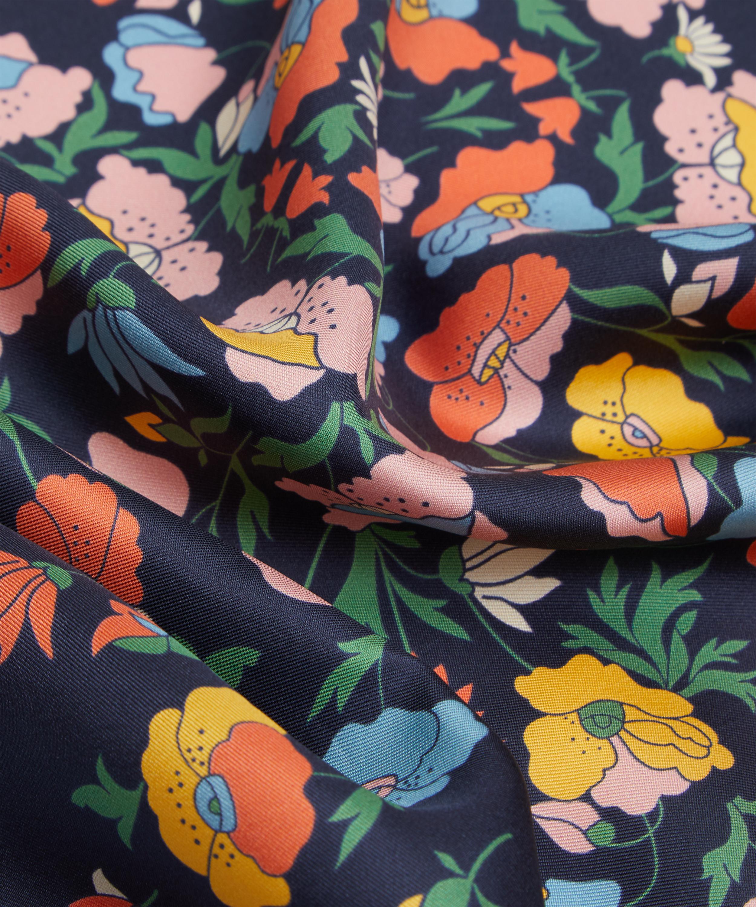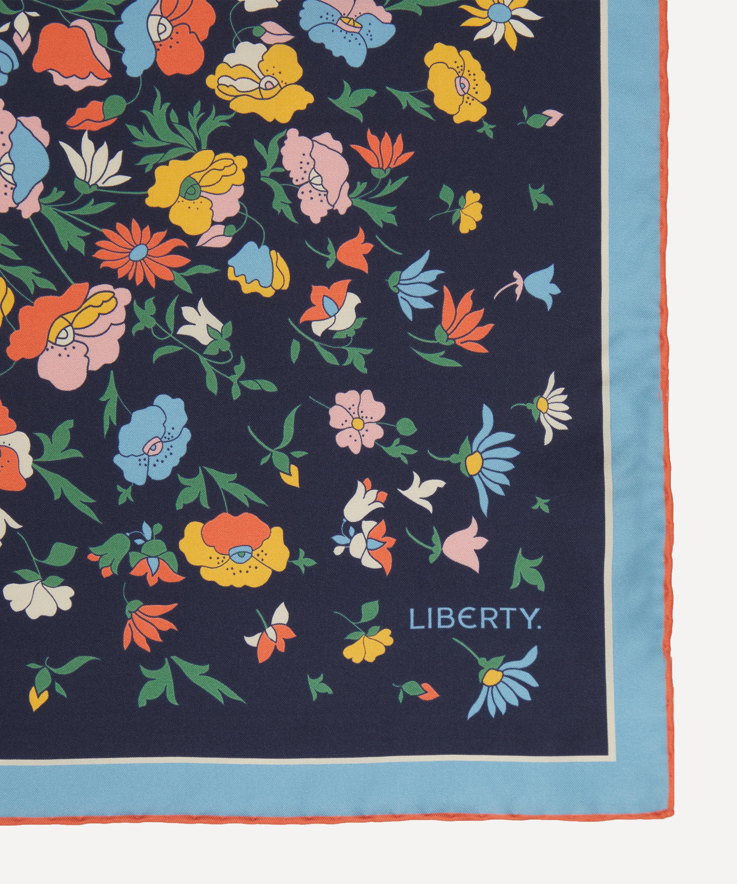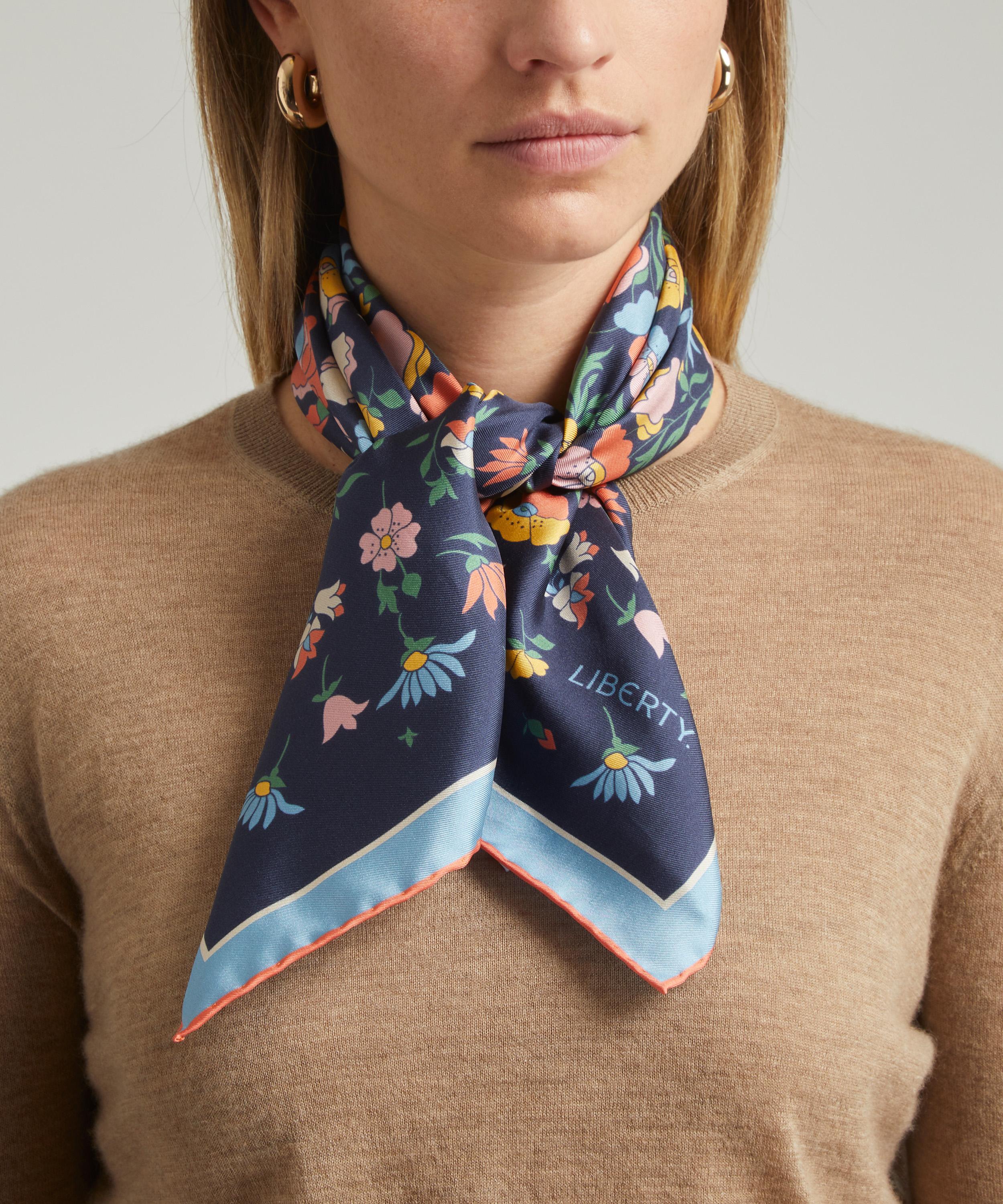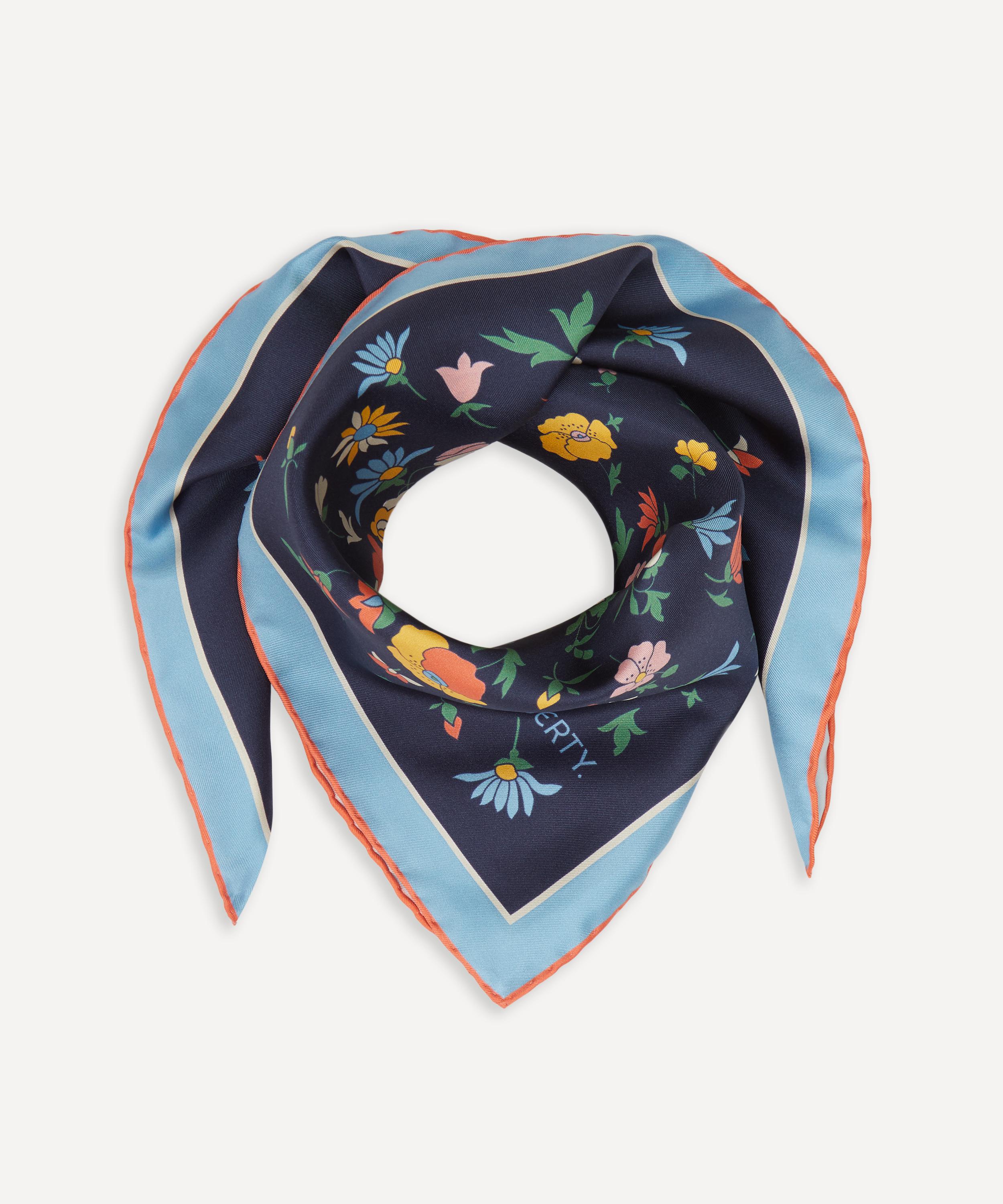 The Poppy Dawn scarf features a reimagined take on our iconic Poppy and Daisy print. Whether looped around your neck or the handles of a tote, a Liberty silk scarf is a heroine of versatile styling. New for this season, this scarf is printed with intricate florals in a geometric, mirror effect. Each print has been accented with fun colourful borders to add a sporty twist to a Liberty classic.