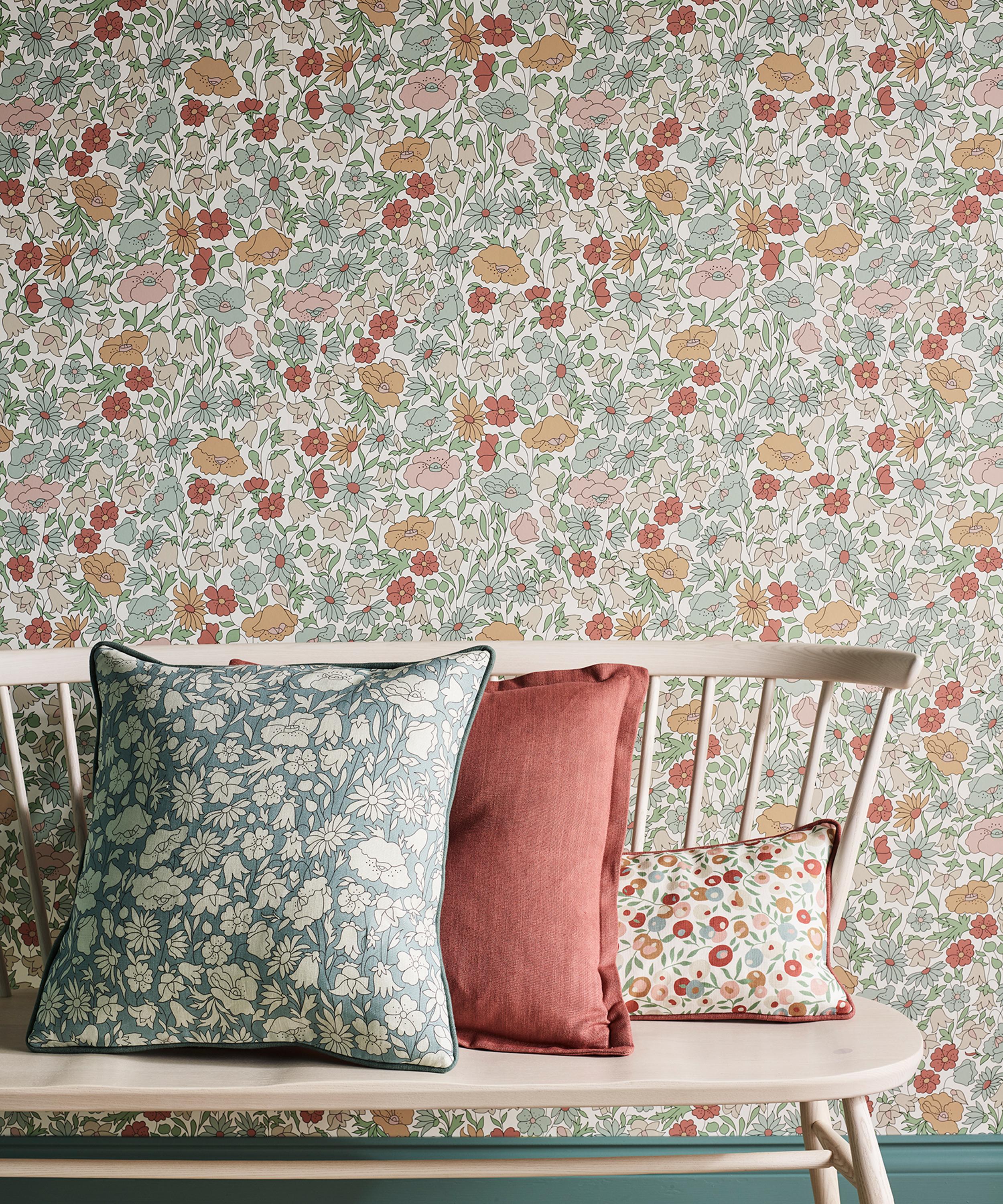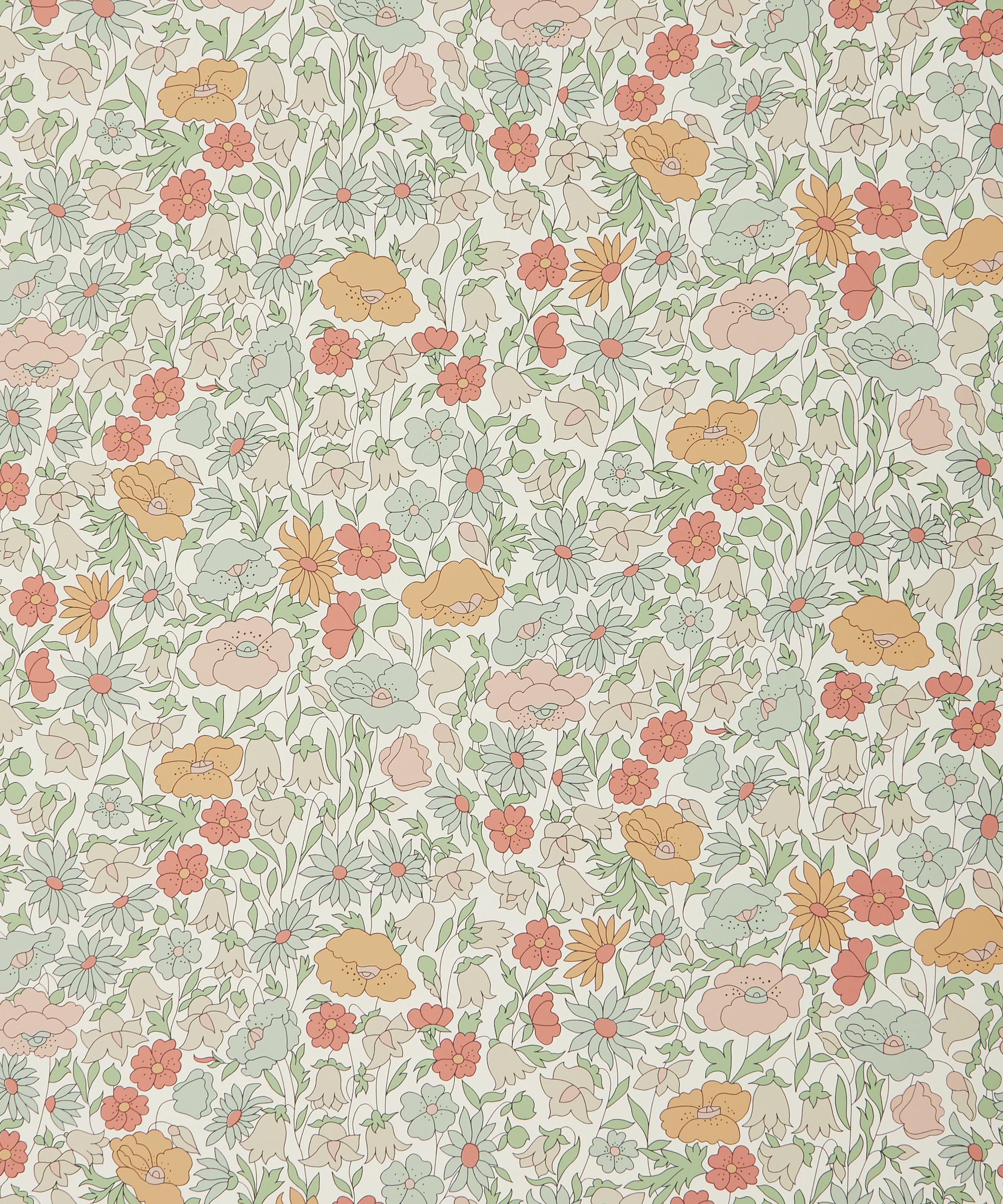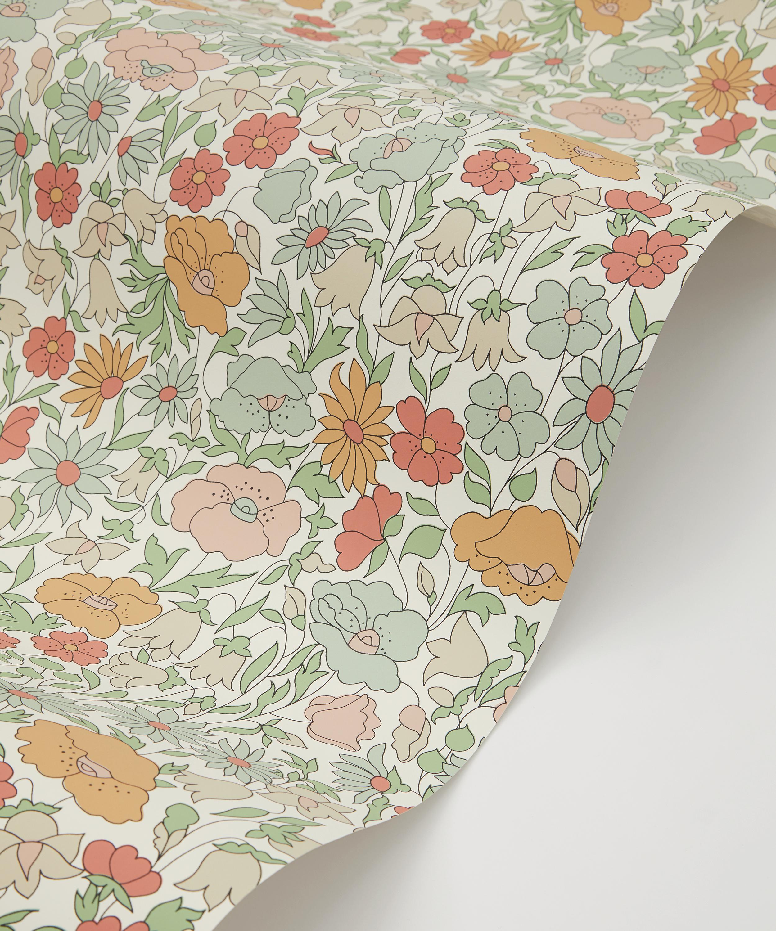 Poppy Meadowfield is a reworking of a much-loved archival print from 1910. Redrawn and rebalanced as a contemporary wallpaper design, the fine outlines and plains of solid colour mark this as an instantly recognisable Liberty floral. Design details are captured using a rotary printing technique, softly emulating the screen-printed look of the original. Different opacities of ink are layered to create richly coloured and textured effects in matte and lustred hues.