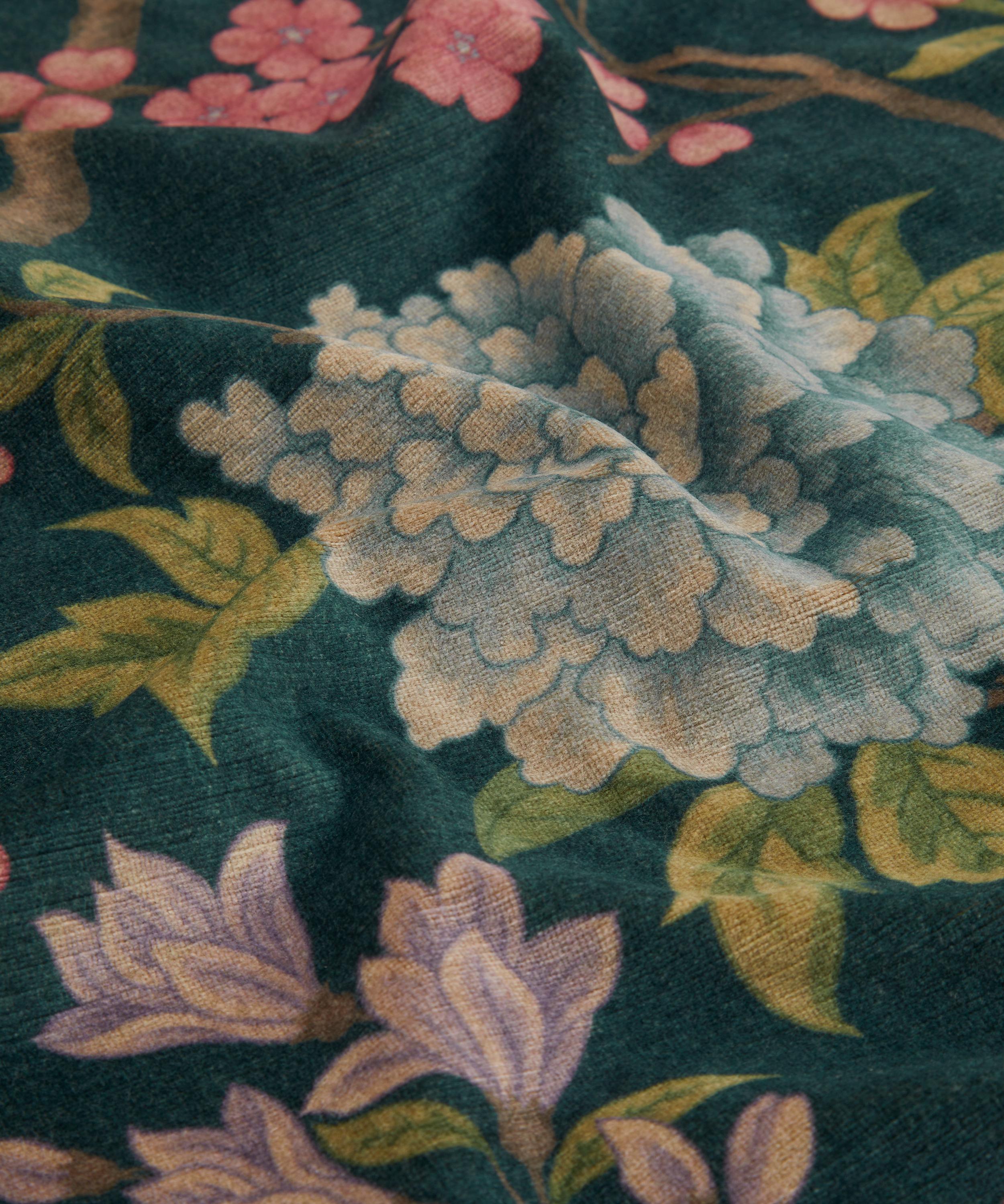 Exquisitely redrawn, resized, and recoloured, this ornate floral pattern is bathed in a beautiful soft light which accentuates the nuanced tones and textures of the design. Its winding branches are dotted with blossom flowers and spectacular chrysanthemums, combining directional design, artistry, and innovation. Printed on a rich sumptuous velvet, Porcelain Trail is perfect for upholstery, drapery, cushions, and accessories.