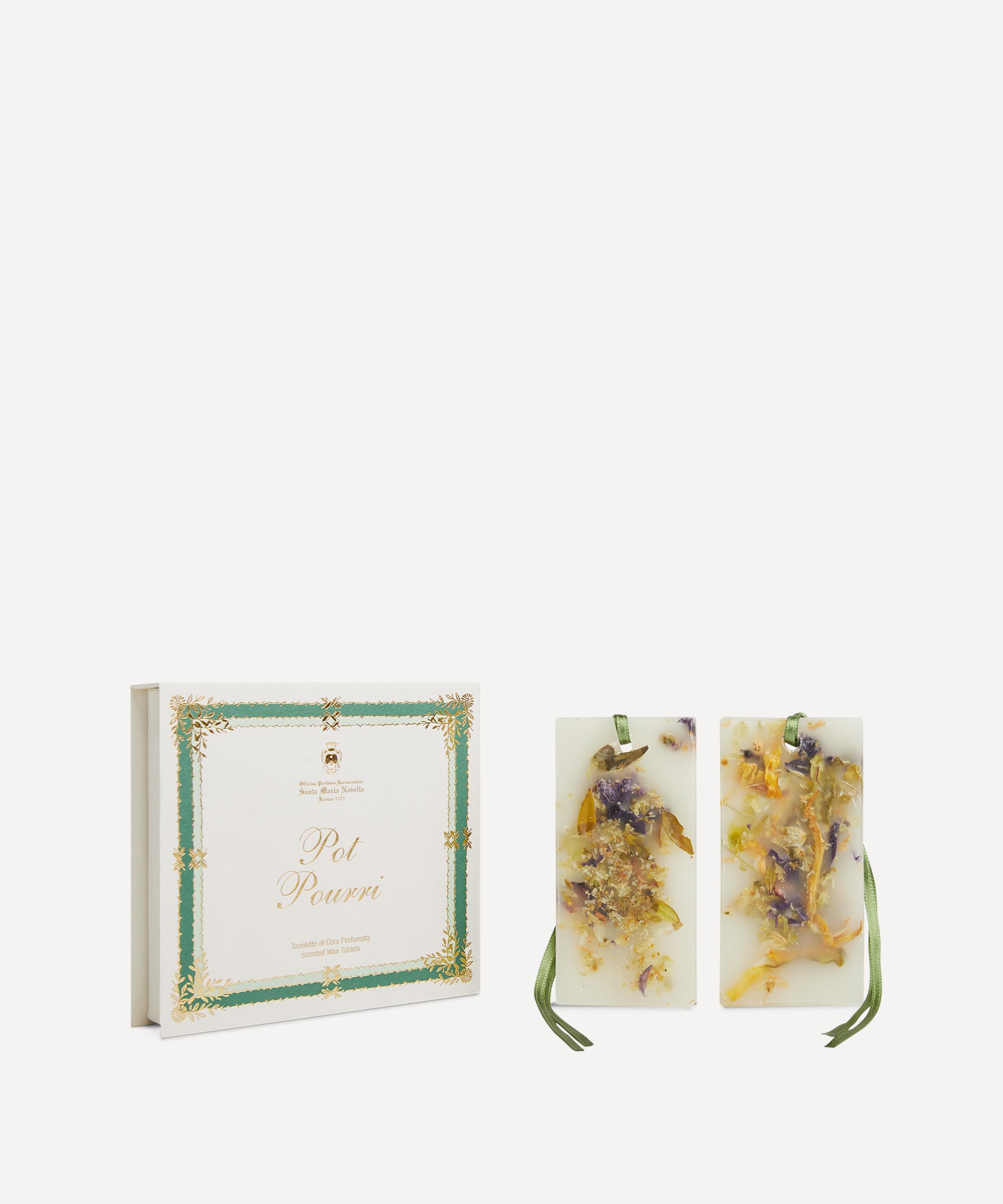 Poised to elevate any domestic space with a dose of luxury fragrance, the Pot Pourri scented wax tablets by Officina Profumo-Farmaceutica di Santa Maria Novella are set to transport you to the enchantingly beautiful Tuscan hills. Hand made in Florence and cast with myrtle leaves and berries, sunflower and cornflower petals, these multi-use tablets diffuse a poetic scent, inspired by over eight centuries of tradition, that recalls the aromas of buds, leaves and flower petals native to the Italian landscape.