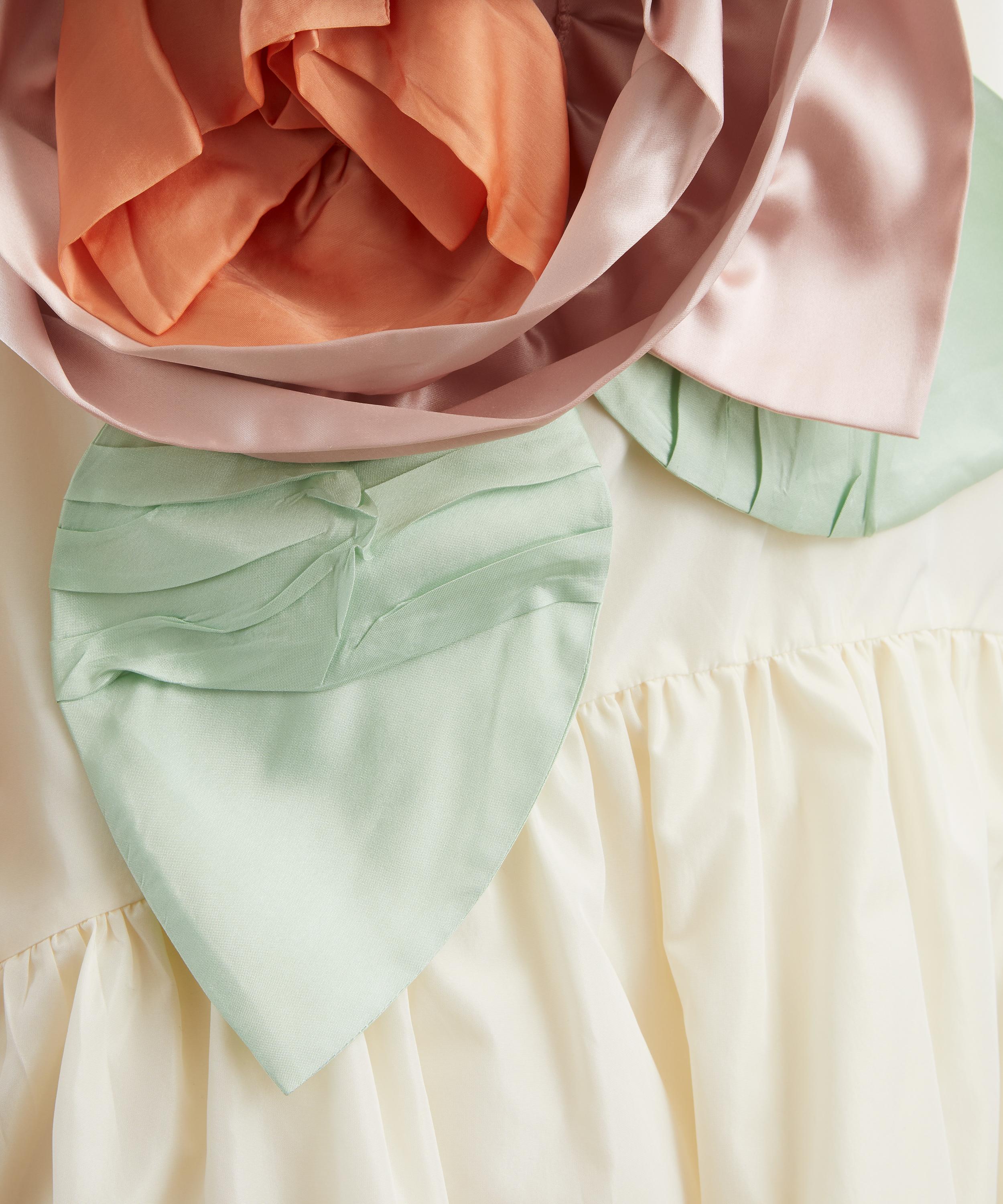 Cut from lightweight cream taffeta, this mini dress exudes effortless elegance with a tilted neckline, dropped waist, and a voluminous skirt finished with a scalloped hem. An oversized rosette appliqué at the side boldly captures the season’s spirit of playful excess.