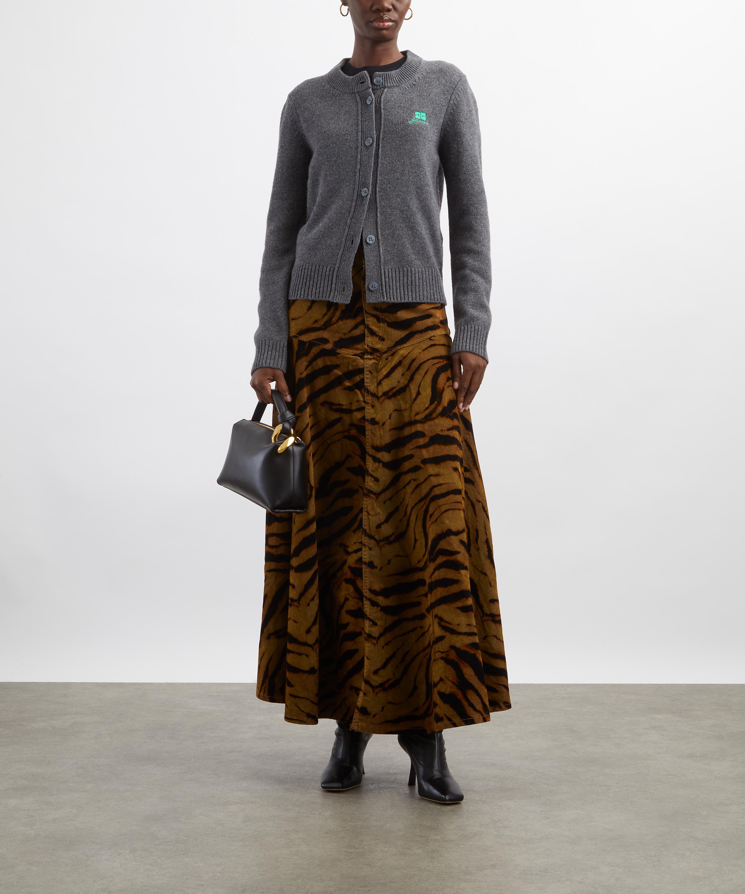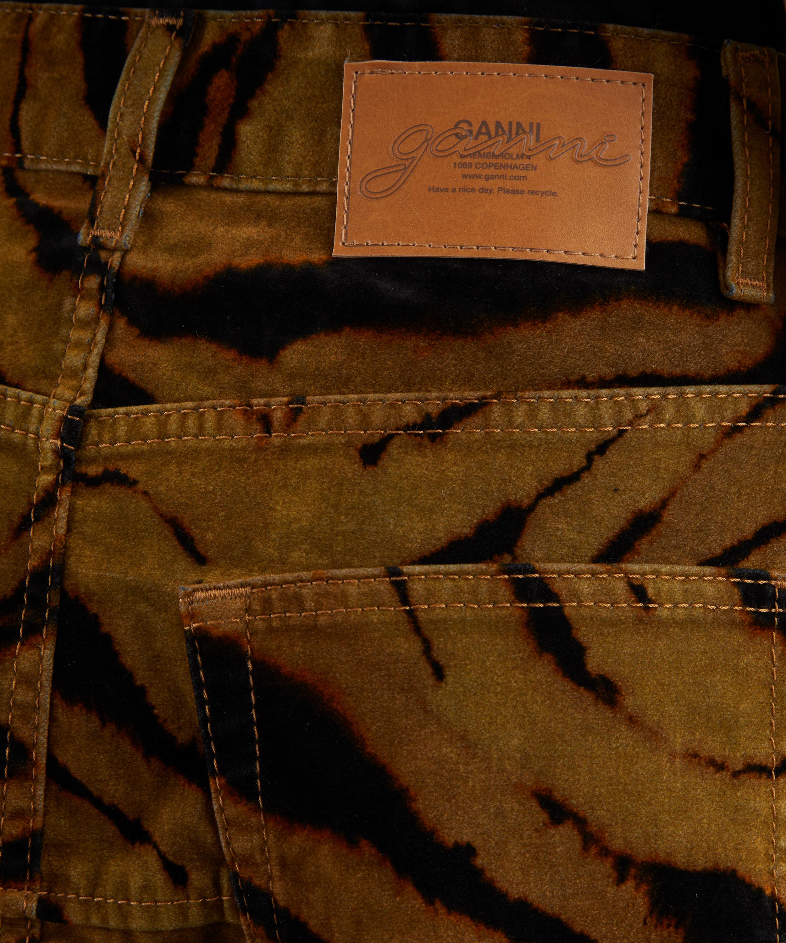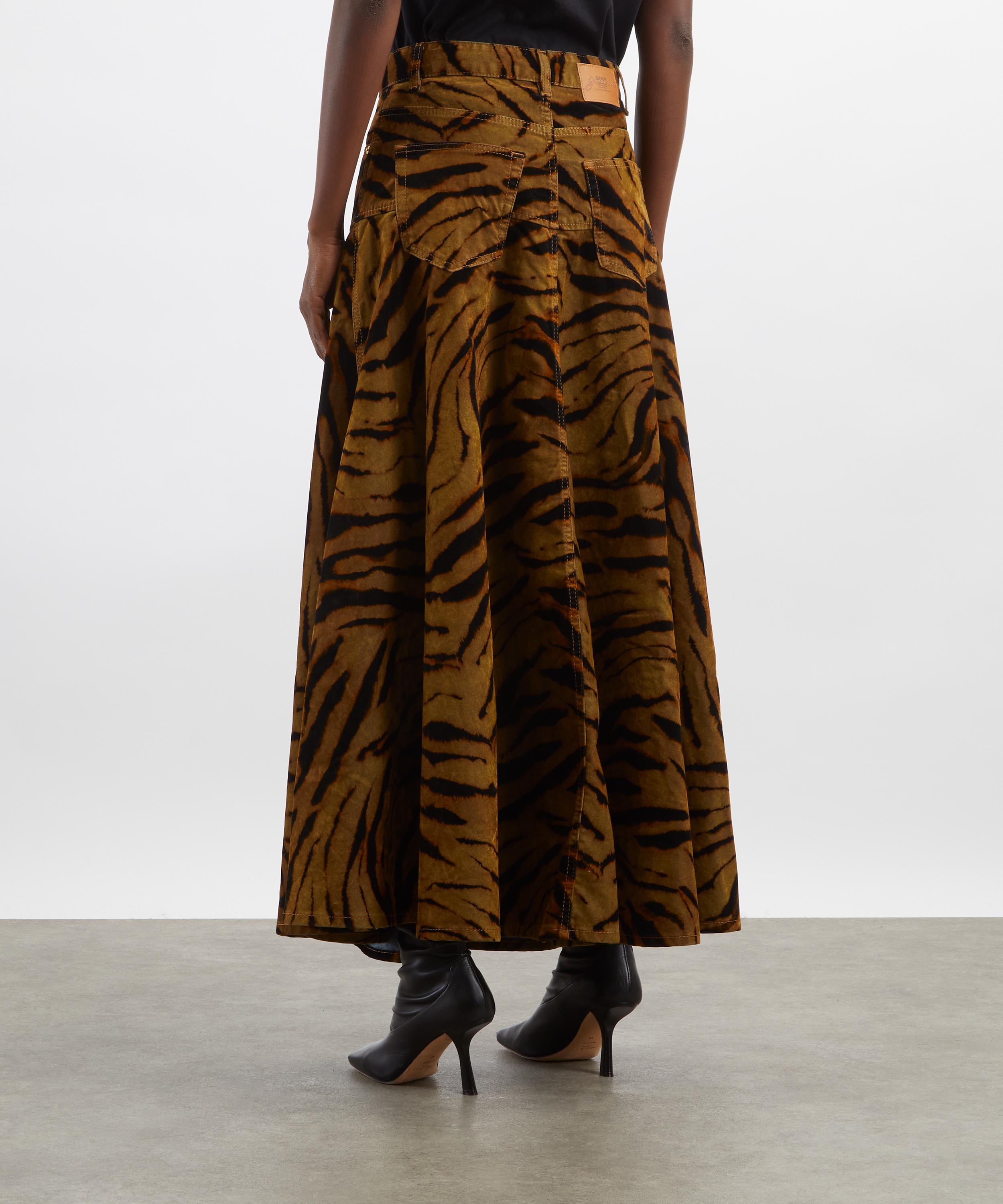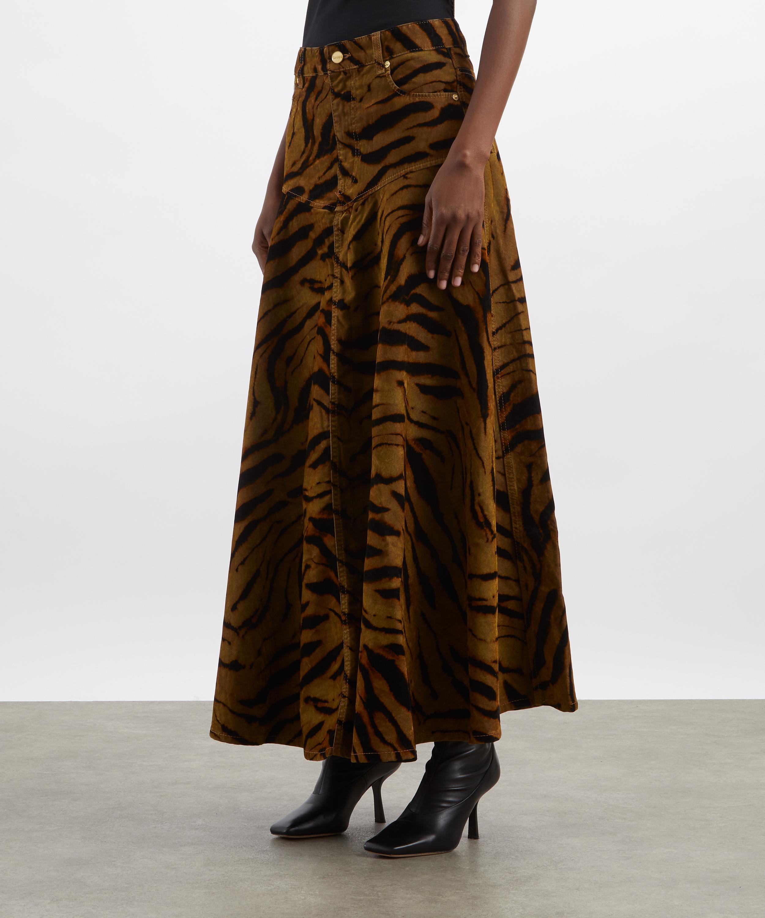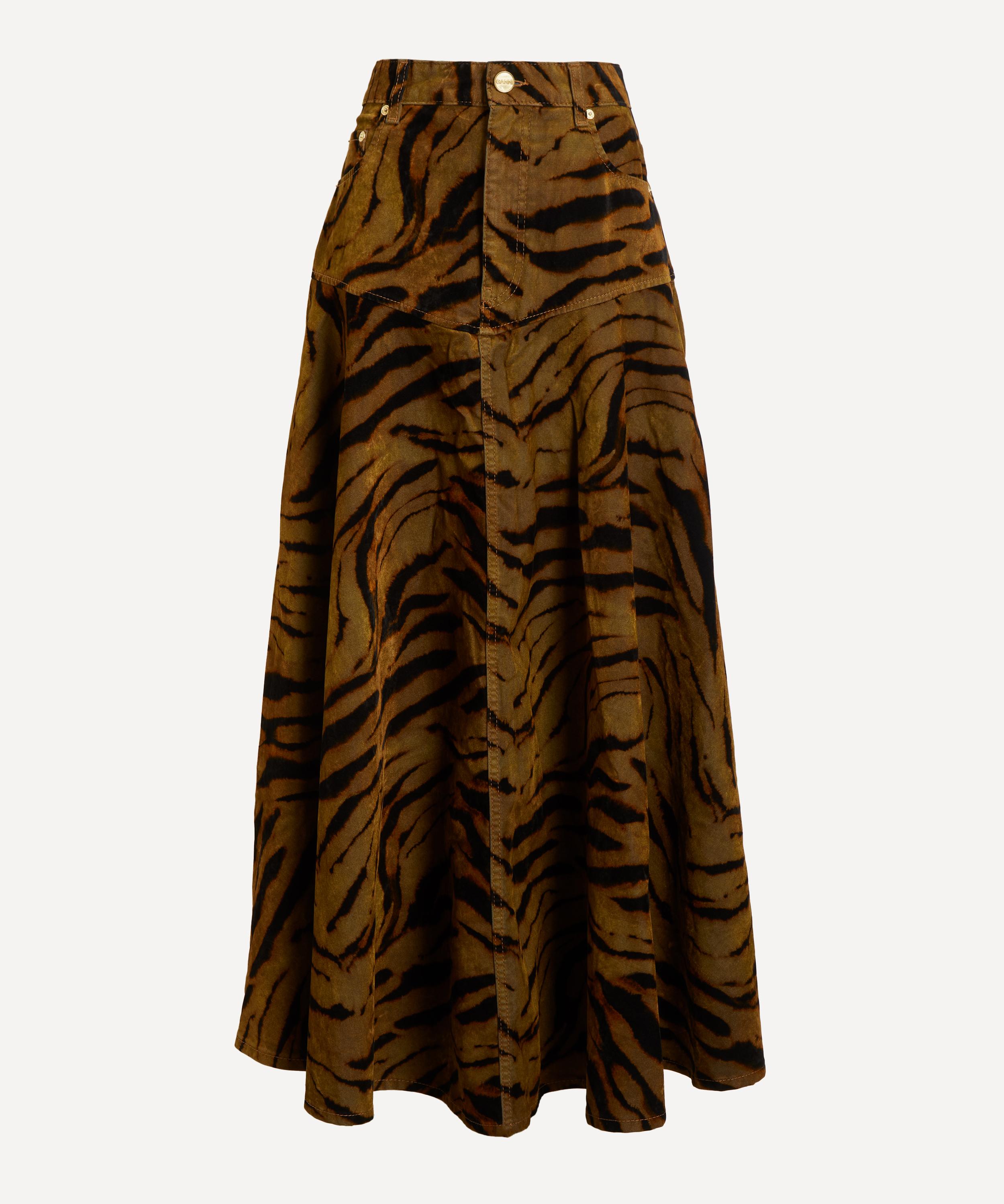 Crafted from velvety flocked denim with bold tiger stripes, this maxi skirt features a flattering A-line silhouette that falls to a breezy ankle length. Classic five-pocket styling and a logo-embossed jacron patch at the back lend a signature denim-inspired finish.