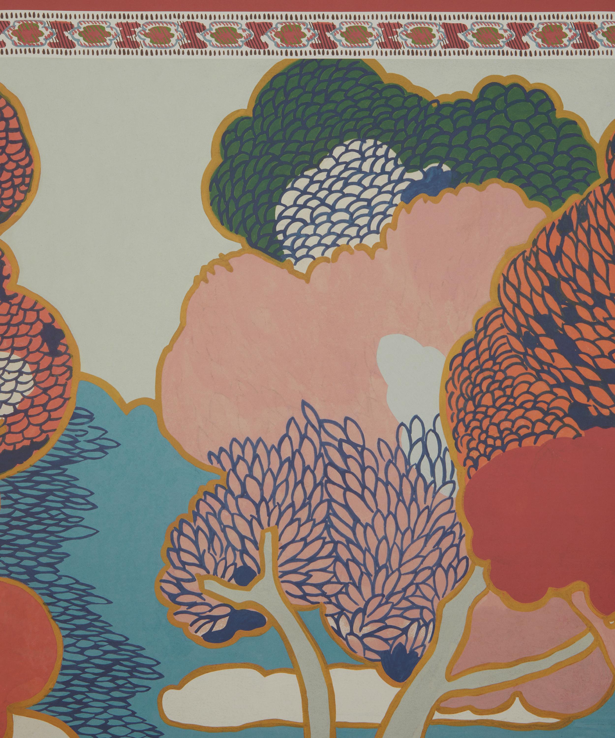 Reimagined on a grand scale, this life-size interpretation of Liberty’s beloved classic Prospect Road offers a striking new perspective, while staying true to Bernard Nevill’s original 1968 scarf design. Meticulously restored in the London studio in two contrasting colourways and printed on a matt paper, Prospect Mural pays tribute to the design house’s 1960s revival of traditional Art Nouveau-style landscapes. A vivid panorama unfolds as stylised trees, graphic meadows, and drifting clouds shift in perspective, all framed by alternating floral and paisley borders.p>