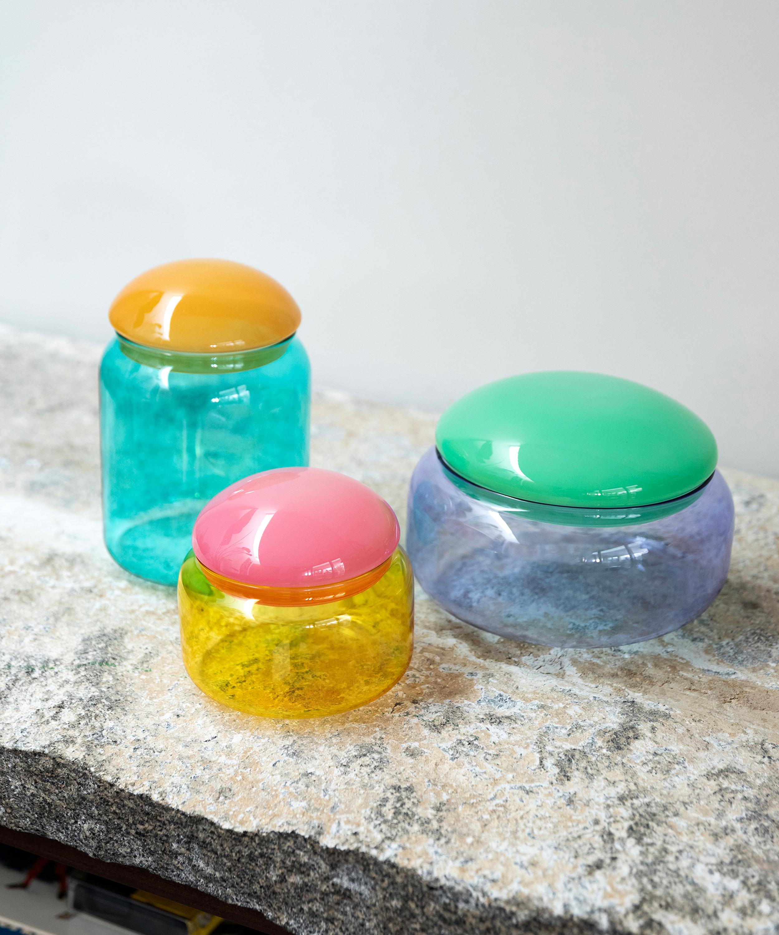 Enhance eclectic interiors with the Puffy jar from &Klevering. Skilfully formed with precision and care from delicate, coloured glass, it features a smooth, puffy silhouette in a multi, contrasting colourway to give it a unique look. Endlessly versatile, use it to store a myriad of small trinkets whilst livening up your space.